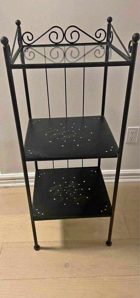 Sturdy black metal shelf with glass top and two metal shelves. Perfect for plants, bathroom storage, or as an accent table. Good condition (see photos). Dimensions (approx): Height: 34” Width: 14” Depth: 11”
