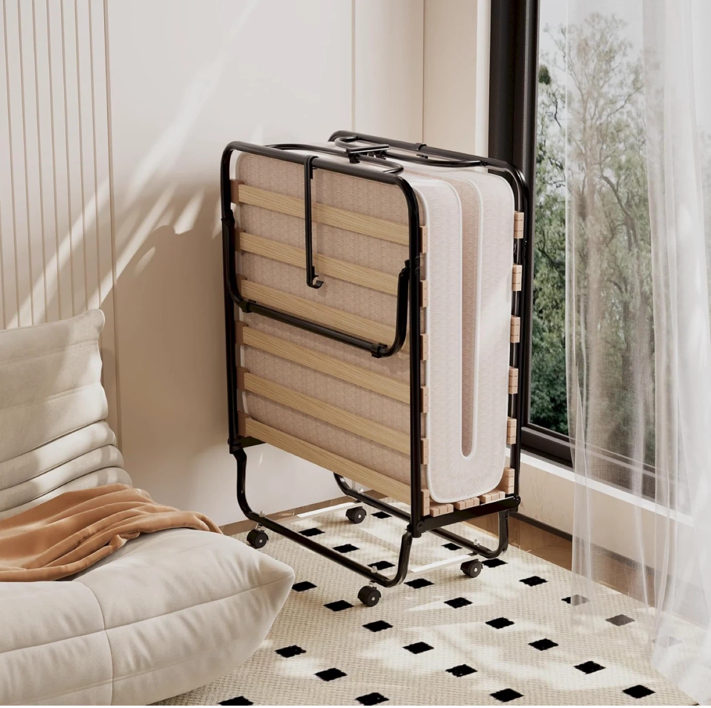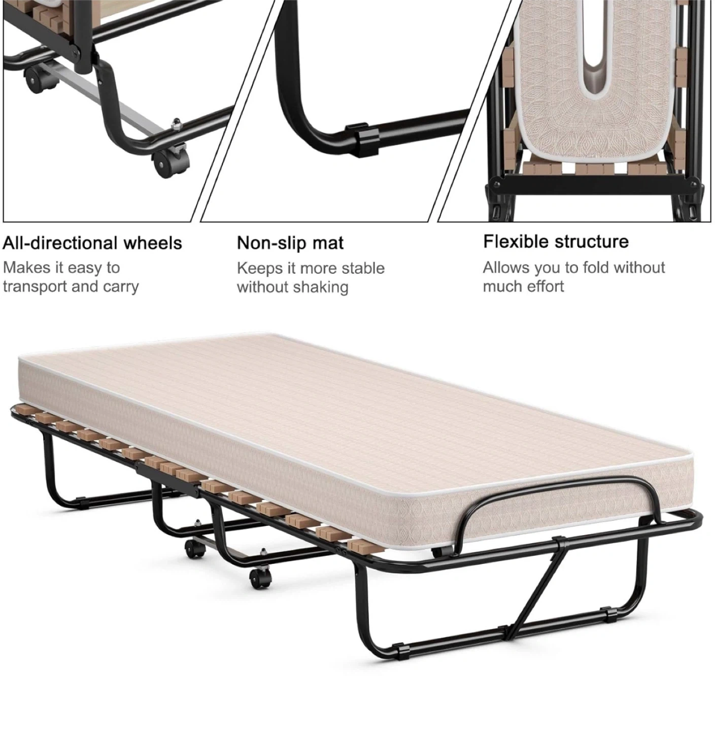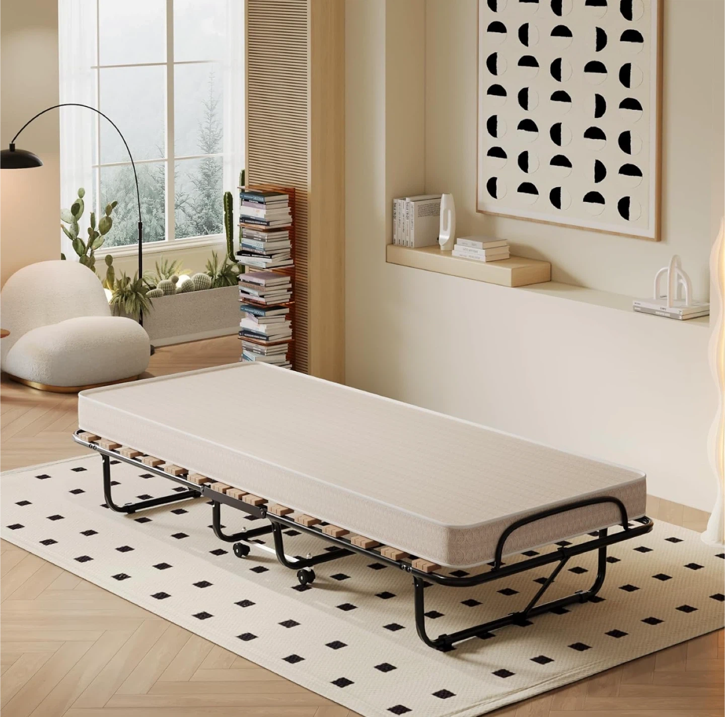 Selling a Giantex folding bed with a 4-inch memory foam mattress! It's perfect as a guest bed and easy to store. The dimensions are 31.5" x 75" when open and 31.5" x 13" x 41.5" when folded. I bought this for $279.99
