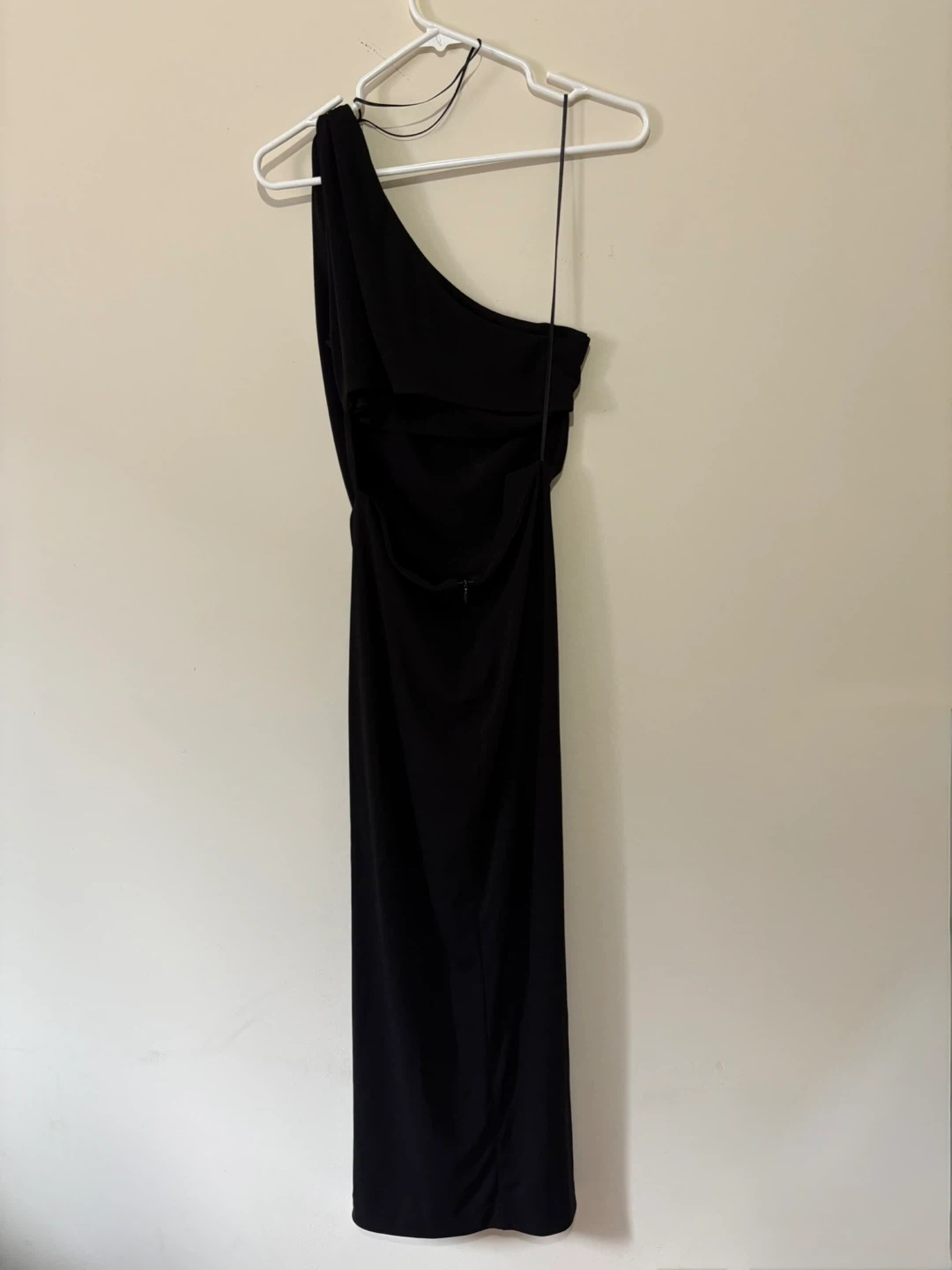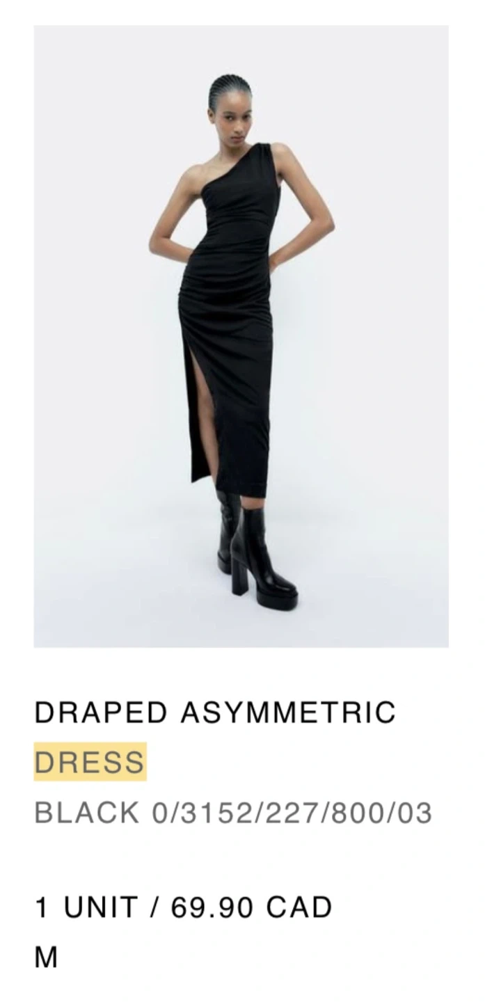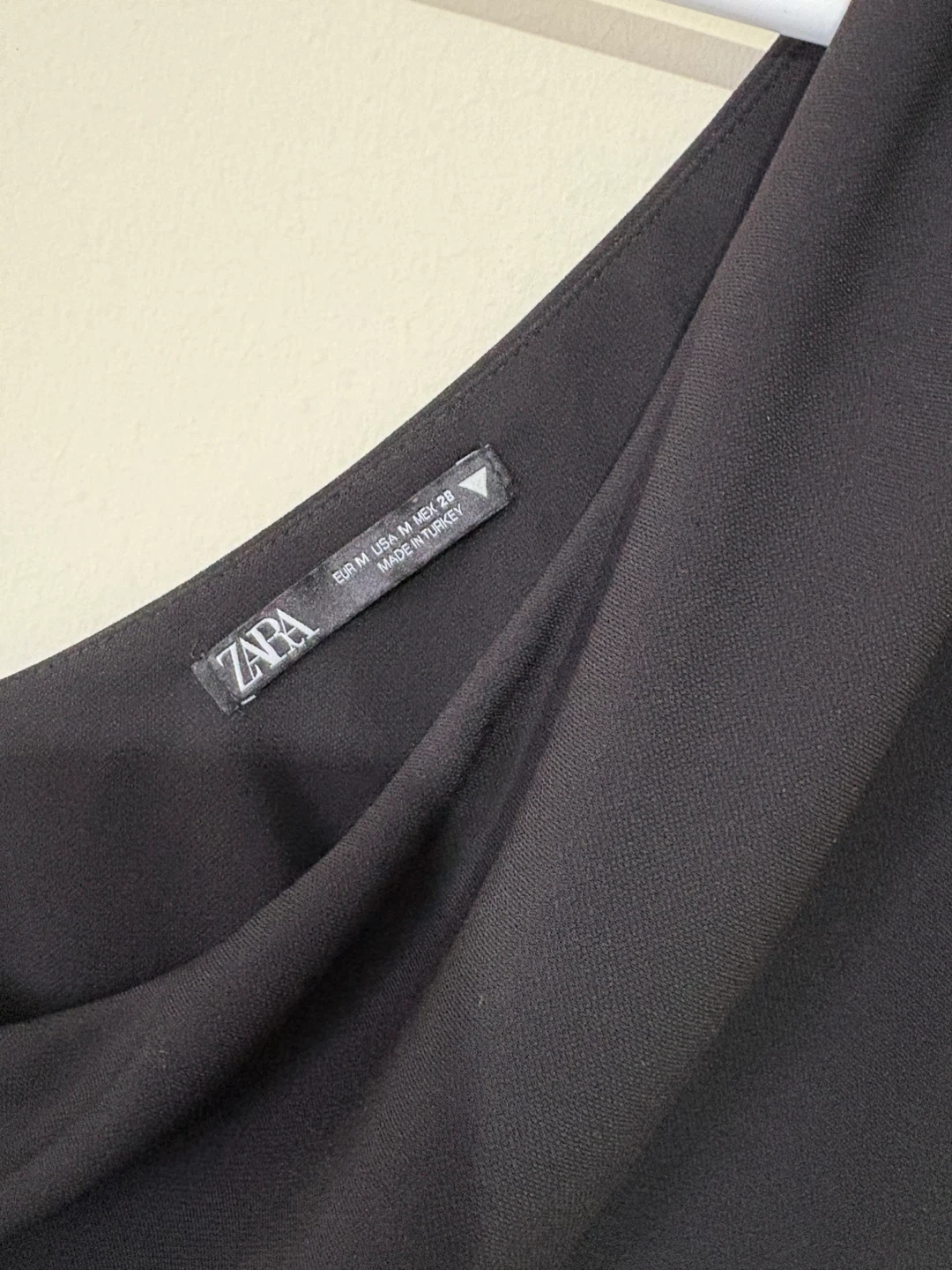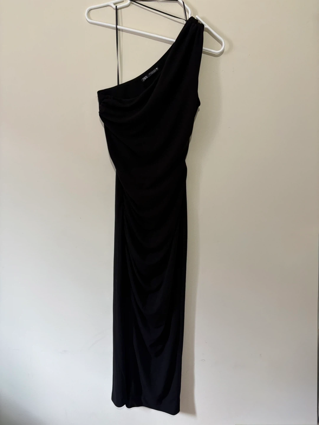 Selling a Used Zara draped asymmetric dress in black, size medium. It's in great condition and perfect for a night out! The dress features a one-shoulder design and flattering draping. Originally bought for $69.90 CAD