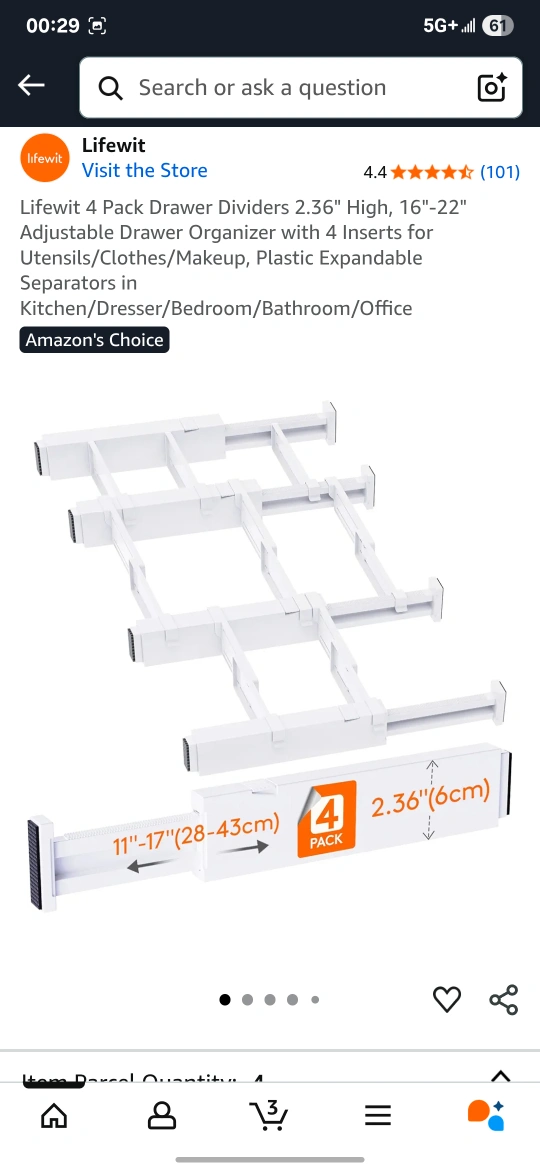 I'm selling a brand new Lifewit 4-pack of adjustable drawer dividers! These dividers are 2.36" high and can adjust to fit drawers from 16" to 22". They're perfect for organizing utensils, clothes, makeup, and more in your kitchen, dresser, bedroom, bathroom, or office. The box is included!