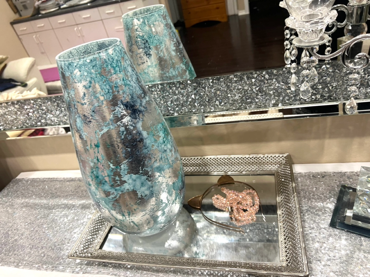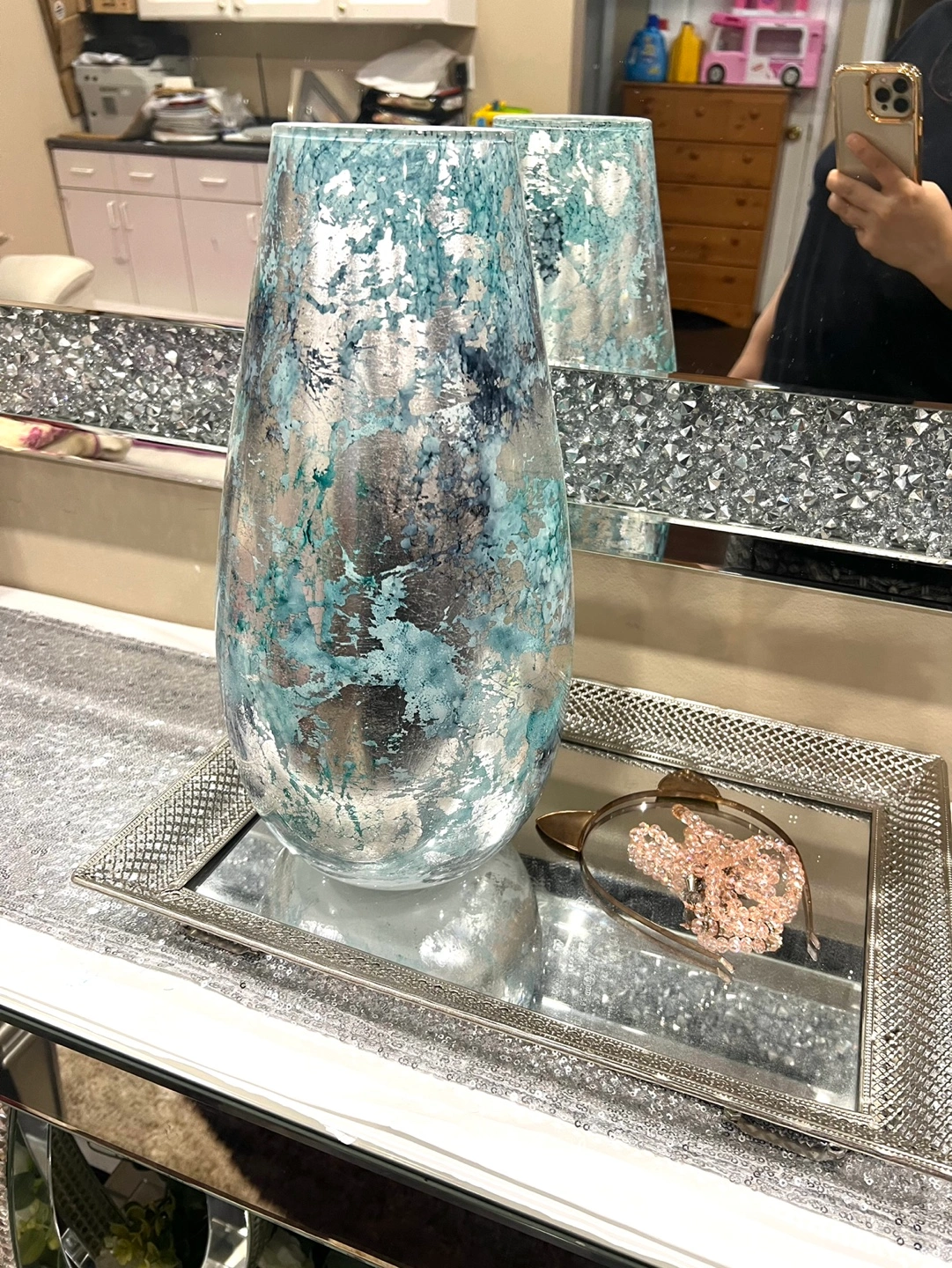 Add a touch of elegance to your home with this beautiful decorative vase! The silver and teal glass design is sure to catch the eye and complement any decor. Perfect for displaying flowers or as a standalone piece