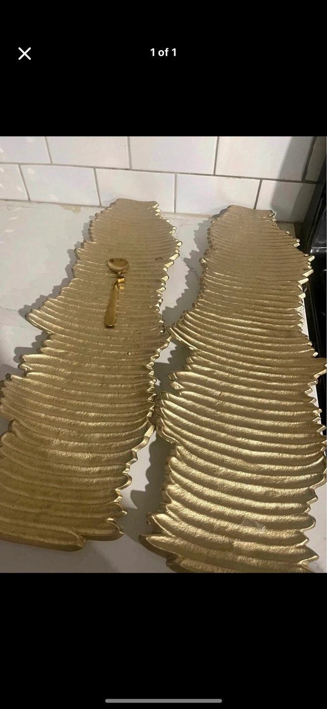 Selling a set of two decorative leaf-shaped trays in a lovely gold colour. They're perfect for adding a touch of elegance to your home decor. Great for serving or displaying items!