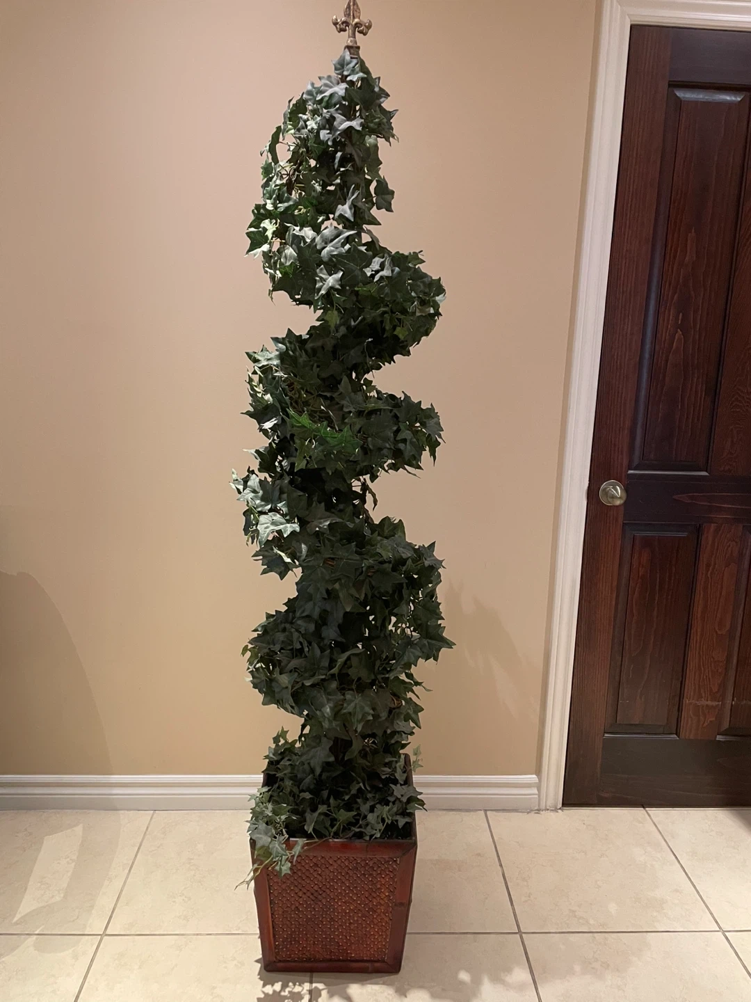 This is a charming artificial ivy topiary tree, perfect for adding a touch of greenery to your home! The tree features a spiral design and comes in a decorative wood pot. It's in good condition and ready to brighten up any space. Length: 76.5 in Box/Pot: length 13 in Width 13 in each sides