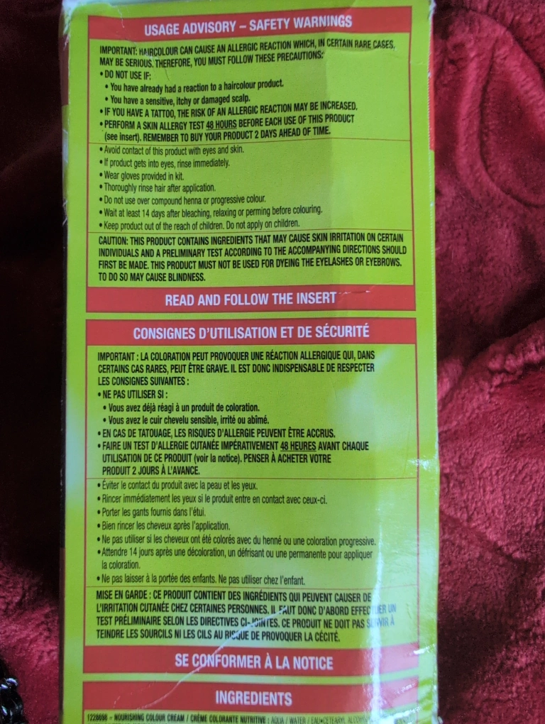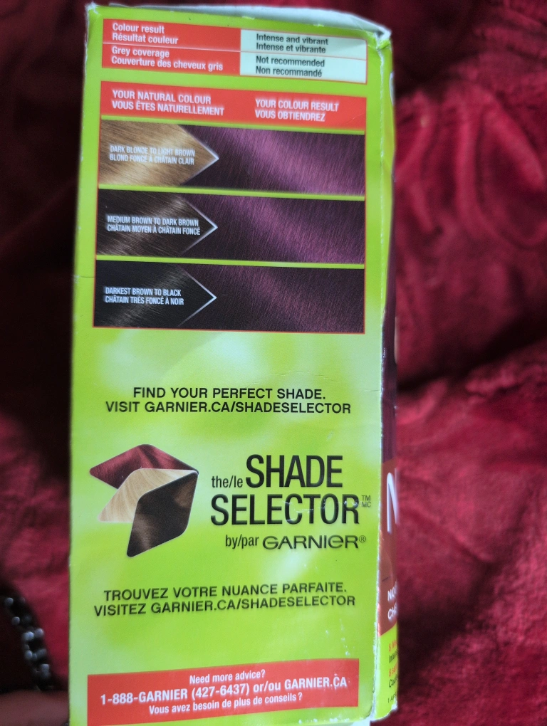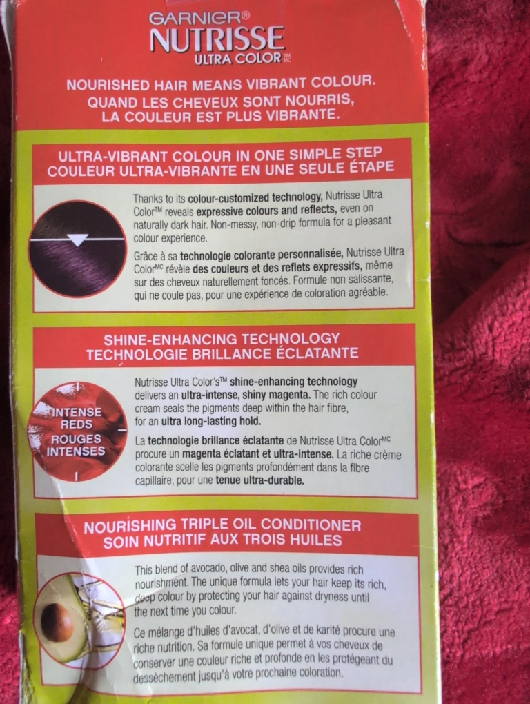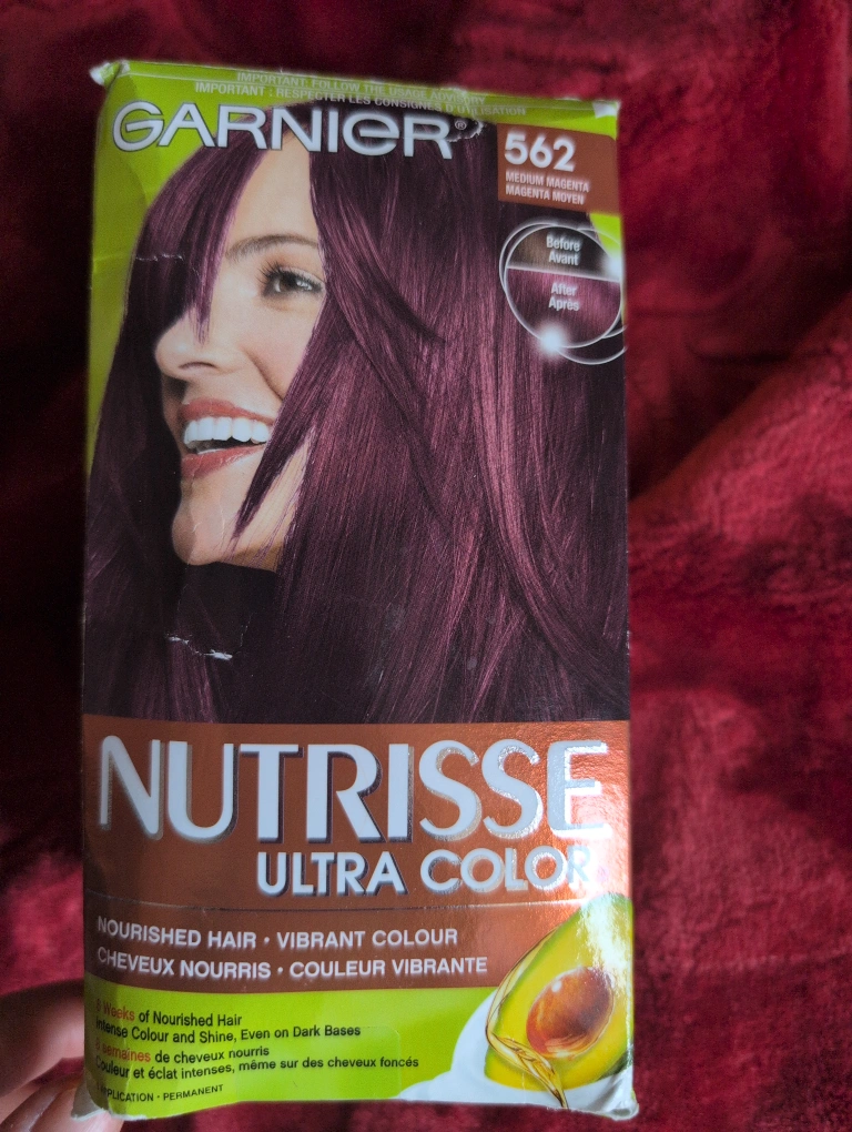 Get vibrant hair with Garnier Nutrisse Ultra Color! This is shade 562, Medium Magenta. It's a nourishing hair colour with triple oil conditioner for intense shine and long-lasting hold. The unique formula keeps your hair rich, deep in colour by protecting your hair against dryness until the next time you colour. Box has been damaged from being in storage. I stopped using box color so I don't need it anymore.