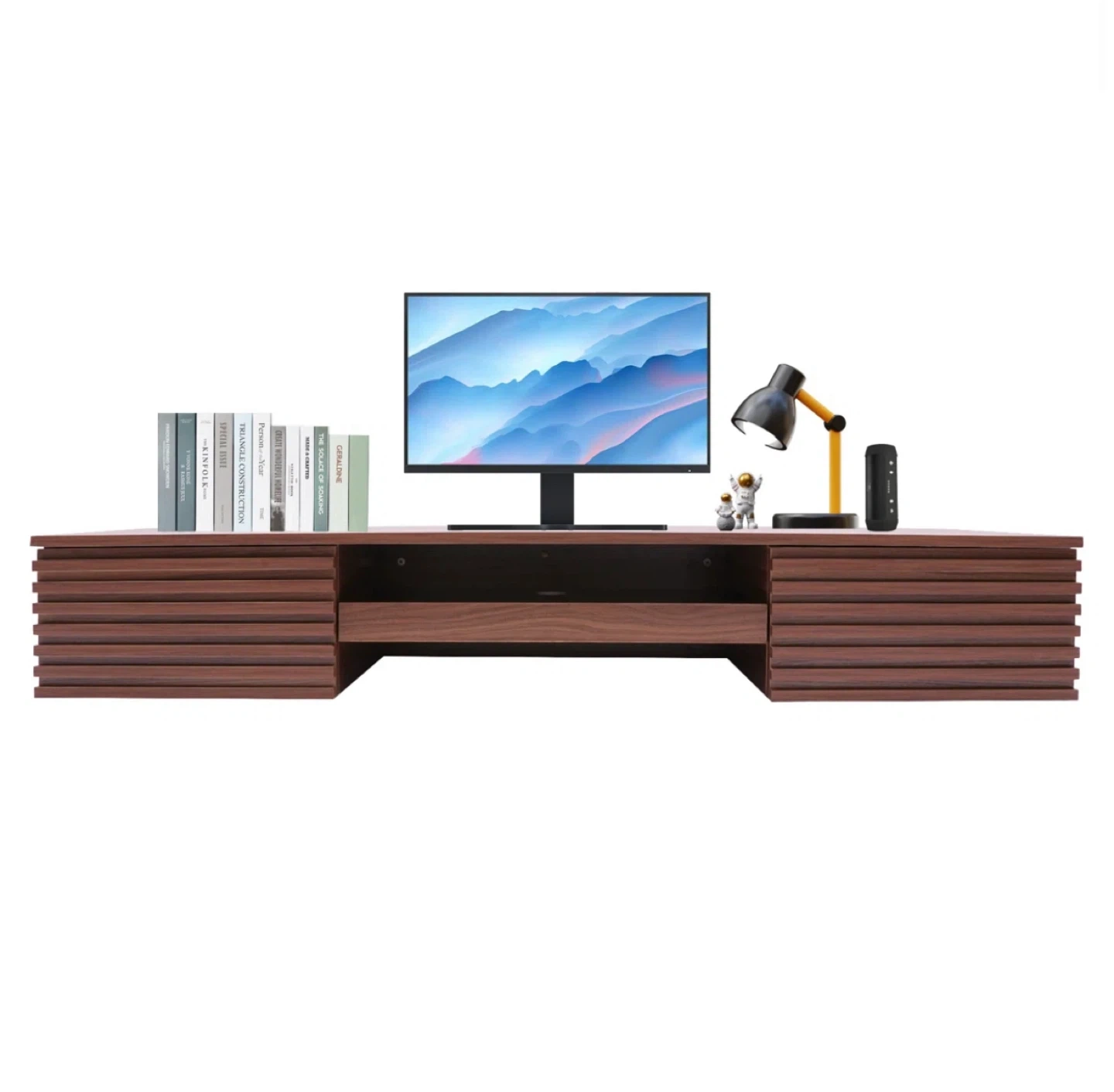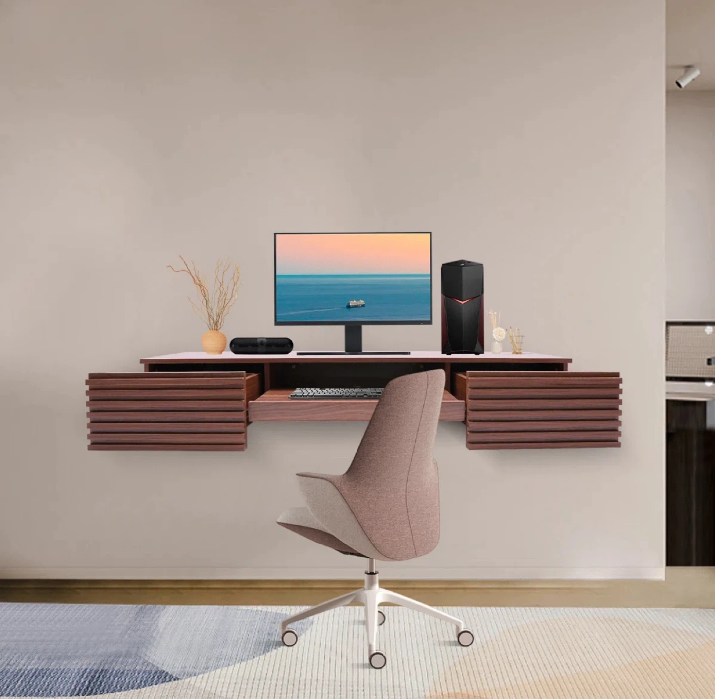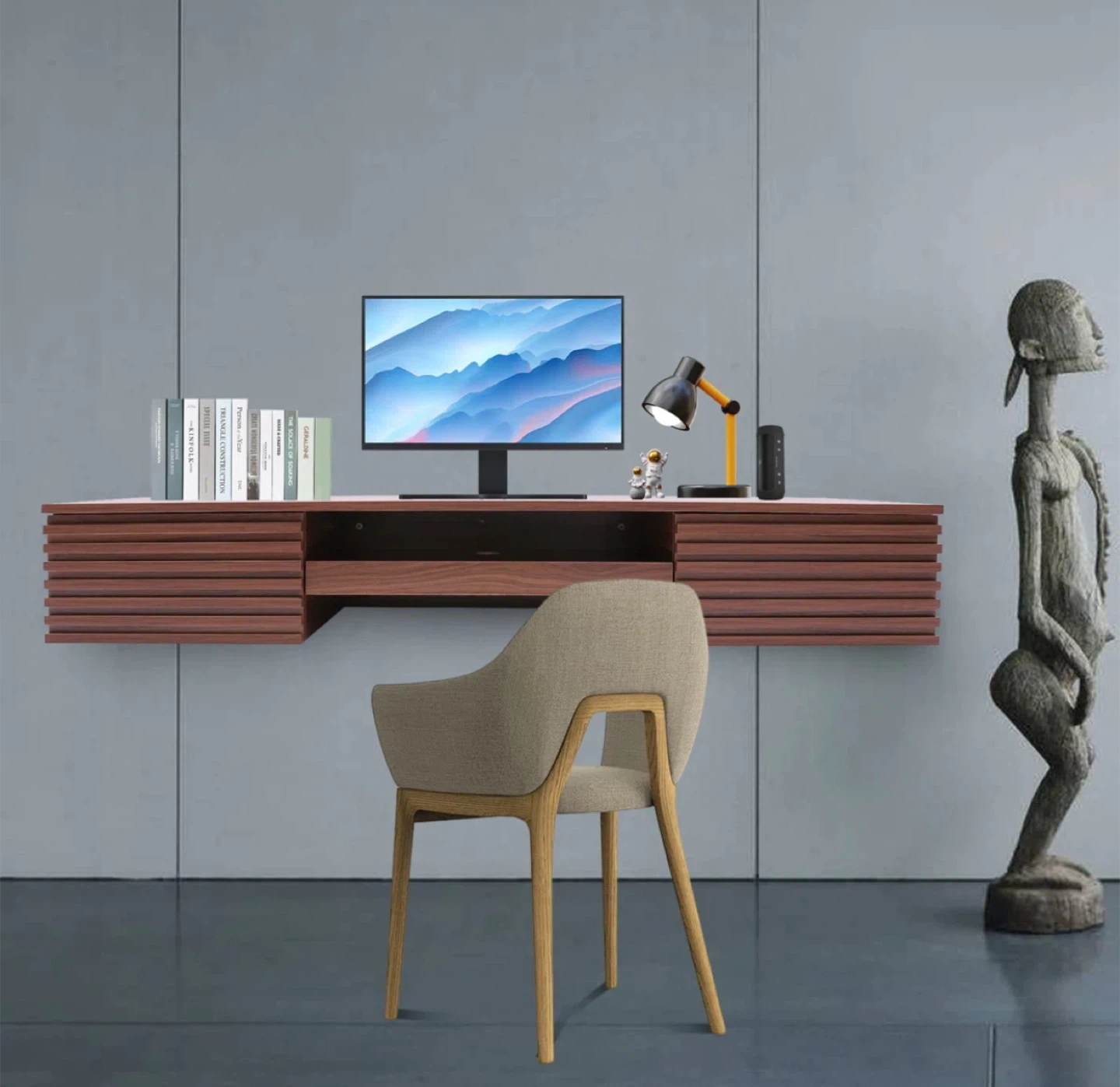 Looking to add a sleek and modern touch to your home office? This floating wall-mounted desk could be just what you need! It features a beautiful brown wood finish and a unique design that saves space while providing ample workspace. The desk includes drawers for storage, helping you keep your area organized and clutter-free. It's perfect for small spaces or anyone who appreciates minimalist design