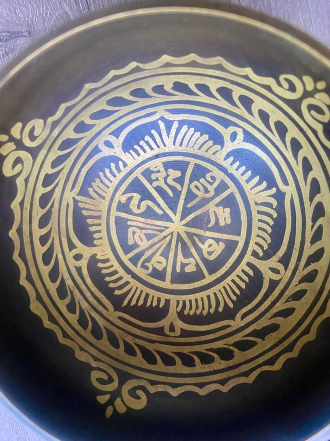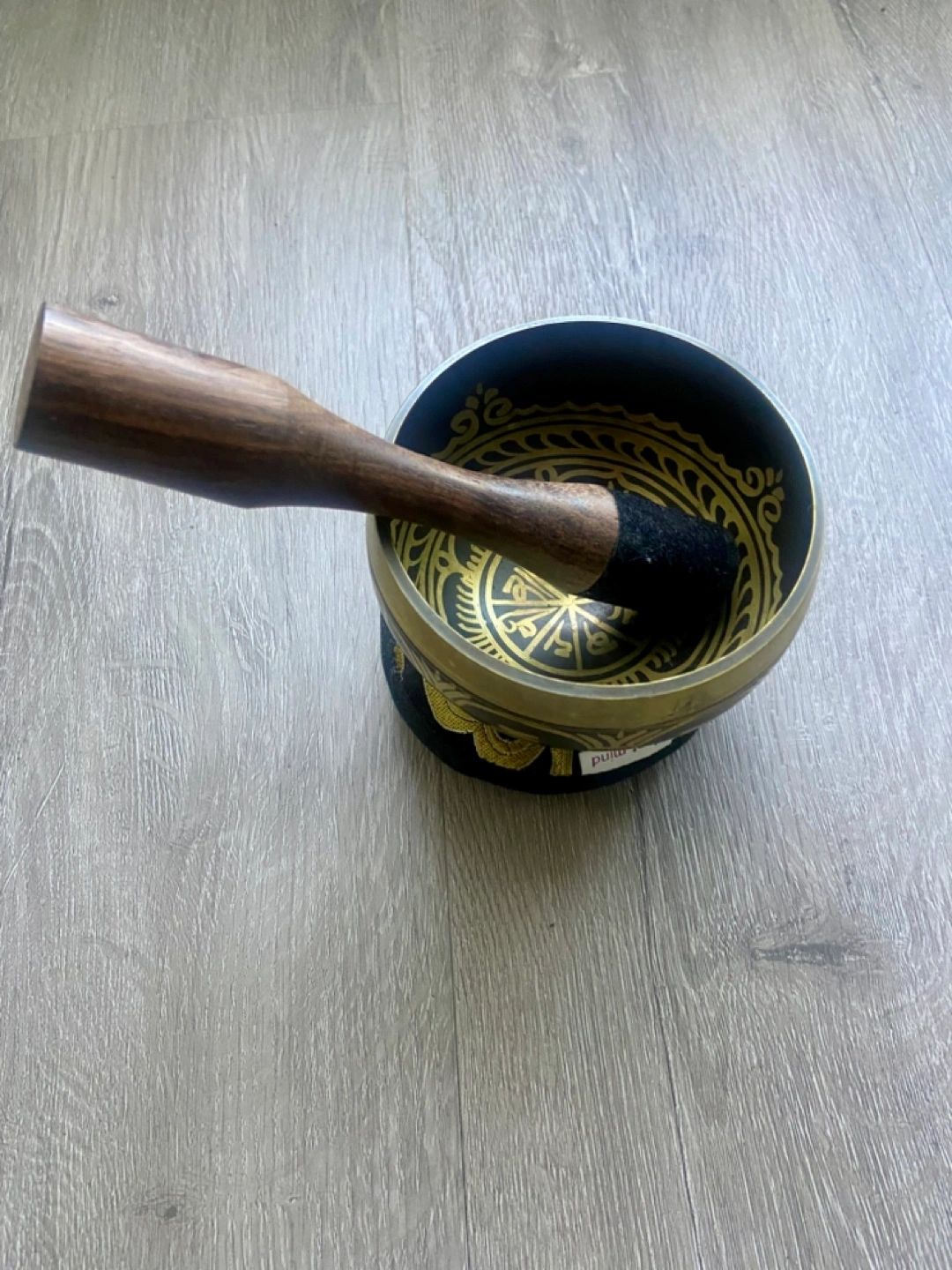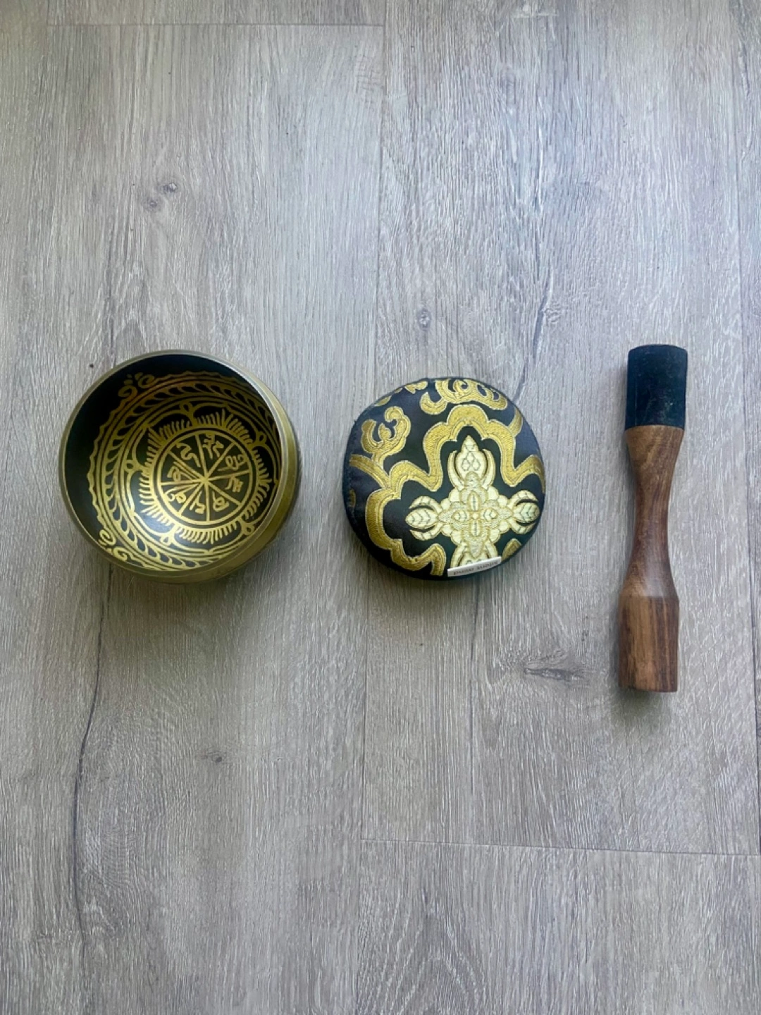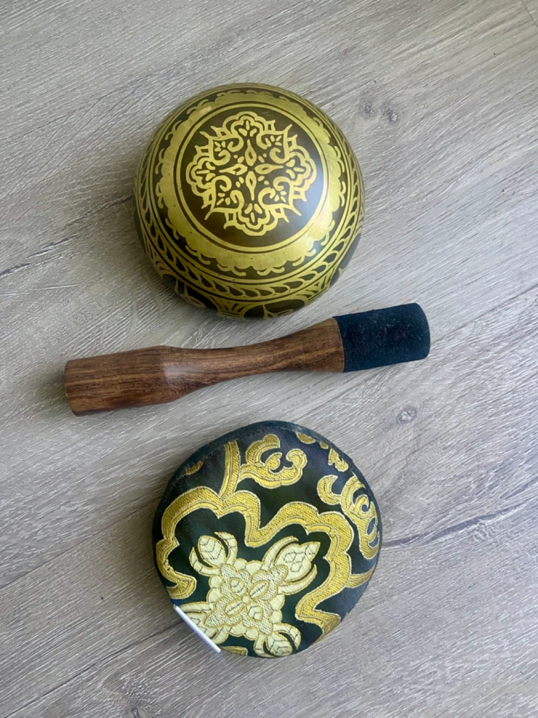 Selling a beautiful singing bowl set! It includes the bowl itself, a wooden mallet, and a decorative cushion. The bowl features intricate designs and would be a lovely addition to any space for meditation or relaxation