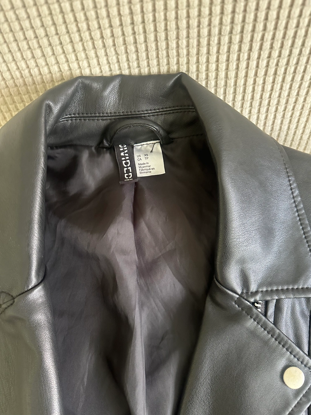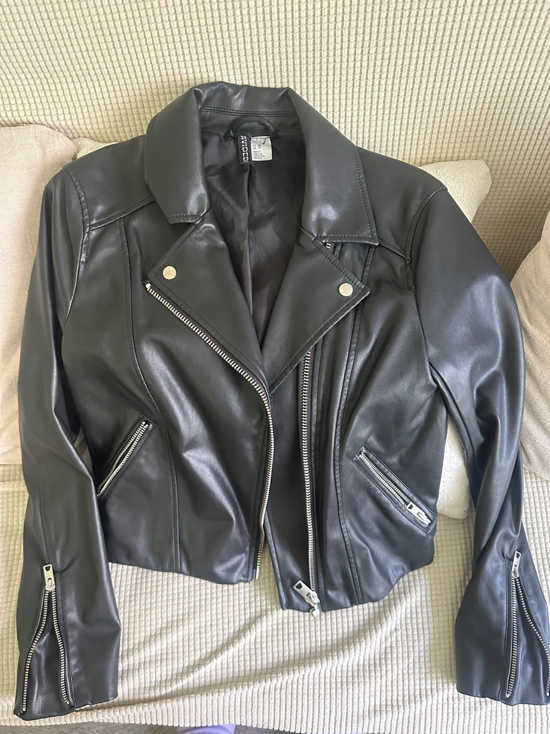 Selling a stylish H&M black faux leather jacket in size XS. It's in great condition and perfect for adding a bit of edge to any outfit. The jacket features a classic biker design with zipper details. A great addition to your wardrobe!