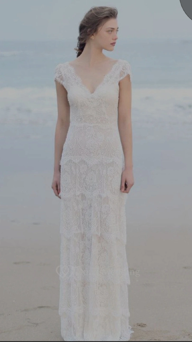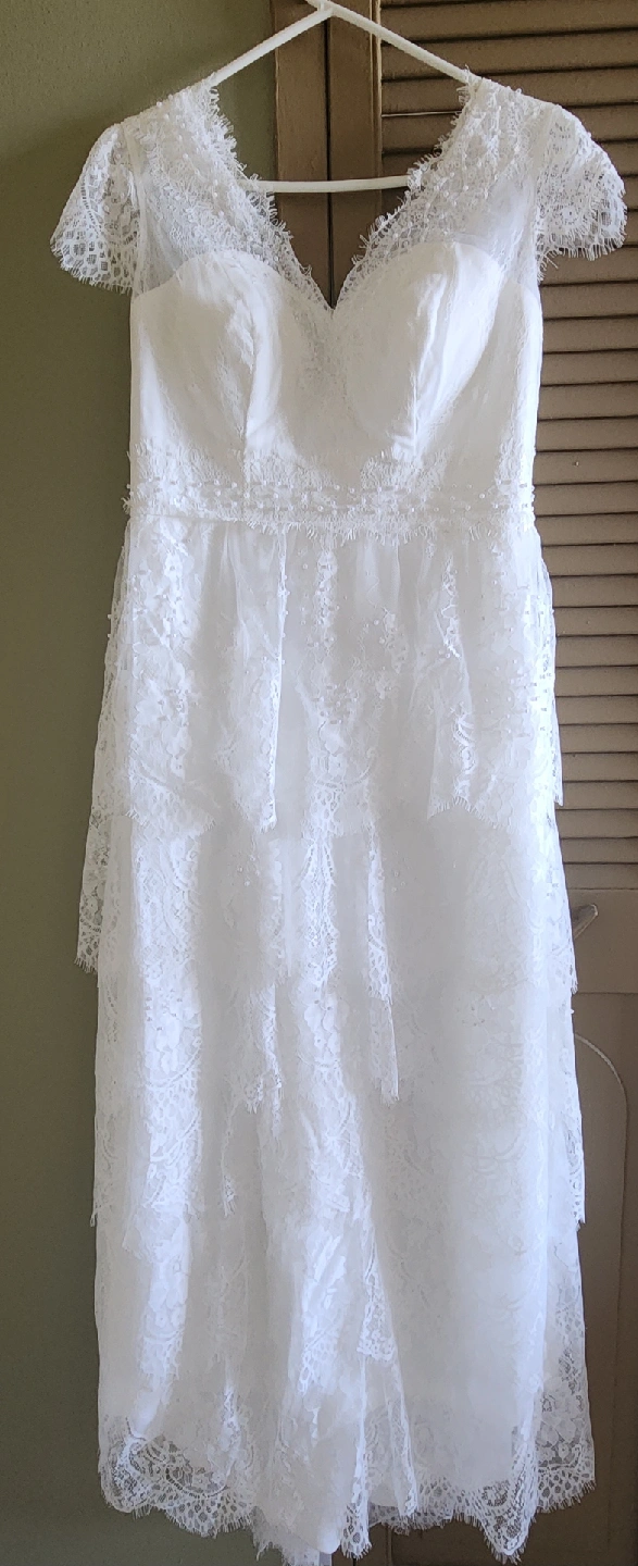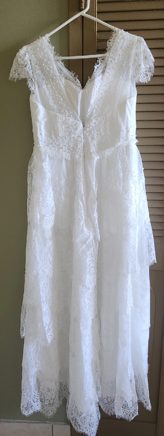 brand new, beautiful white lace wedding dress! It features delicate lace detailing and pearl embellishments. Comes with garment back. Size small, length 53 inches.