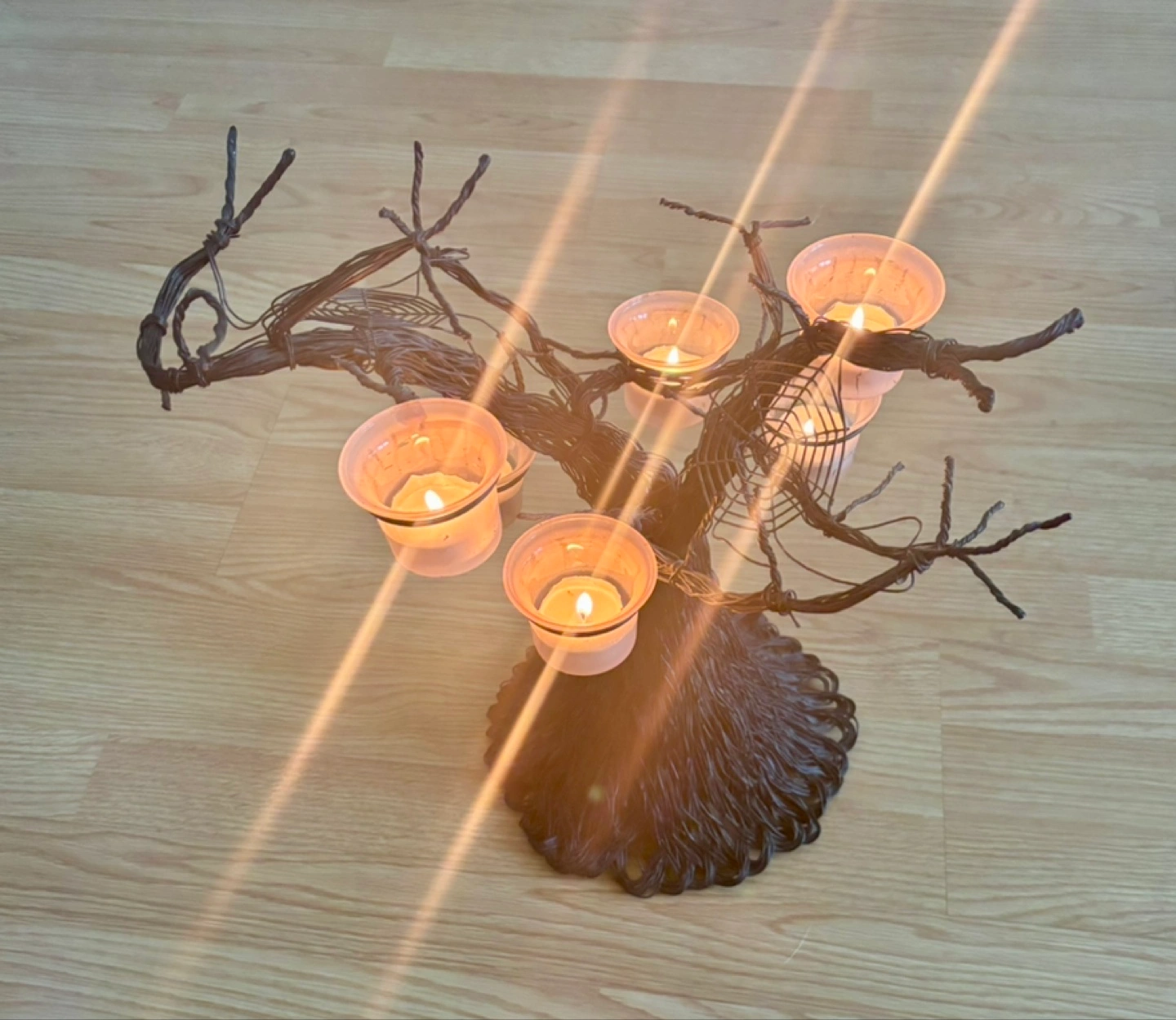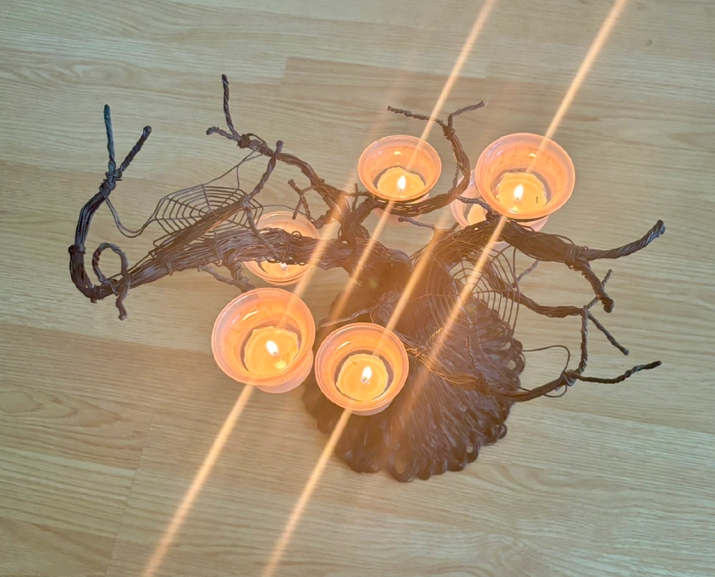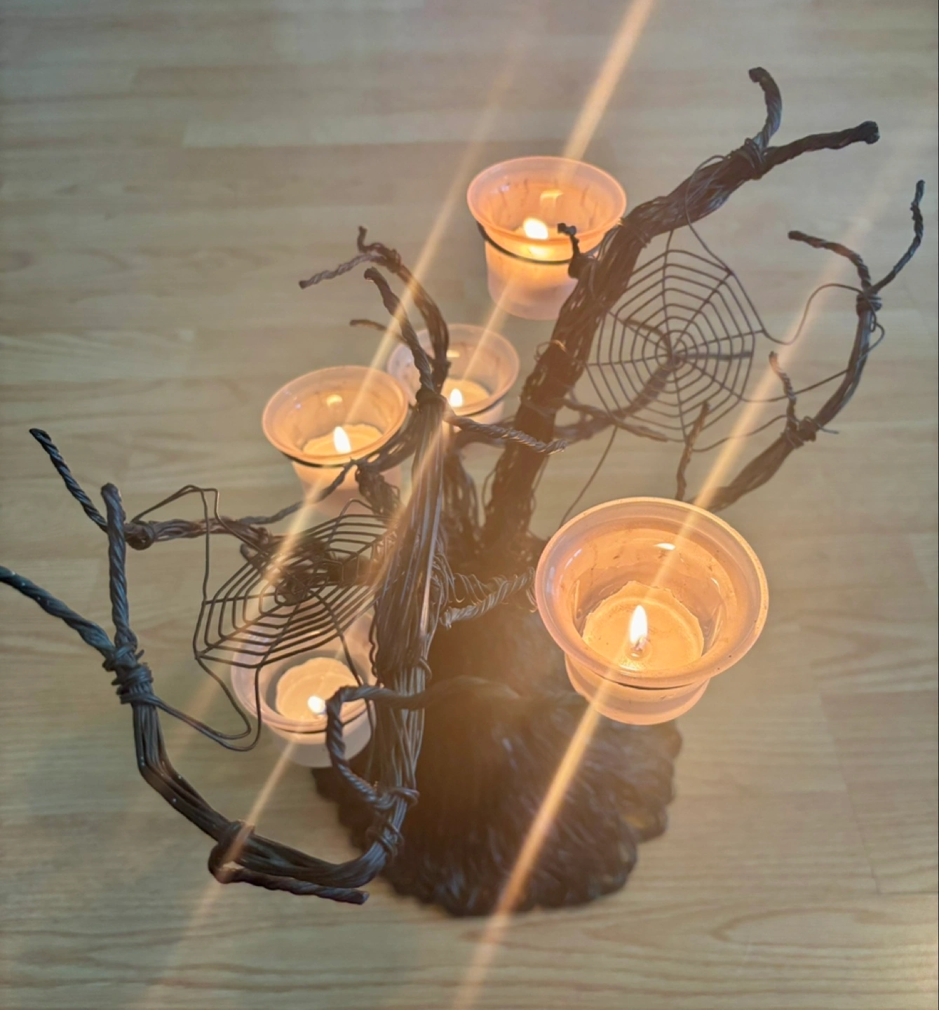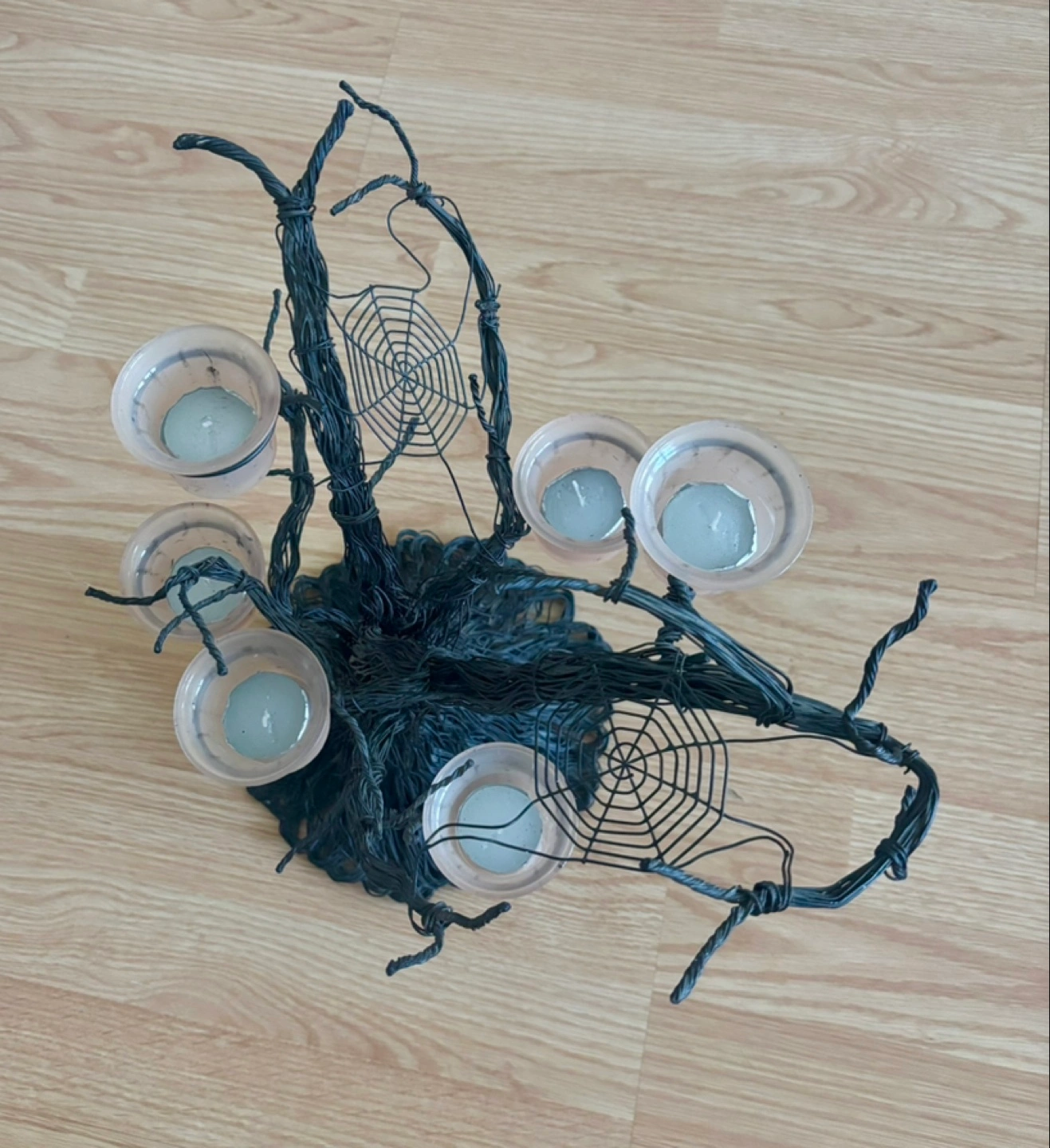 Selling a candle holder shaped like a spooky tree, perfect for Halloween! It has spots for six candles and little spiderwebs on the branches. Made from metal wire. Including new tea light candles. Very gently used and in pet and smoke free storage for years. Cash and pickup only.