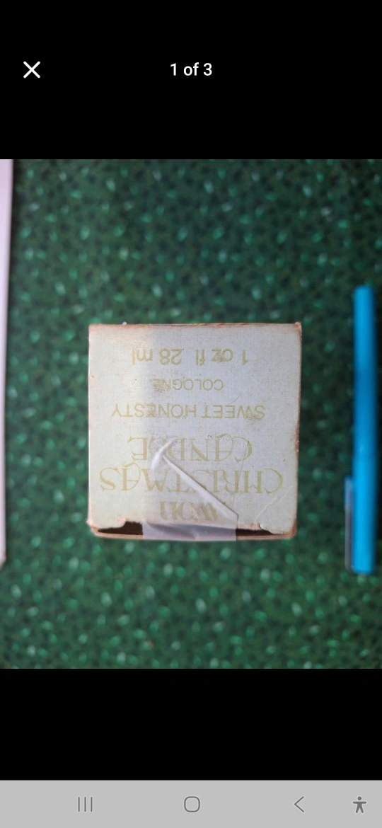Selling a vintage Avon Christmas Candle Sweet Honesty Cologne! It comes with the original box. The cologne is in a green candle-shaped bottle with a gold-coloured top. The box shows some wear, but the bottle is in great condition