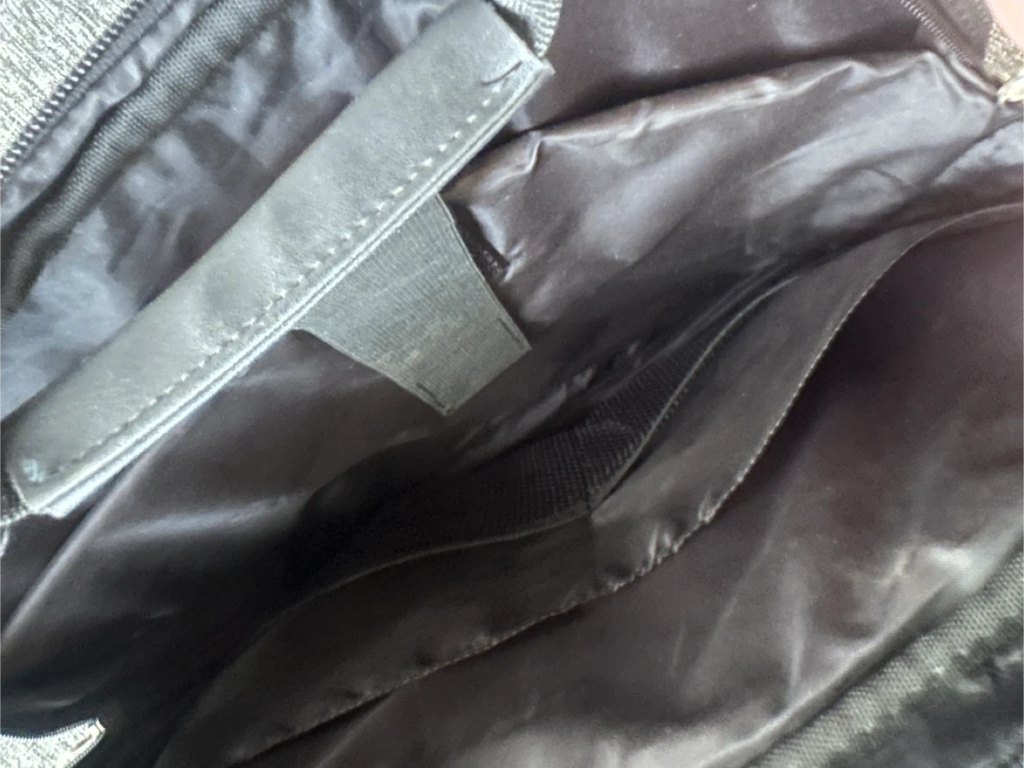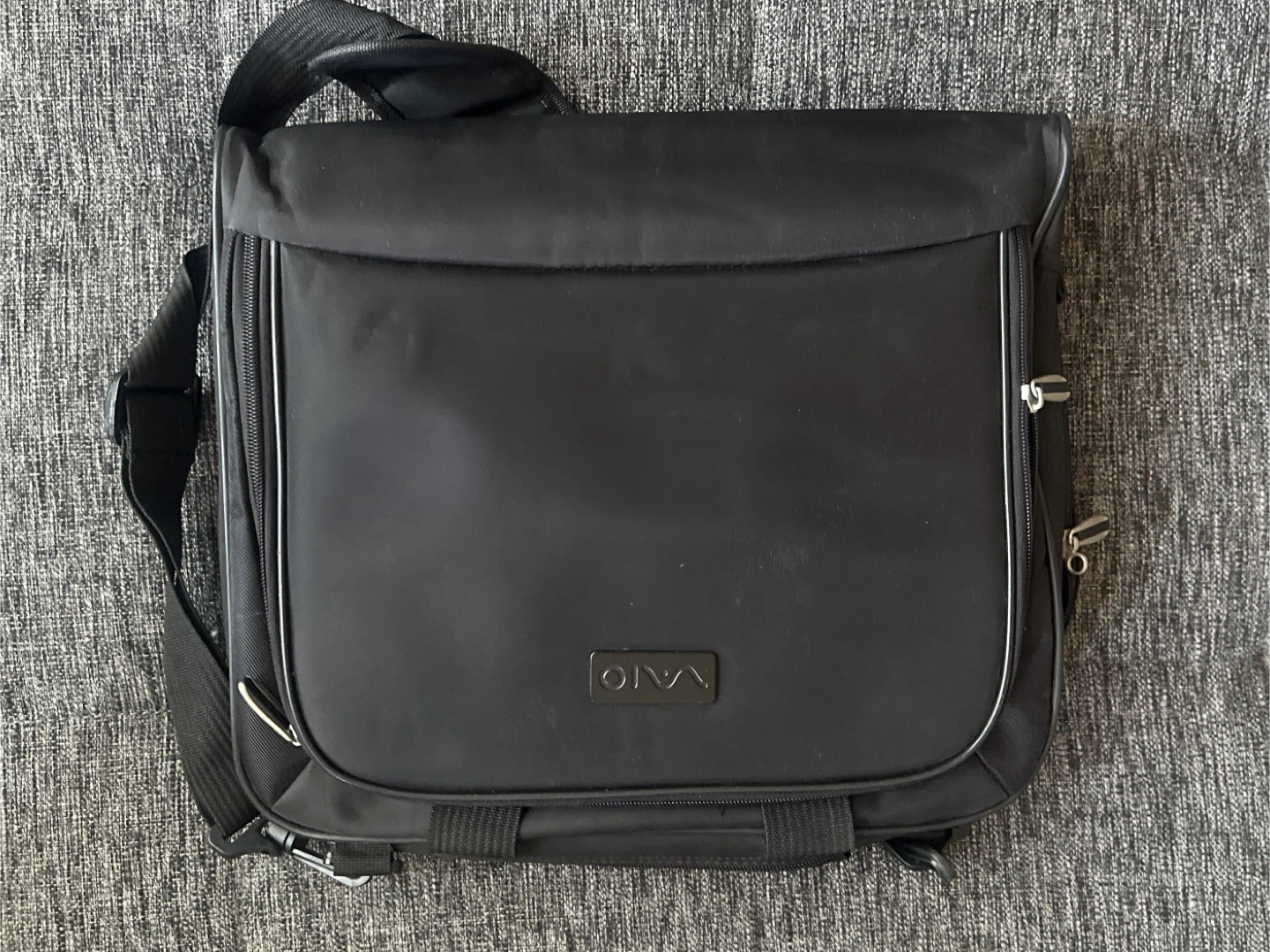 This is a used black OIVA laptop bag, designed to protect laptops with a padded interior and secure closure. It features multiple compartments for accessories and a comfortable shoulder strap for easy carrying. * Durable black material * Padded laptop compartment * Multiple accessory pockets * Adjustable shoulder strap