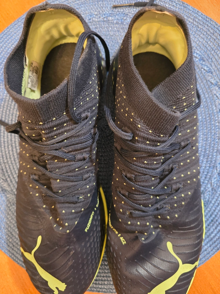Selling a pair of boys size 6 Puma Fuzionfit Pro 1 ACG soccer cleats. They are navy with a lime green sole and logo. Great for playing indoor soccer or other turf sports. only worn 4 times.