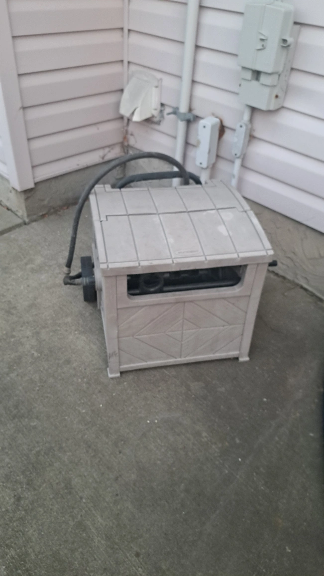 Outdoor hose reel hideaway in good condition! This beige hose reel box keeps your garden hose neatly stored and out of sight. Perfect for keeping your yard tidy!