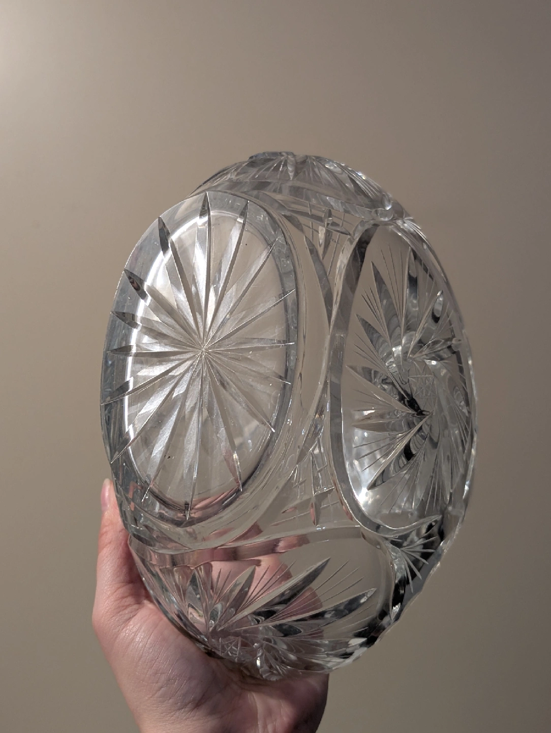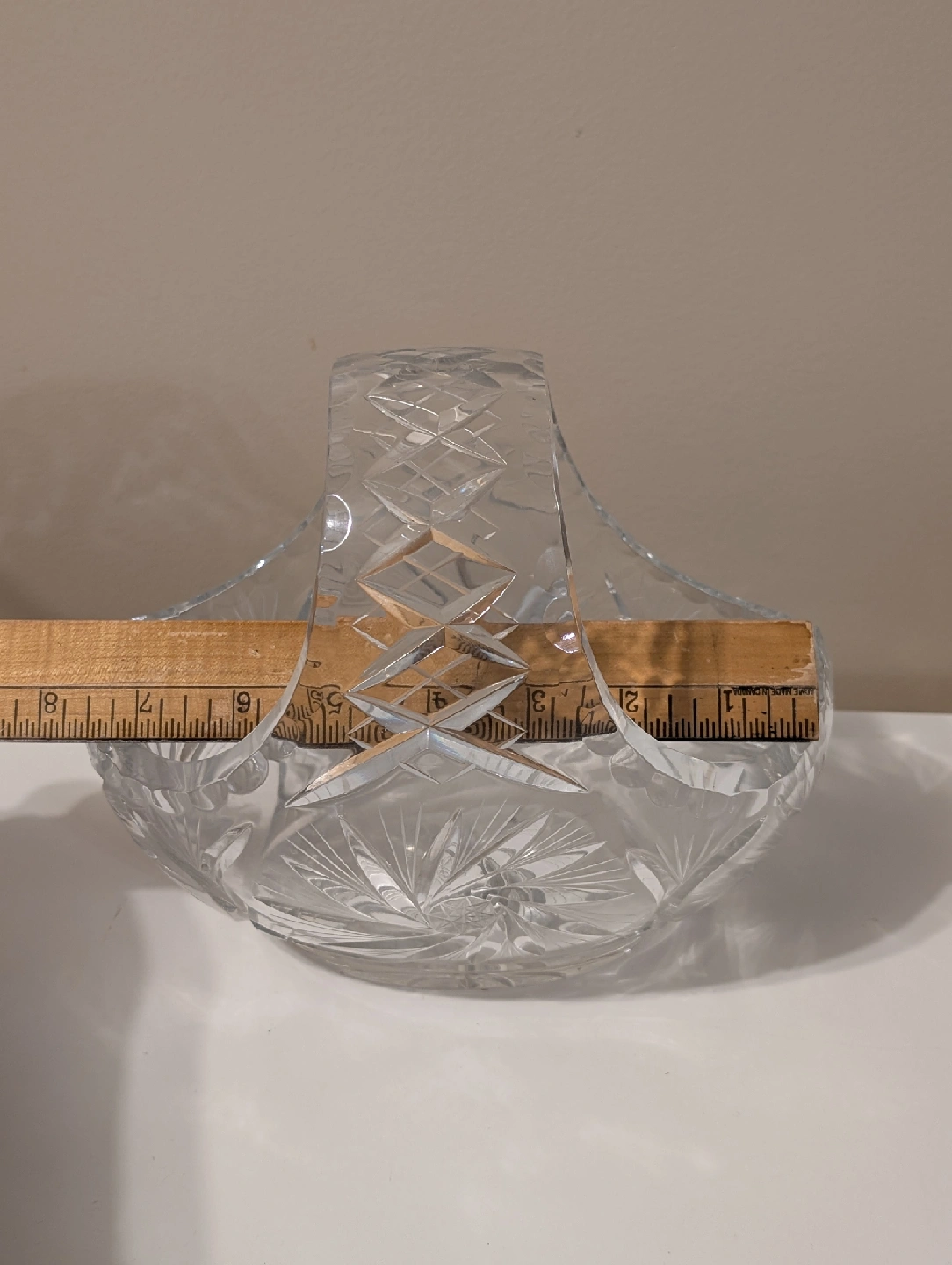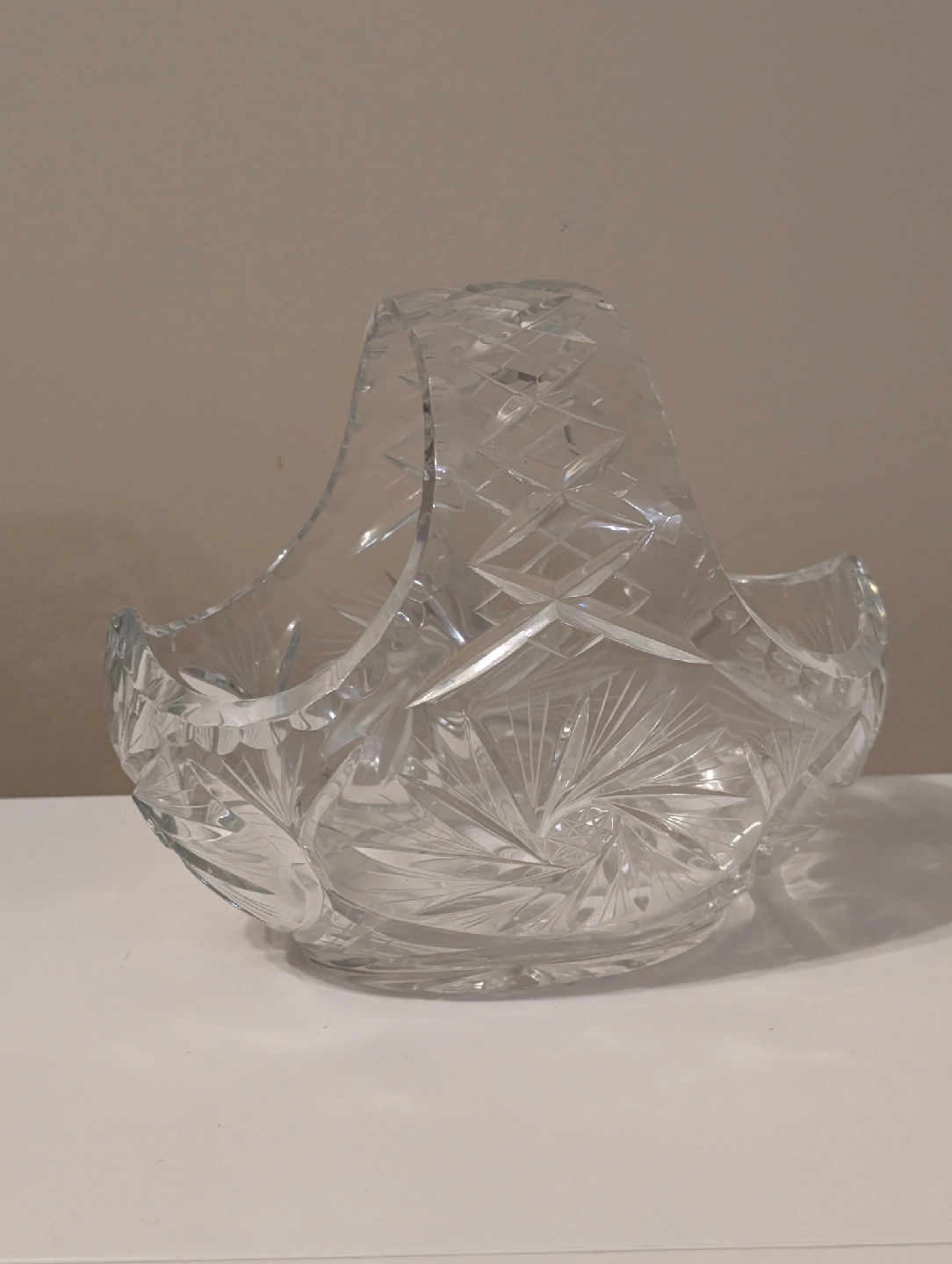 Crystal basket, perfect for adding a touch of elegance to your home. It measures approximately 8 inches in diameter. The intricate design catches the light beautifully!
