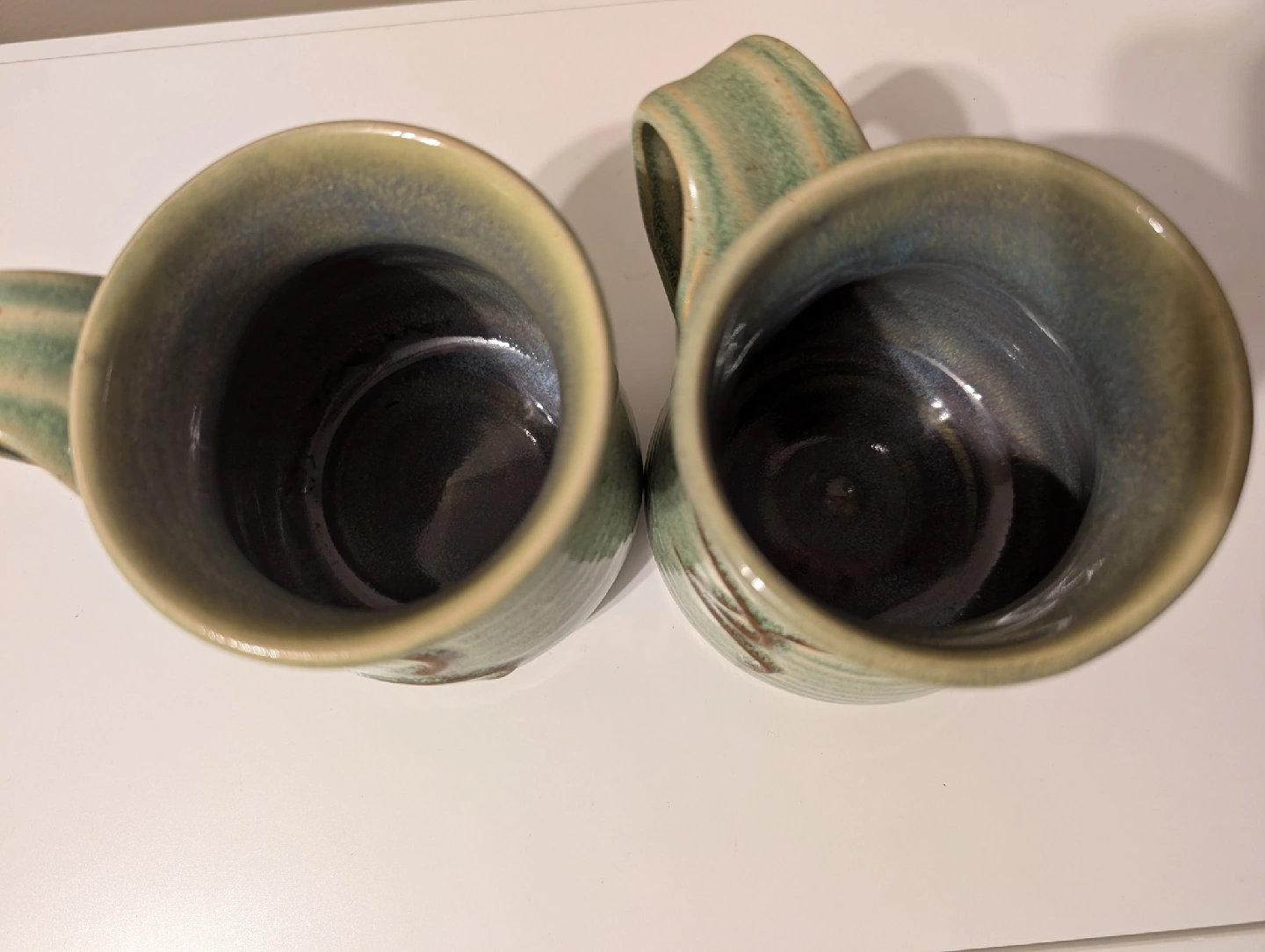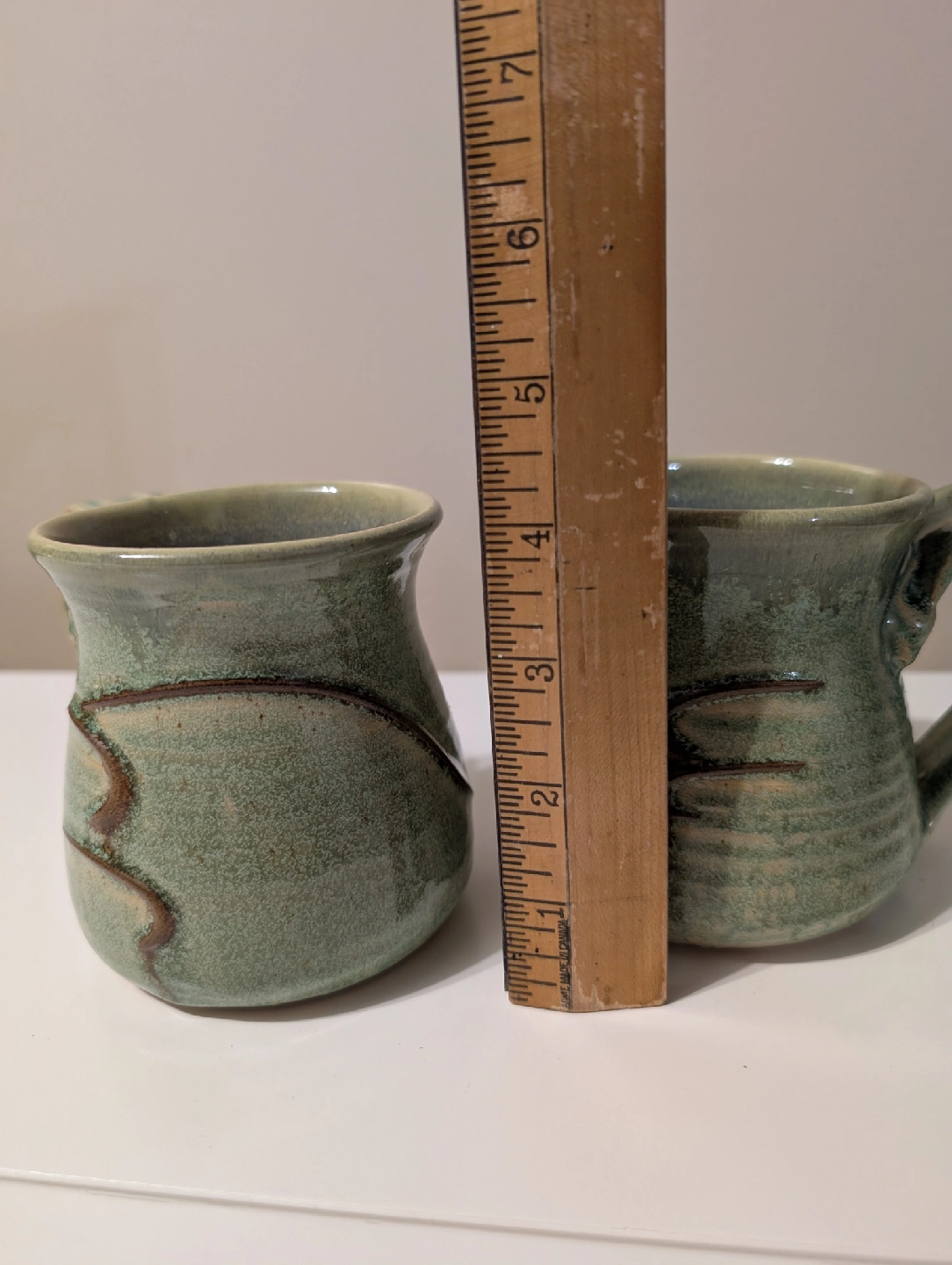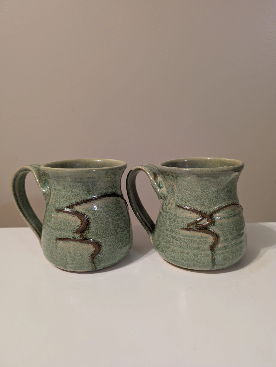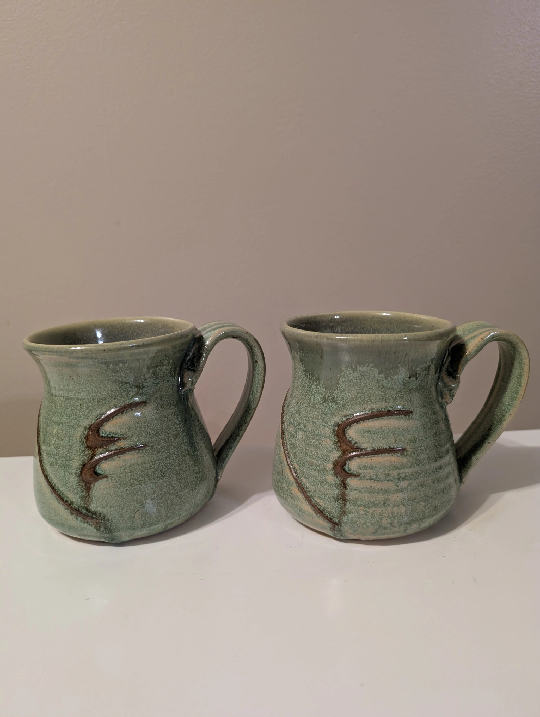 Selling a set of two handmade ceramic mugs. They're a beautiful green colour with a unique design. Perfect for enjoying your morning coffee or tea!