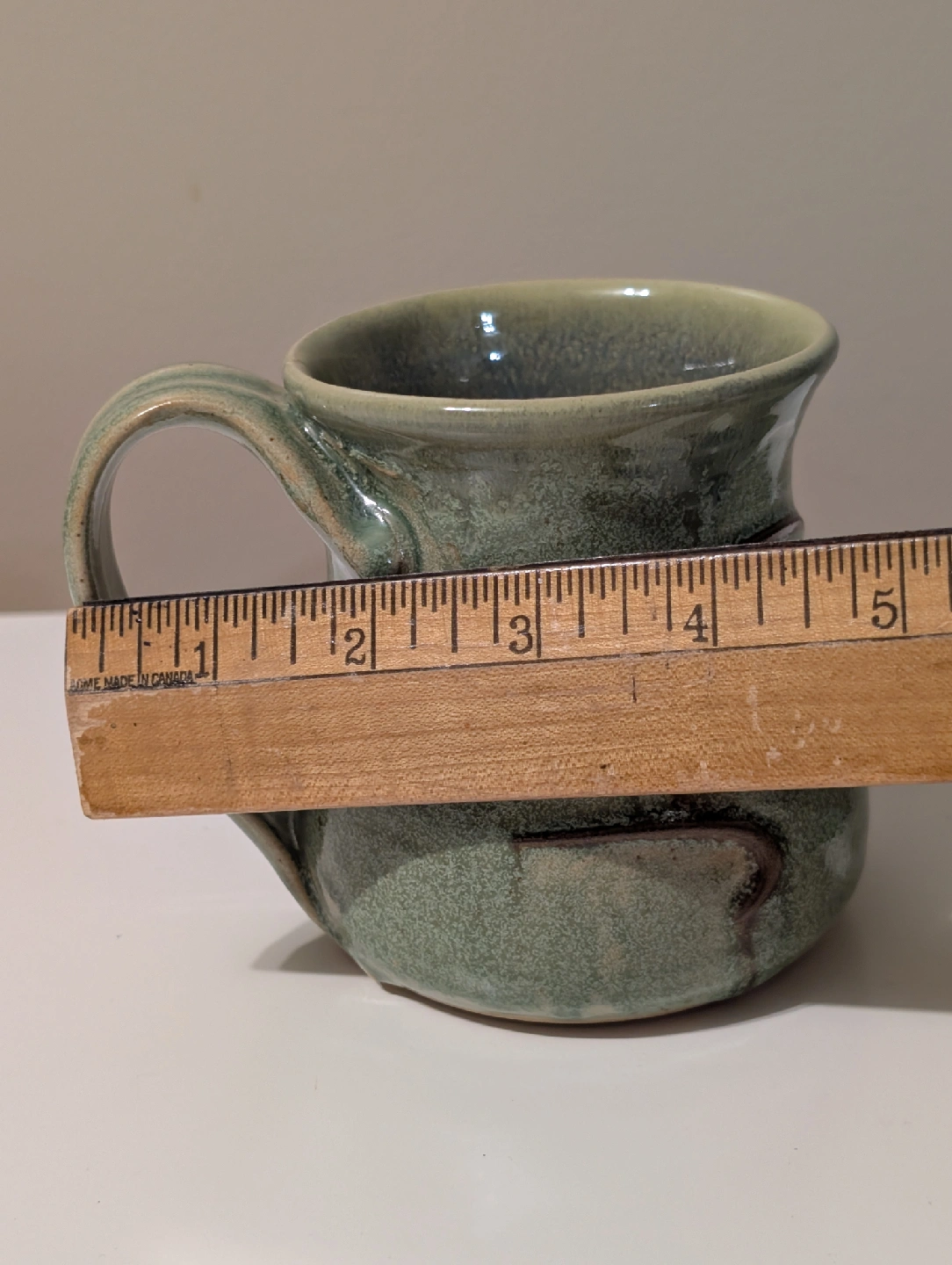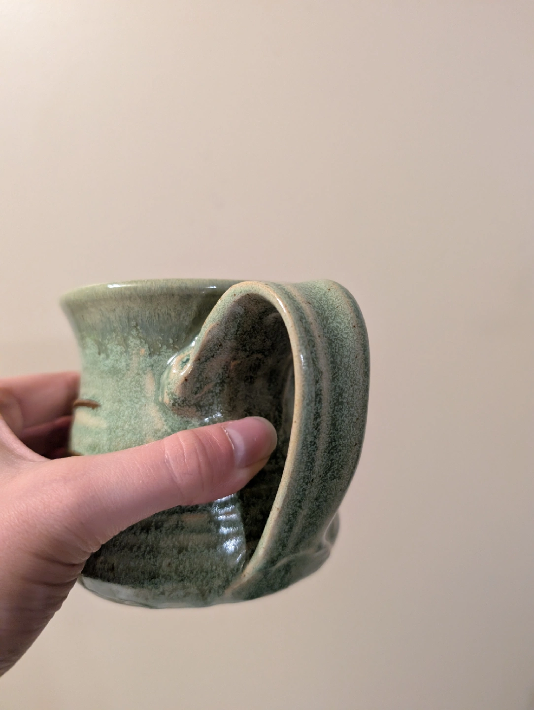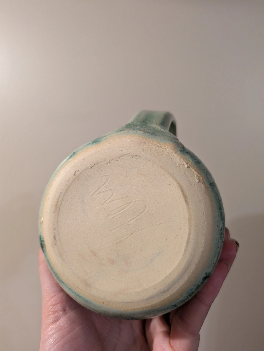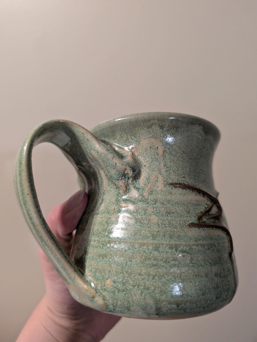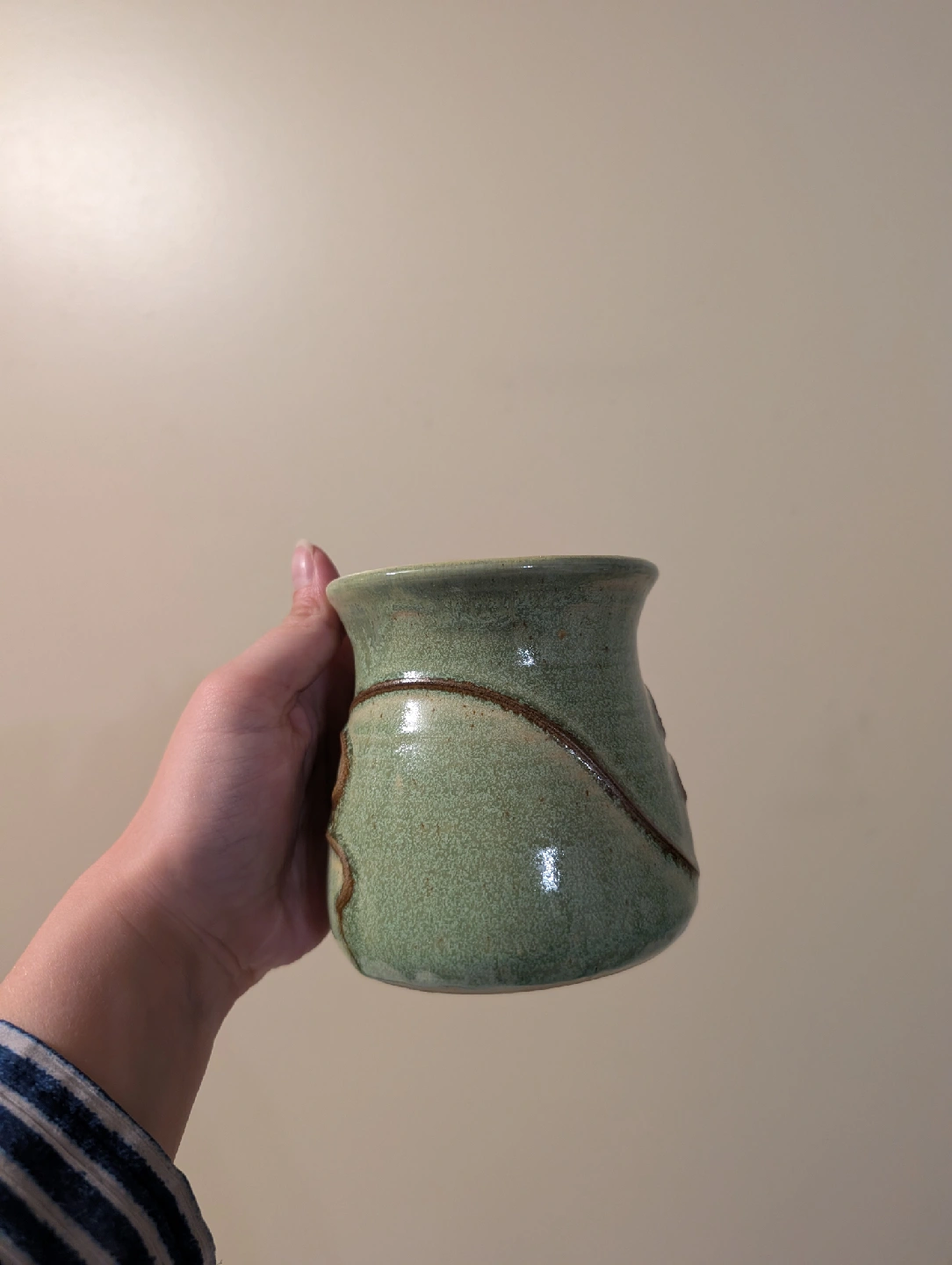 Selling a set of two handmade ceramic mugs. They're a beautiful green colour with a unique design. Perfect for enjoying your morning coffee or tea!