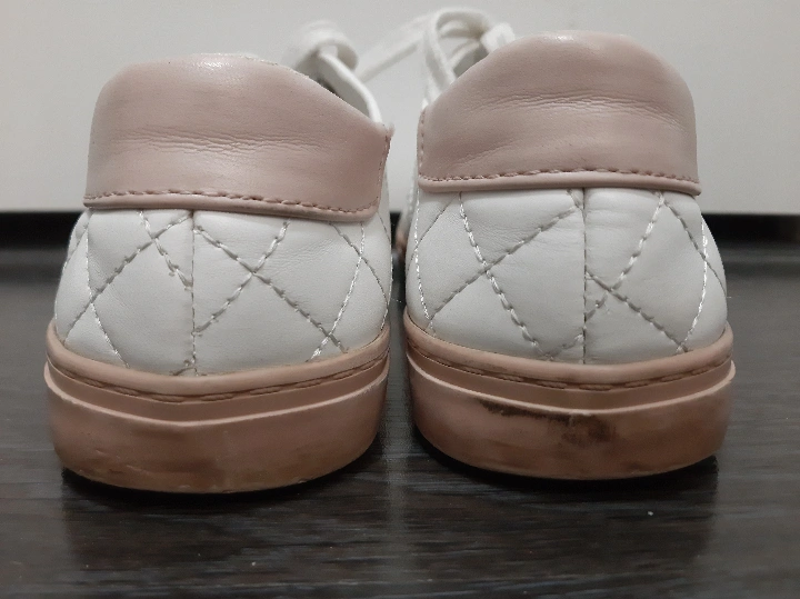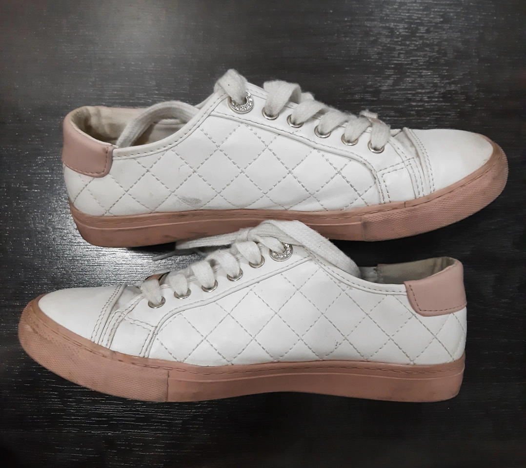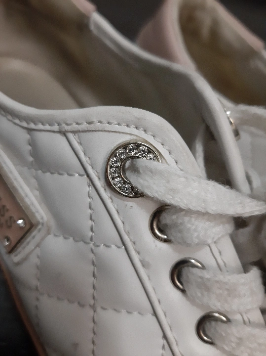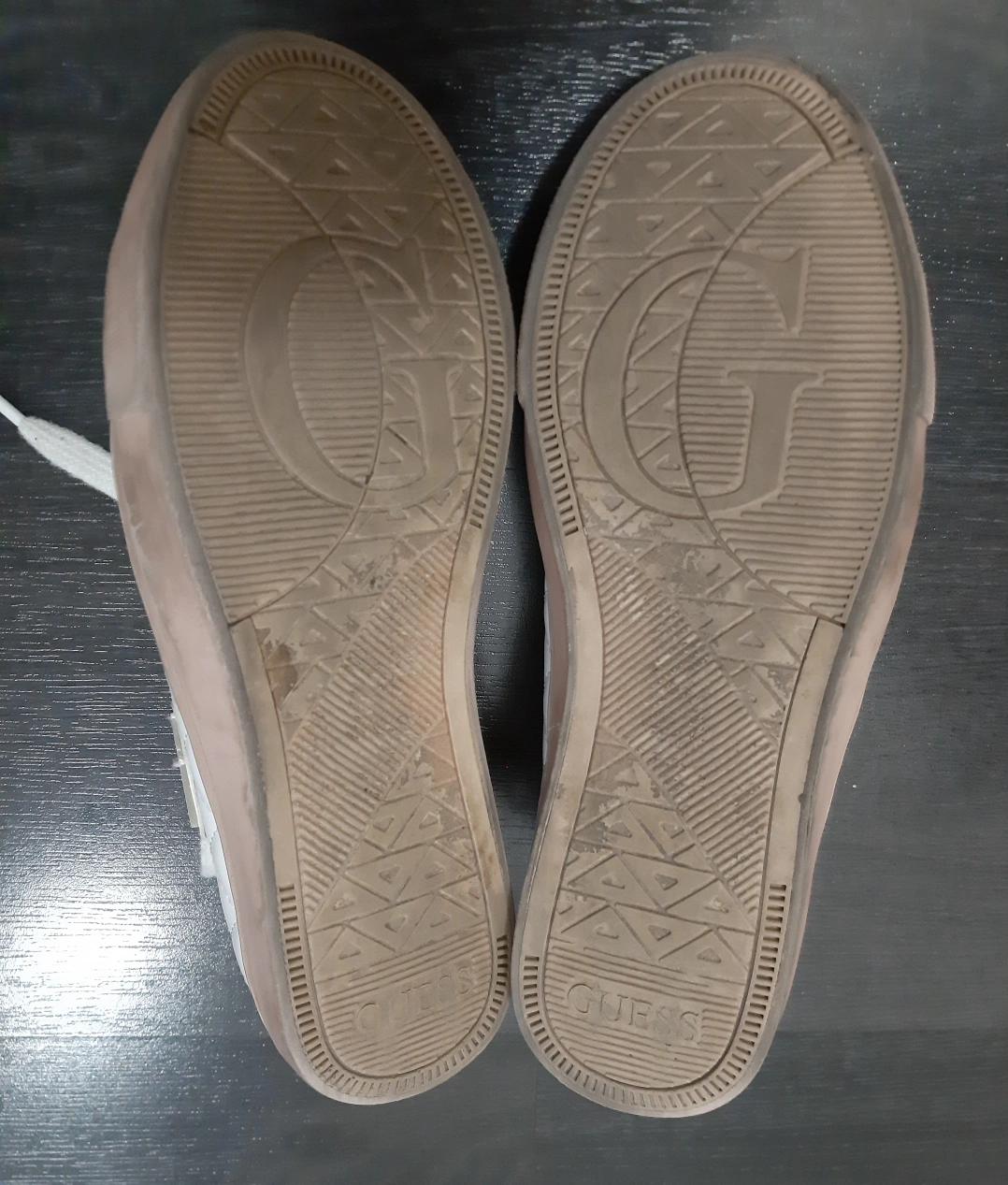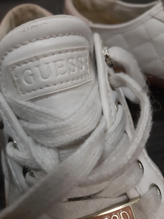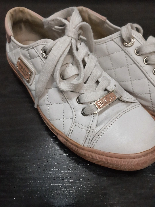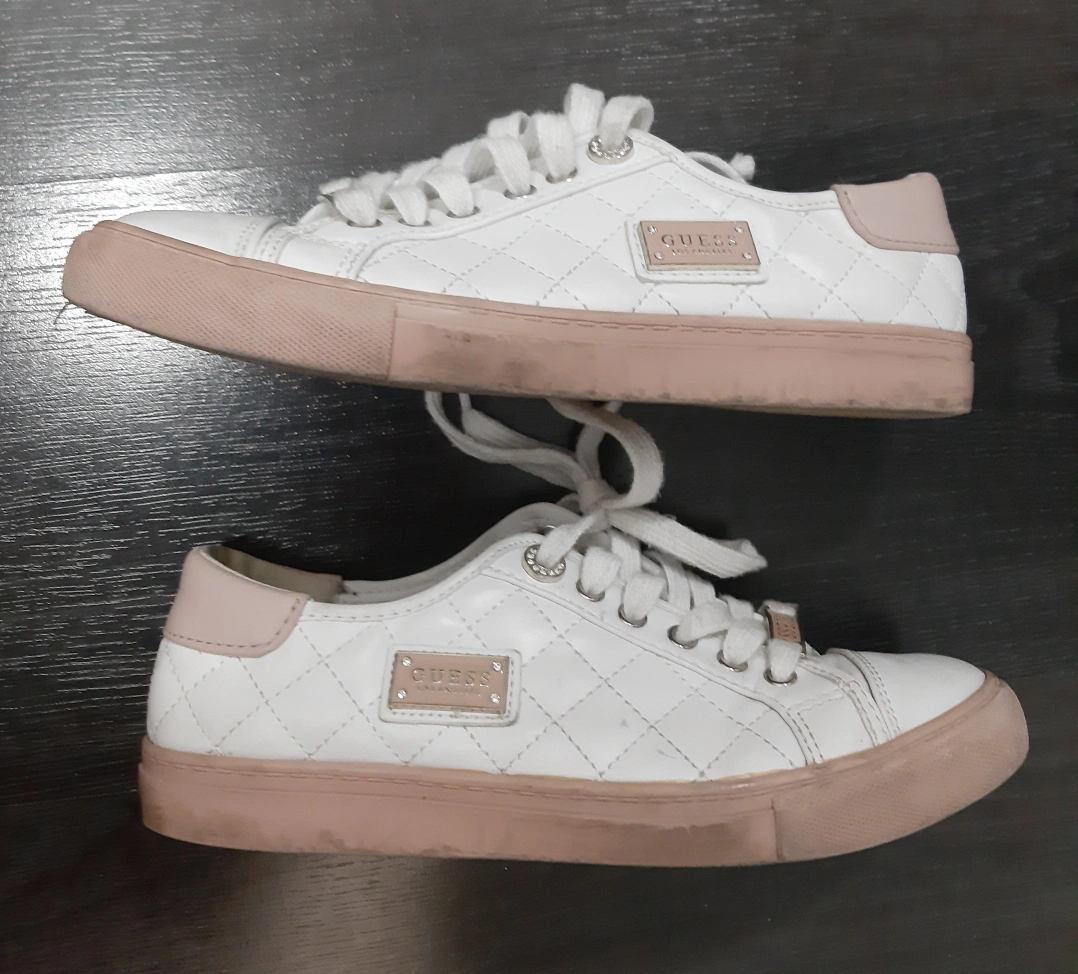 Selling a pair of Guess sneakers in white with a quilted pattern. They show some signs of wear, as you can see in the photos, but still have lots of life left! They feature a blush pink accent on the heel and sole.