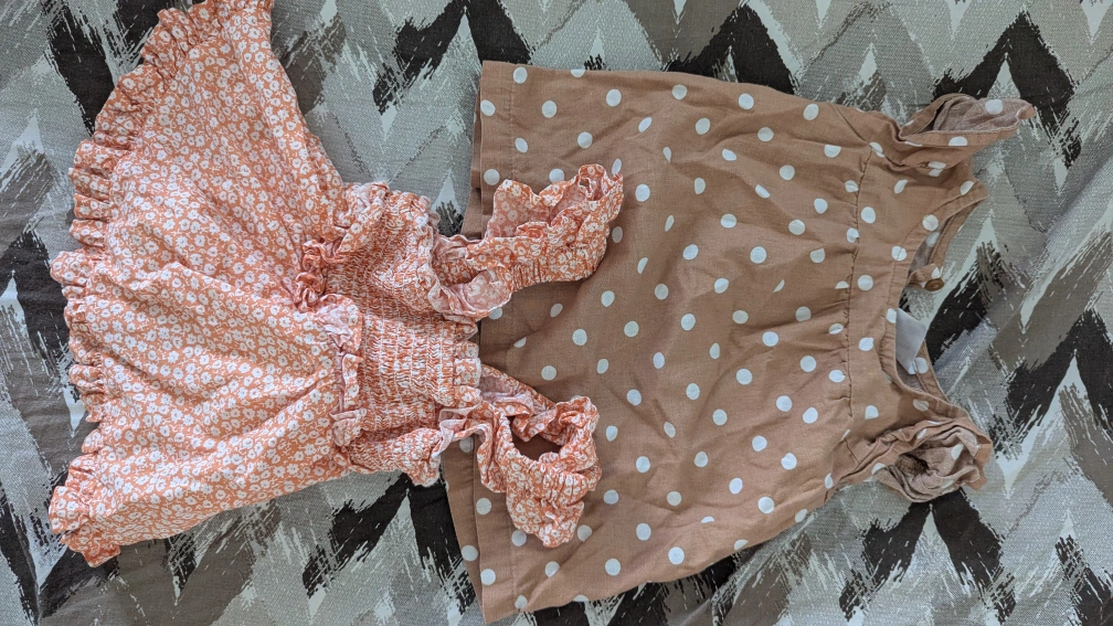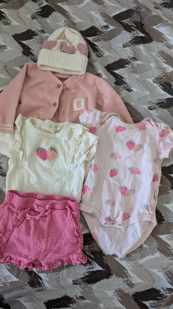 Selling a bundle of baby and toddler clothes. The bundle includes various items such as dresses, tops, shorts, a cardigan, and a hat. All items are in good condition and ready for a new home!