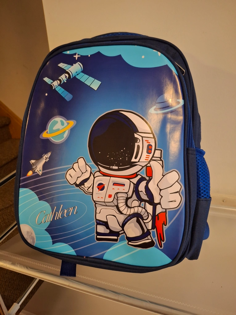 A cute astronaut-themed backpack for kids! It features a fun space design with an astronaut, planets, and a spaceship. Perfect for school or outings! 13" x 6" x 11"