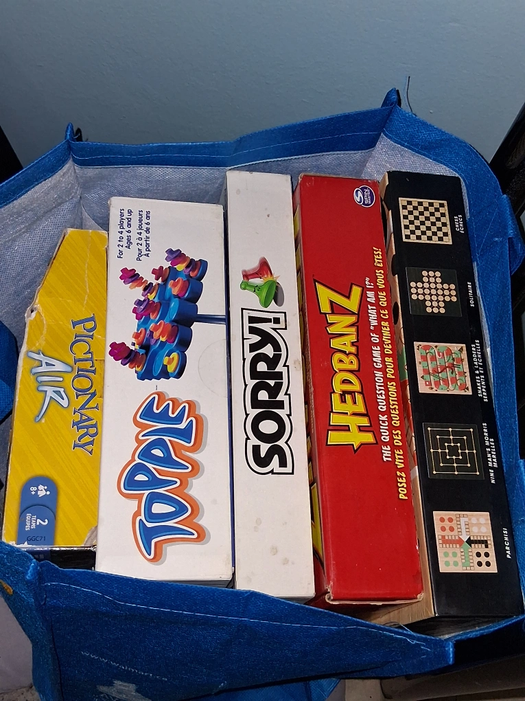 Selling a bundle of gently used board games! Perfect for family game night or keeping the kids entertained. Includes: - Pictionary Air (New) - Topple (gently used) - Sorry! (gently used) - Hedbanz (gently used) - 100 classic games (gently used)