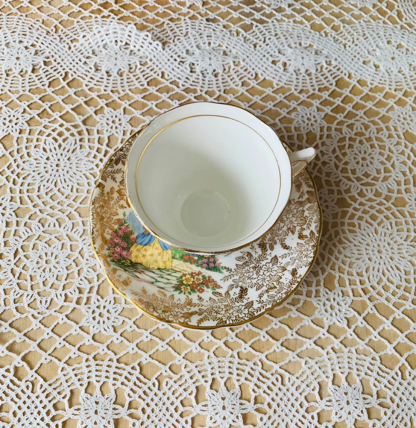 Vintage English lady in the garden teacup by colclough, Bone china. Excellent vintage condition, no crack or chip. The saucer’s diameter is around 14cm, the teacup’s diameter is around 8.3cm, the hight of the teacup is about 7cm.