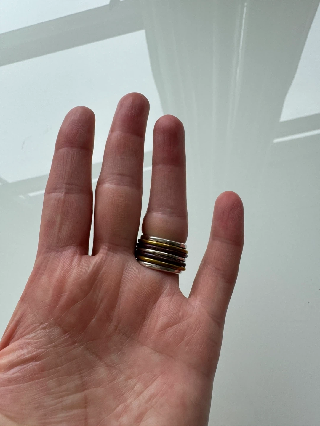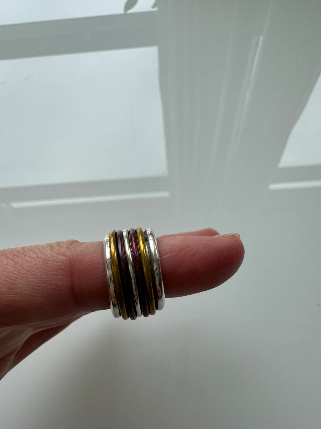 Selling a 925 sterling silver ring! It has multiple bands with gold and red detailing. It's in great condition and ready for a new home. It fits a size 6