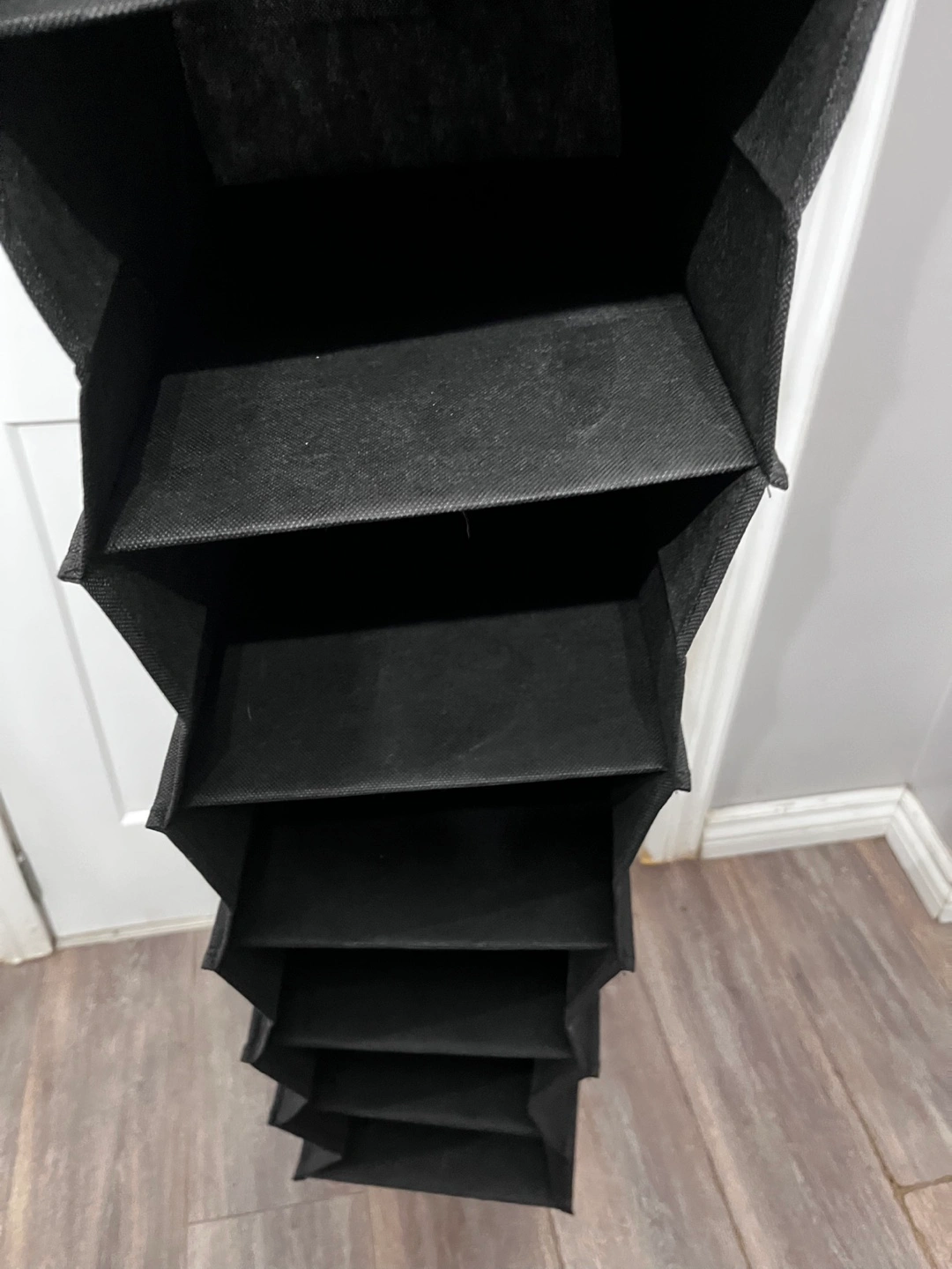 Keep your shoes tidy with this black hanging organizer! It's perfect for closets and small spaces, helping you maximize storage. It's in great condition and ready to use. Measures 9” W x 11”D x 60” H. 10 compartments at 6” height. Pick up only. Closest intersection is Jane St and Eglinton Ave.