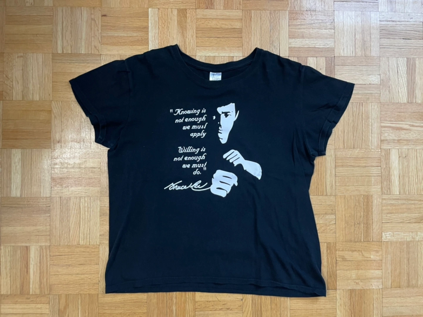 Here's a black t-shirt with a graphic of Bruce Lee and a quote. It says, "Knowing is not enough we must apply. Willing is not enough we must do." It's in good condition and ready for a new home!