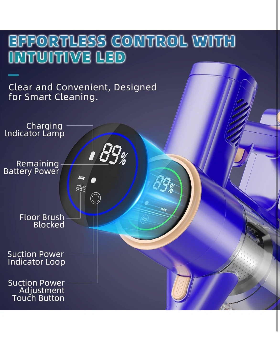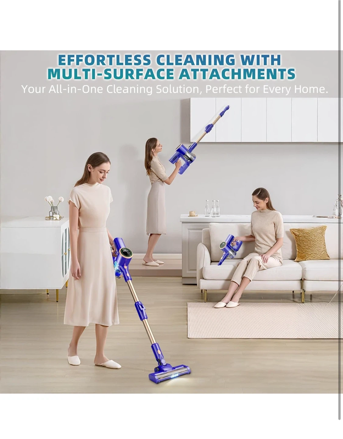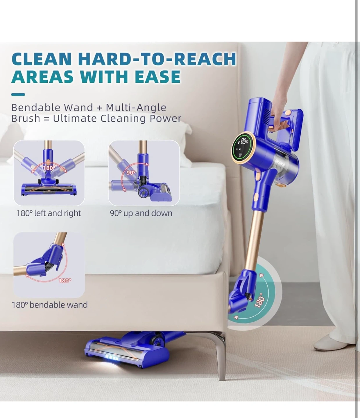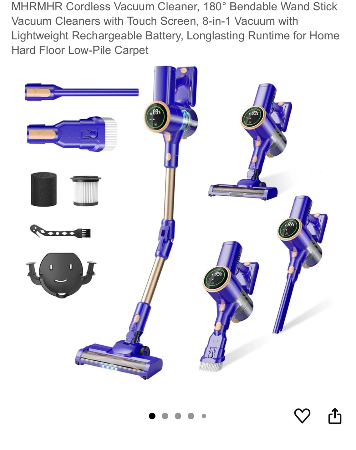 This is a MHRMHR cordless vacuum cleaner. It features a 180° bendable wand stick and a touchscreen. It's an 8-in-1 vacuum with a lightweight rechargeable battery, offering a long runtime for home cleaning on hard floors and low-pile carpets. The vacuum has a removable and replaceable battery for extended use and an intuitive LED display for smart cleaning