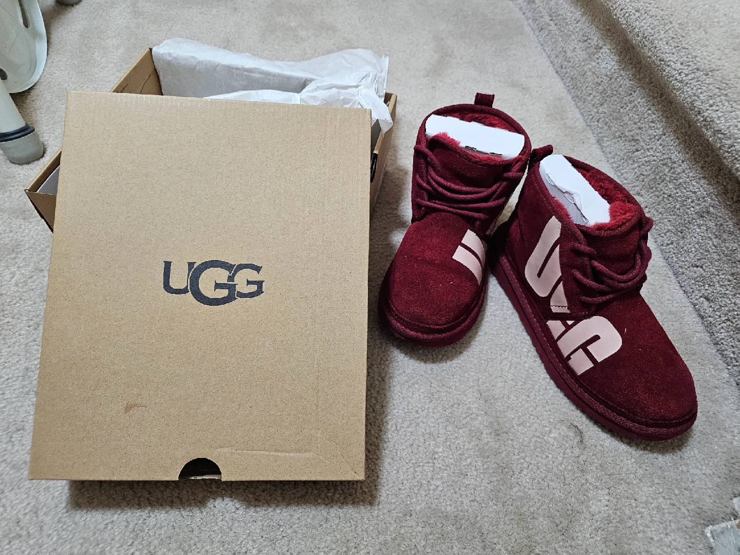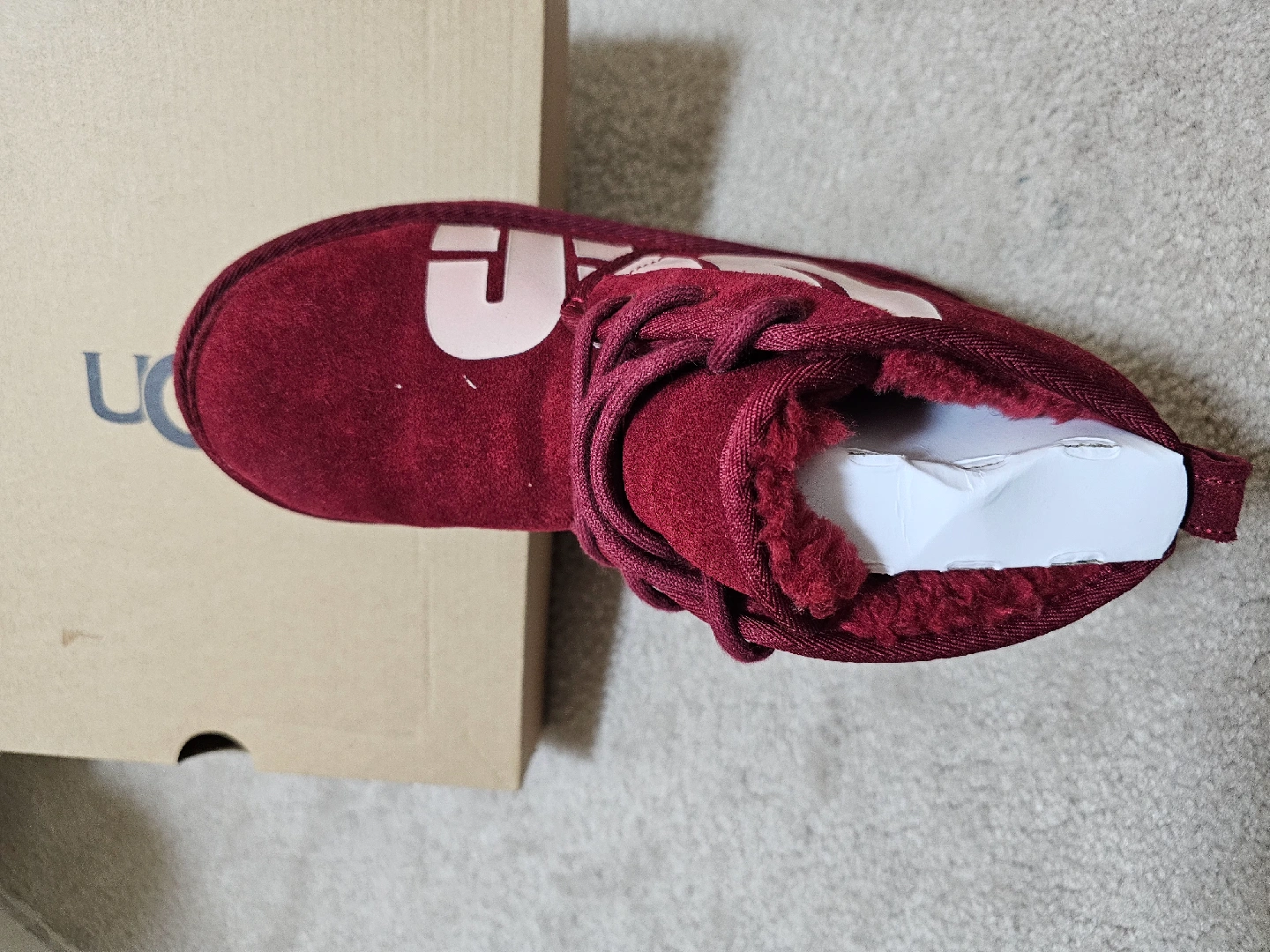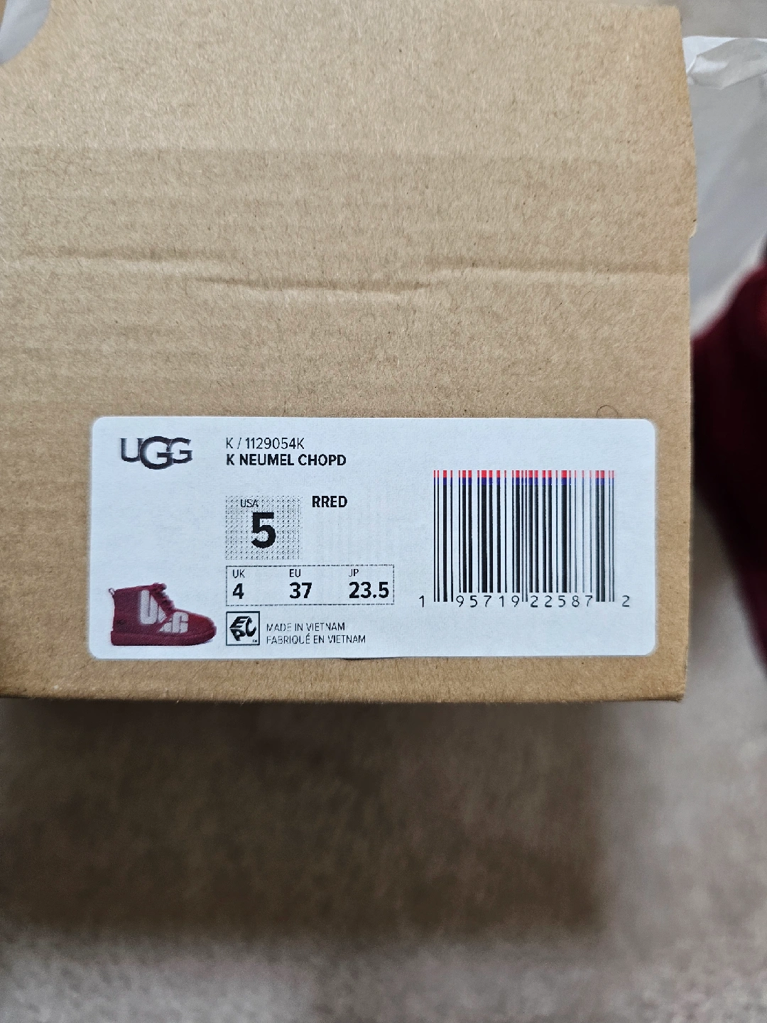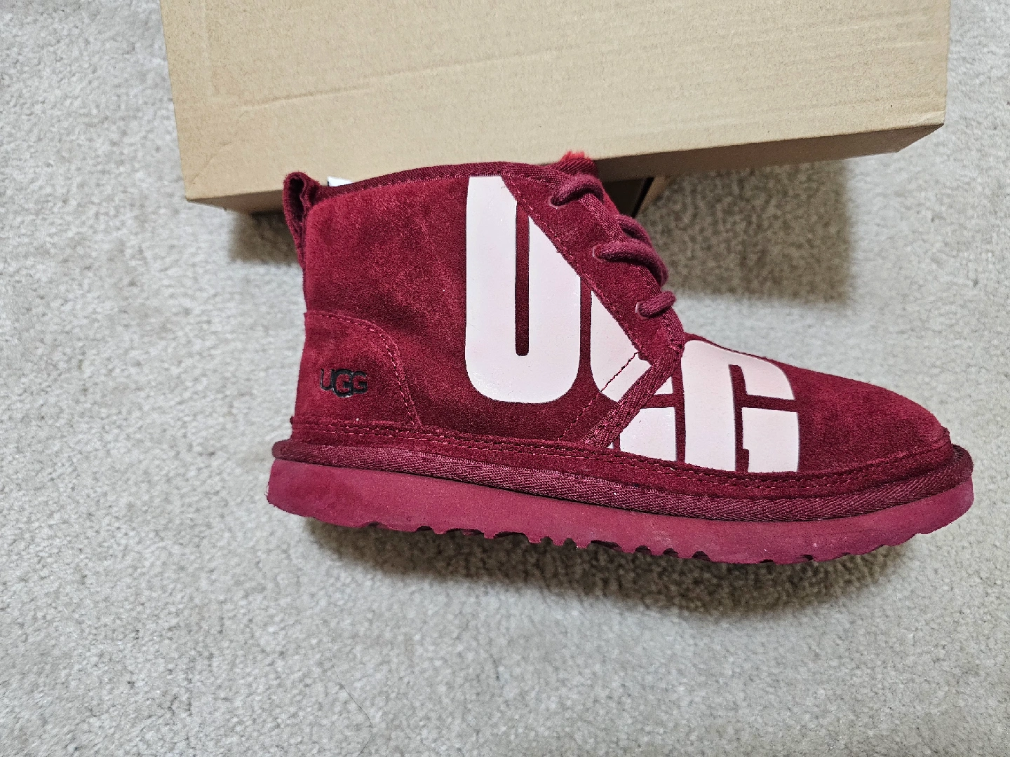 Selling a pair of UGG K Neumel Chopd boots in a lovely red (RRED) colour! These are a size 5. They come with the original box. Perfect for keeping your feet warm and stylish!