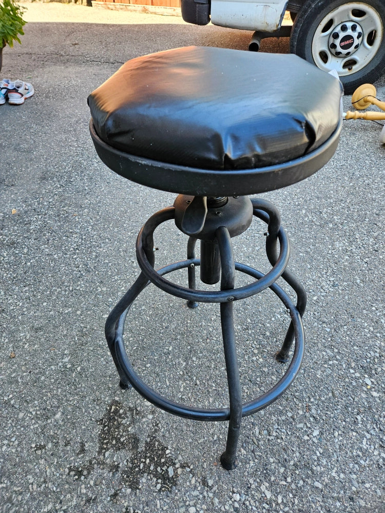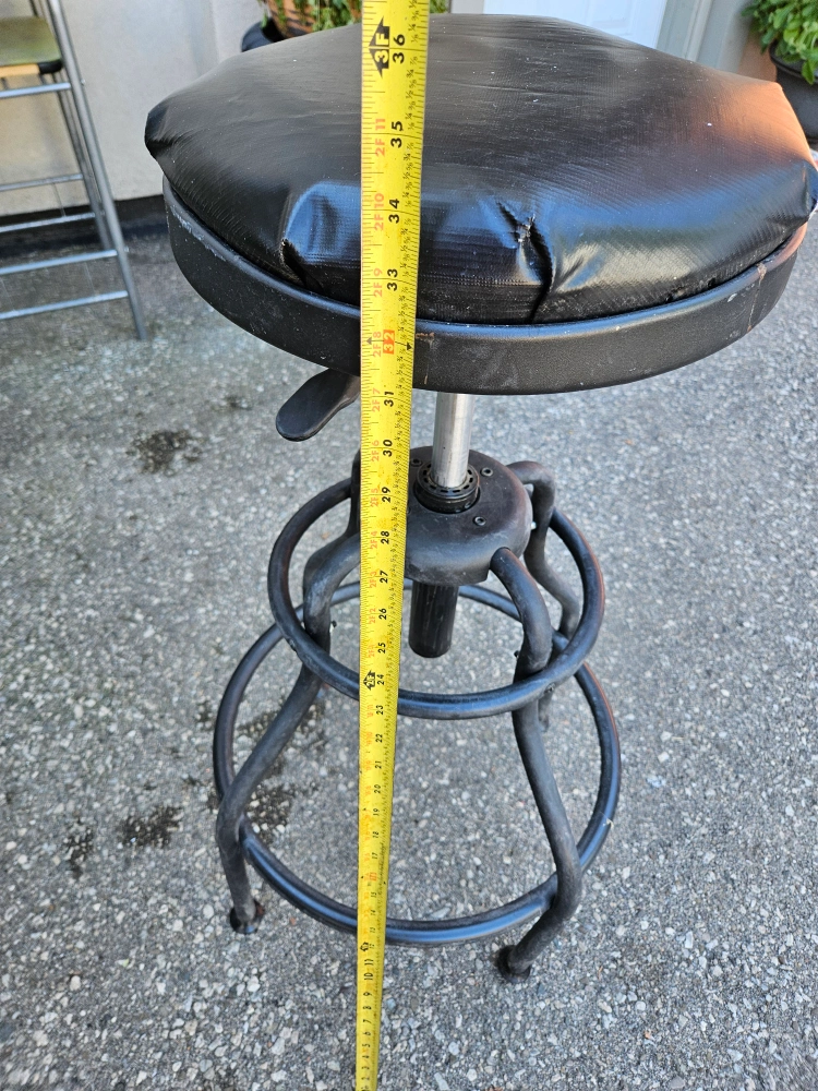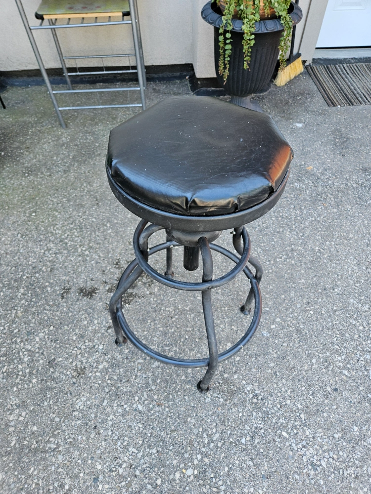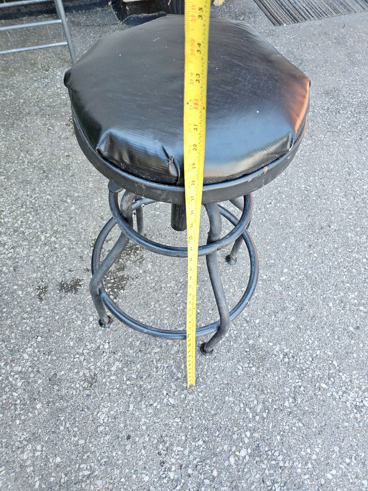 Selling a sturdy bar stool with an adjustable height feature, perfect for your kitchen or bar area. The seat is black and the frame is a dark colour. It shows some signs of wear, but is still in good, usable condition. The height can be adjusted from approximately 34 inches.