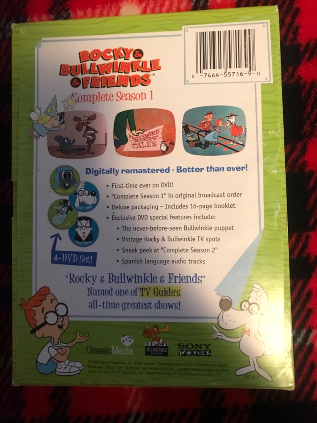 Selling the Rocky & Bullwinkle & Friends Complete Season 1 DVD set! It's a 4-DVD set with the complete first season in original broadcast order. The deluxe packaging includes a 16-page booklet. There are also exclusive DVD special features, including the never-before-seen Bullwinkle puppet and vintage Rocky & Bullwinkle TV spots. Great for nostalgia and first time watchers