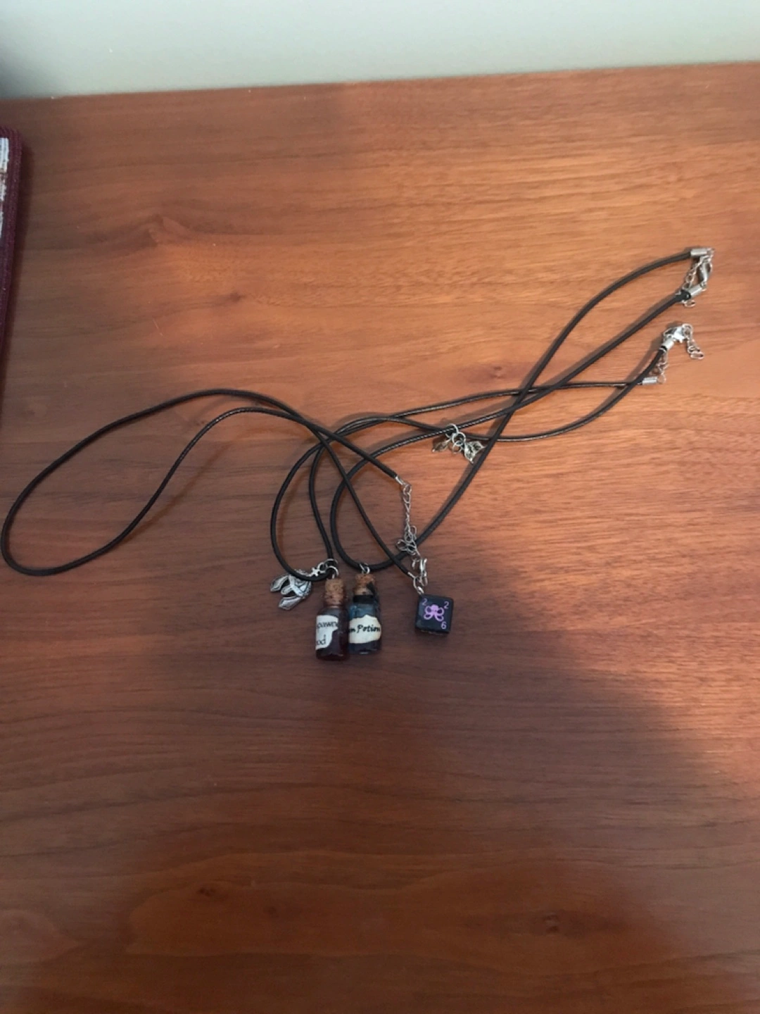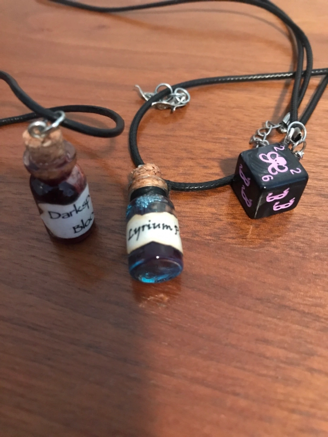 Set of 3 game inspired necklaces good for any gamer. One Darkspawn Blood (Dragon Age) one Latium potion (dragon age) and one 6 sided dice.