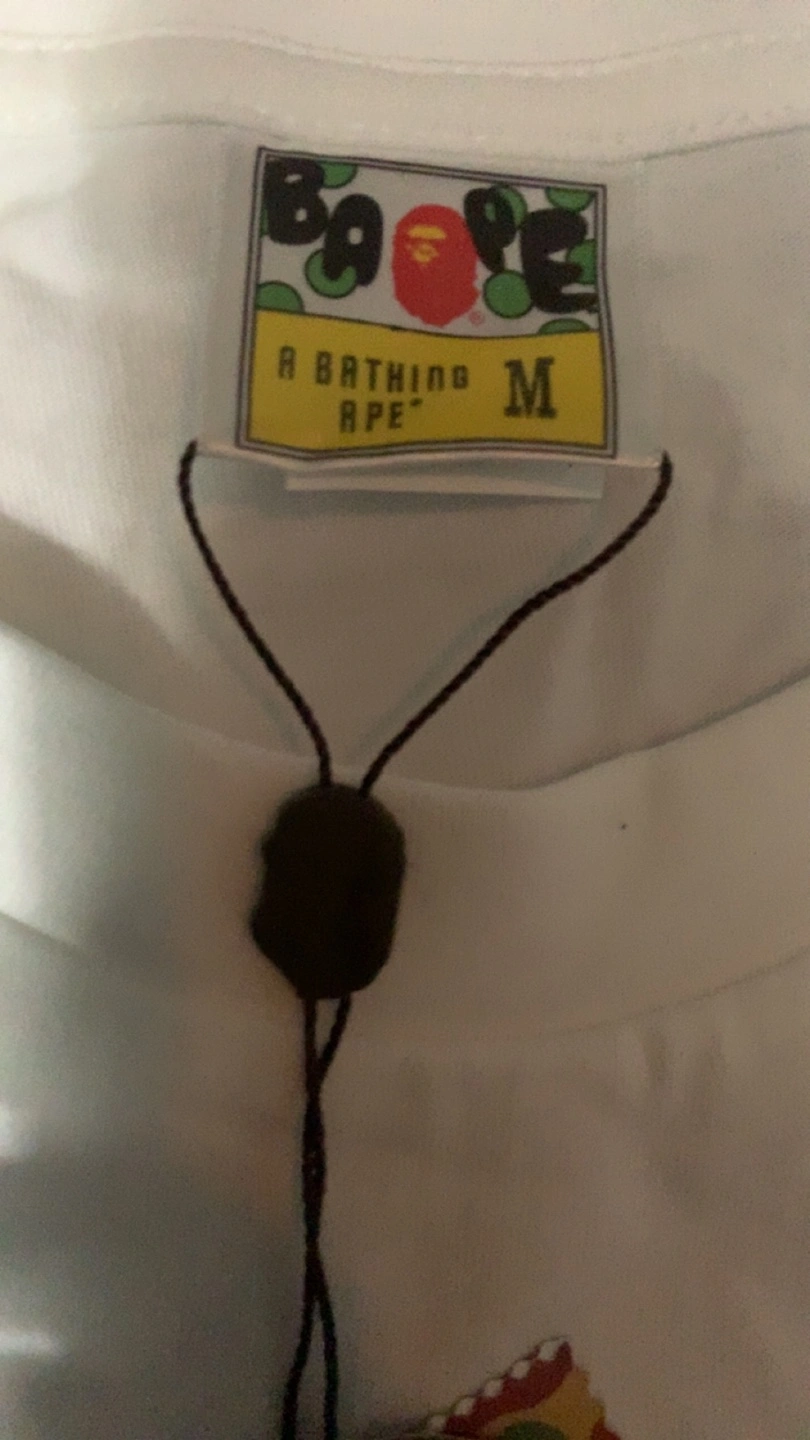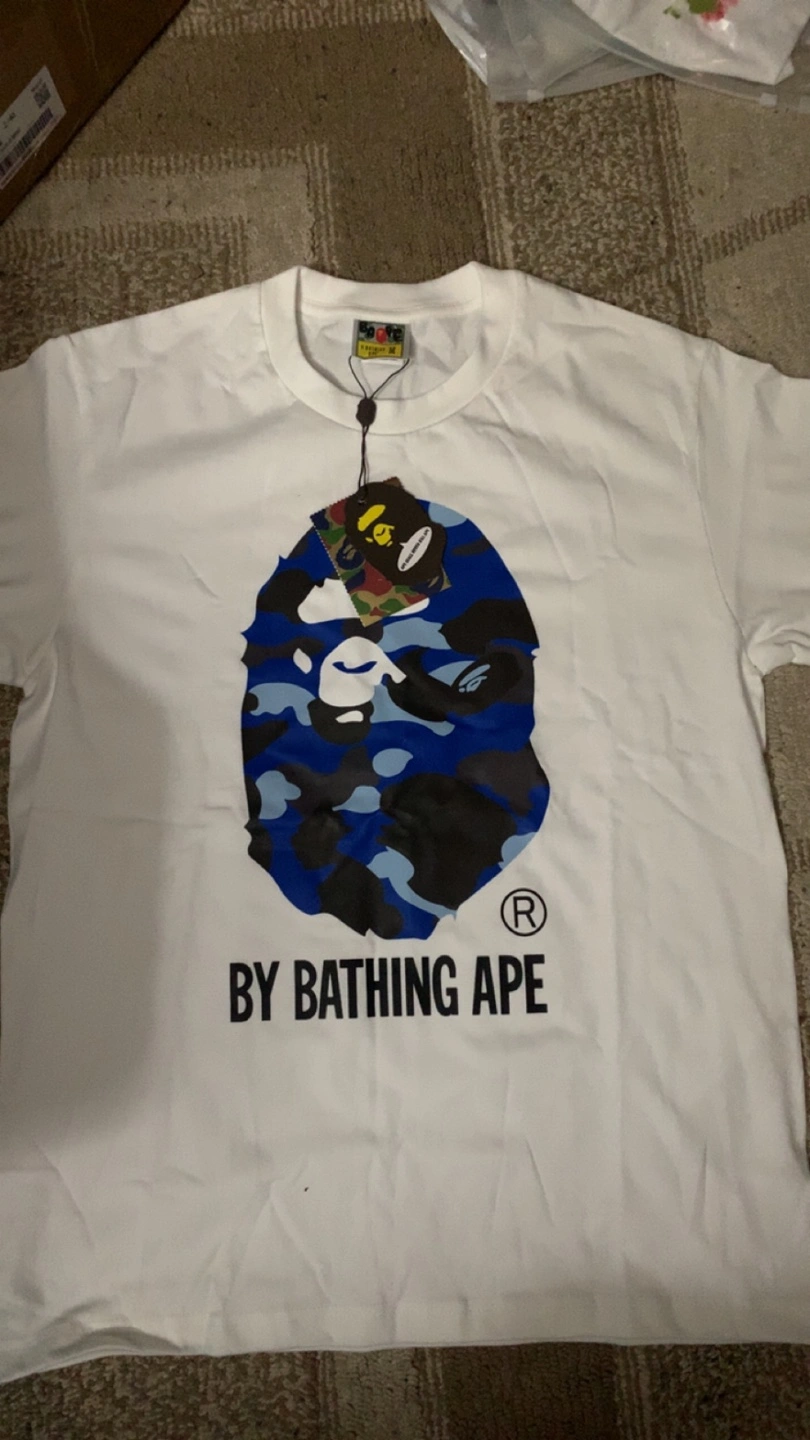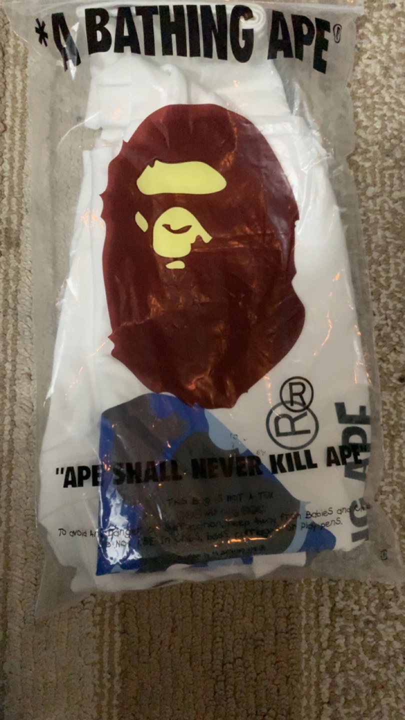 Selling a Bathing Ape T-shirt in size medium. It's white with a blue camo ape graphic on the front. It's still in the original packaging!