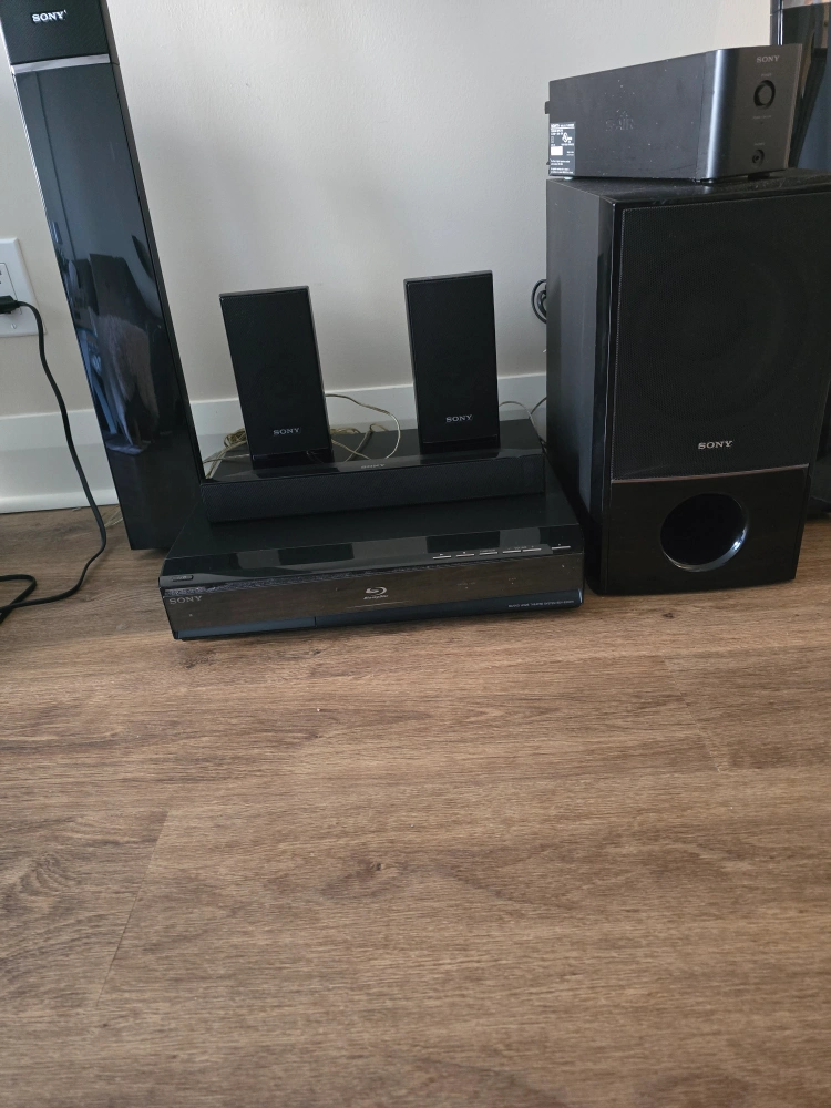 Selling a Sony home theatre system in good condition. Includes two tall speakers, two smaller speakers, a subwoofer, and a Blu-ray player. Perfect for setting up a great sound system for your home! Extremely loud! pick up only Cash only see my other posts