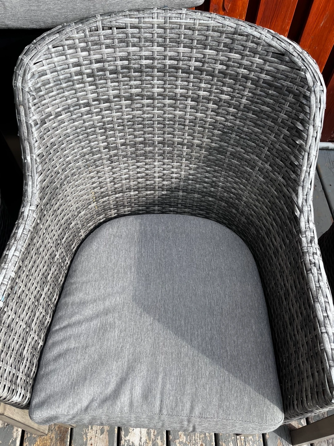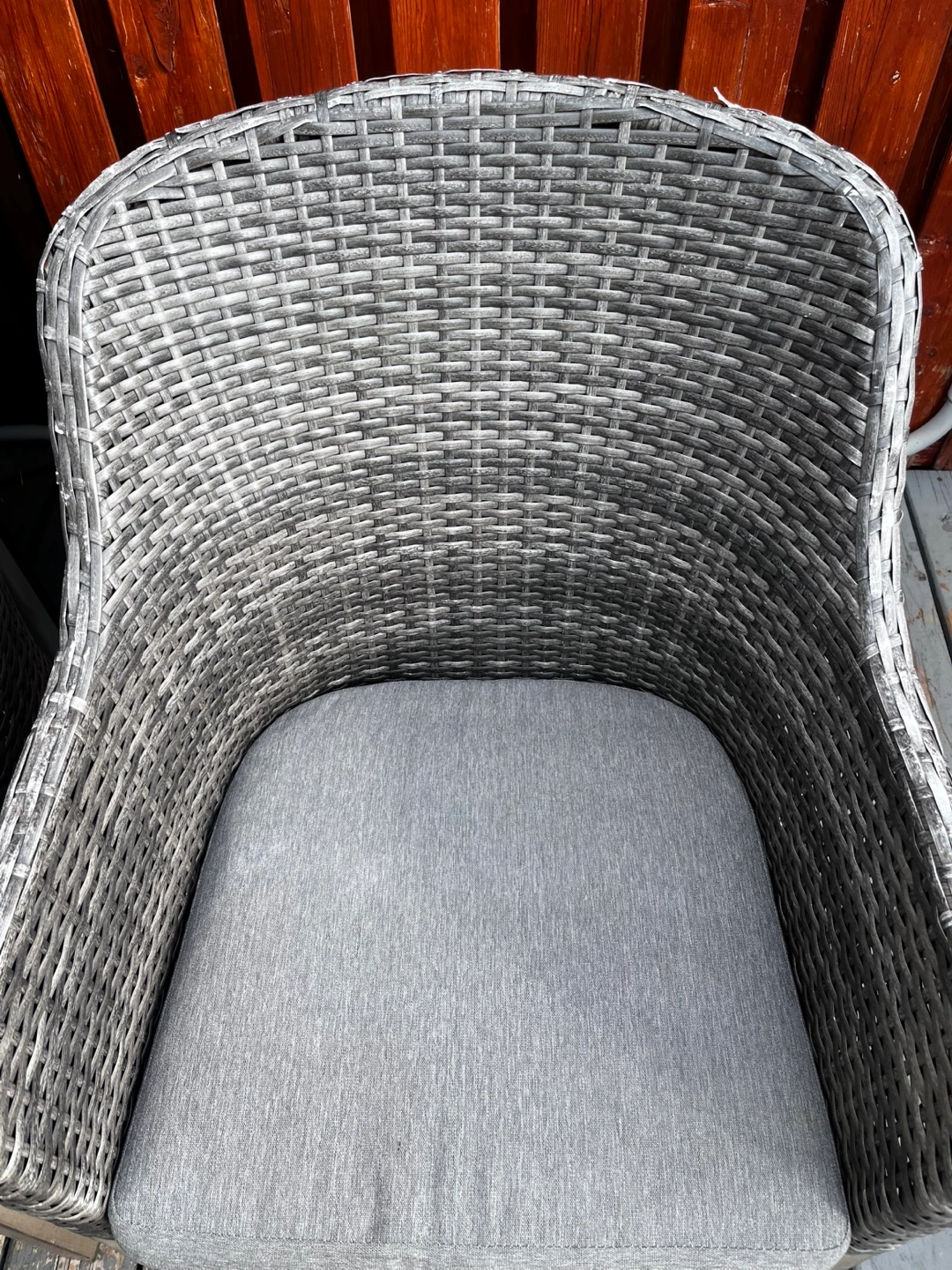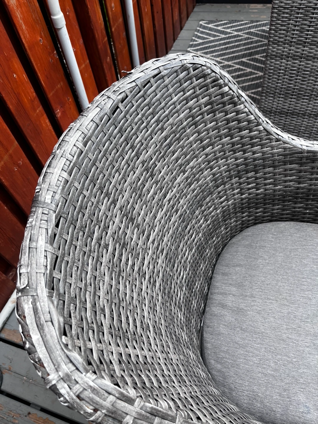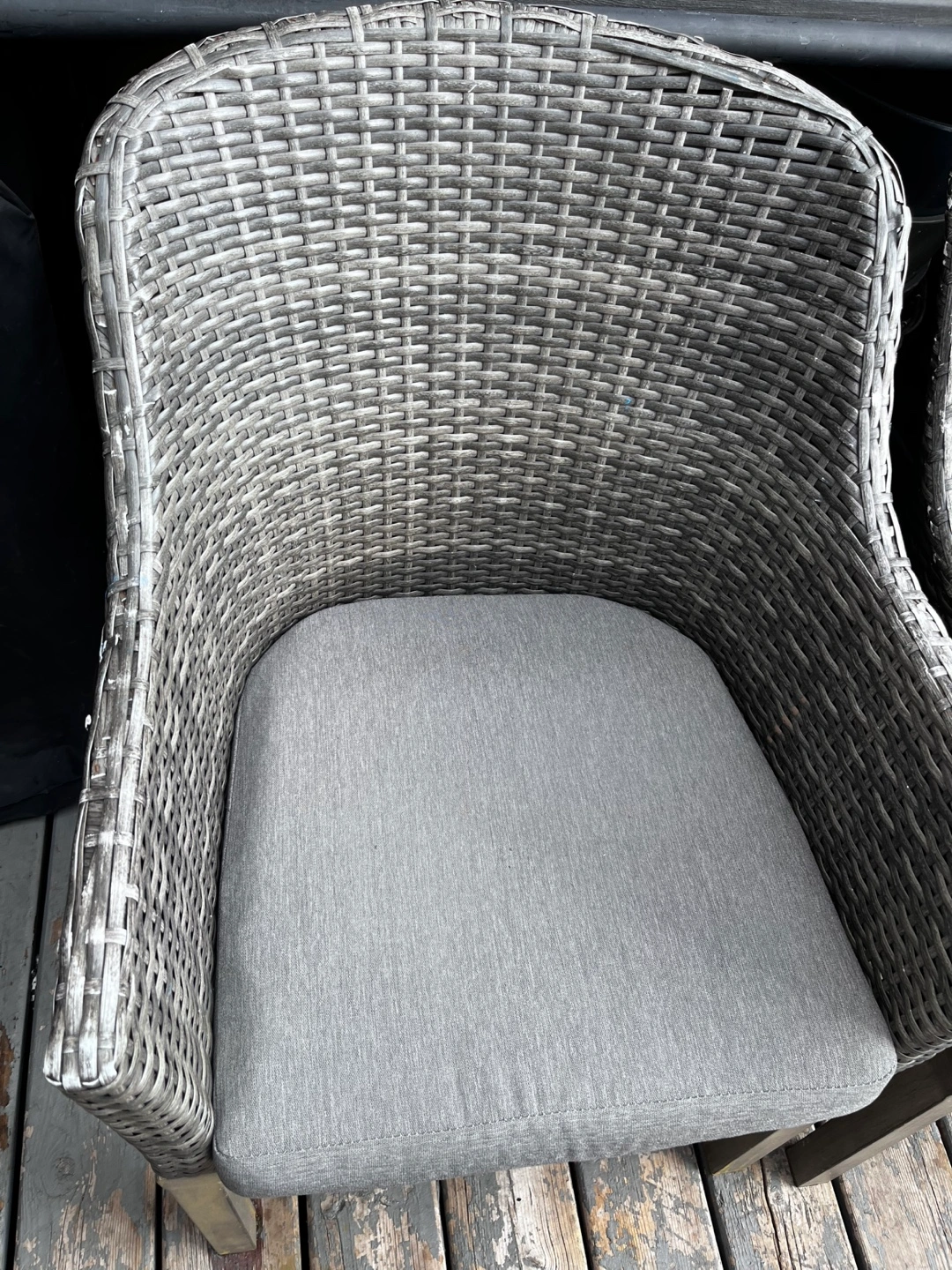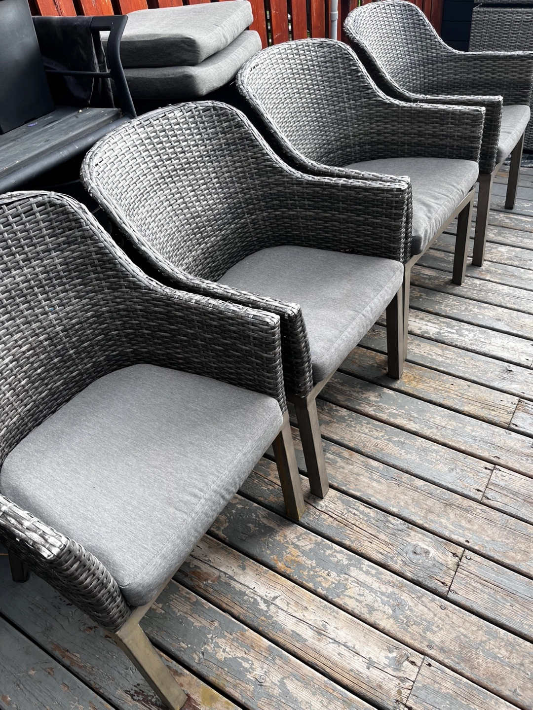 Set of four wicker patio chairs with grey cushions. They're in great shape and ready to add some style to your outdoor space! Measures at 23” W x 20”D x x 19”H (seat) x 34”H (back rest) Pick up only. Closest intersection is Jane St and Eglinton ave Willing to sell separately. $50 each chair.