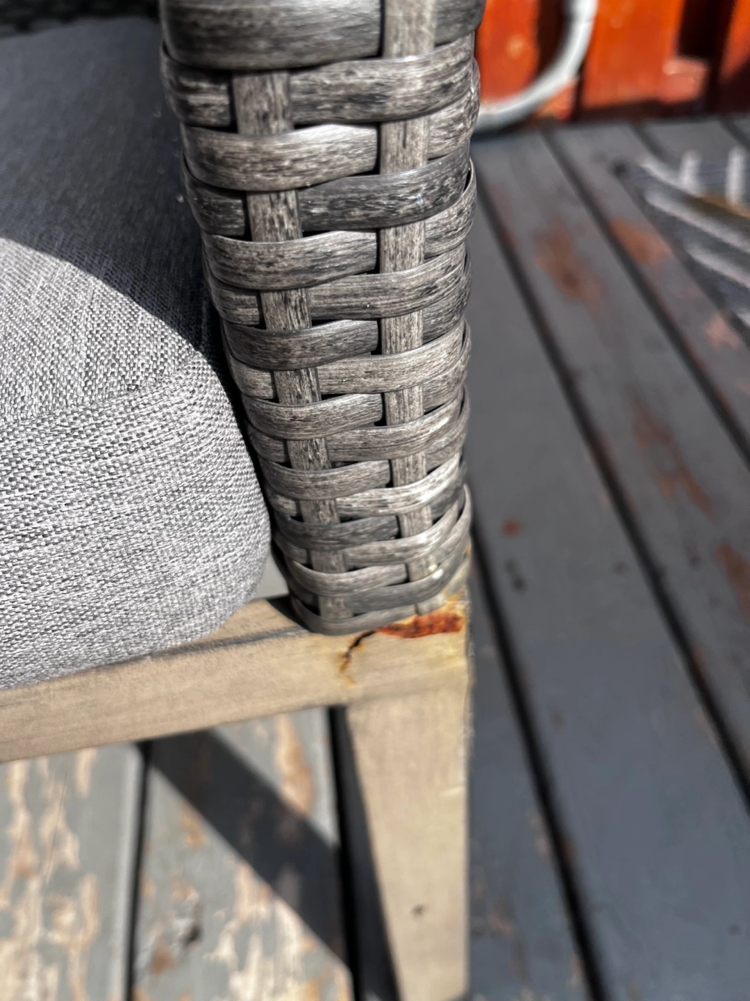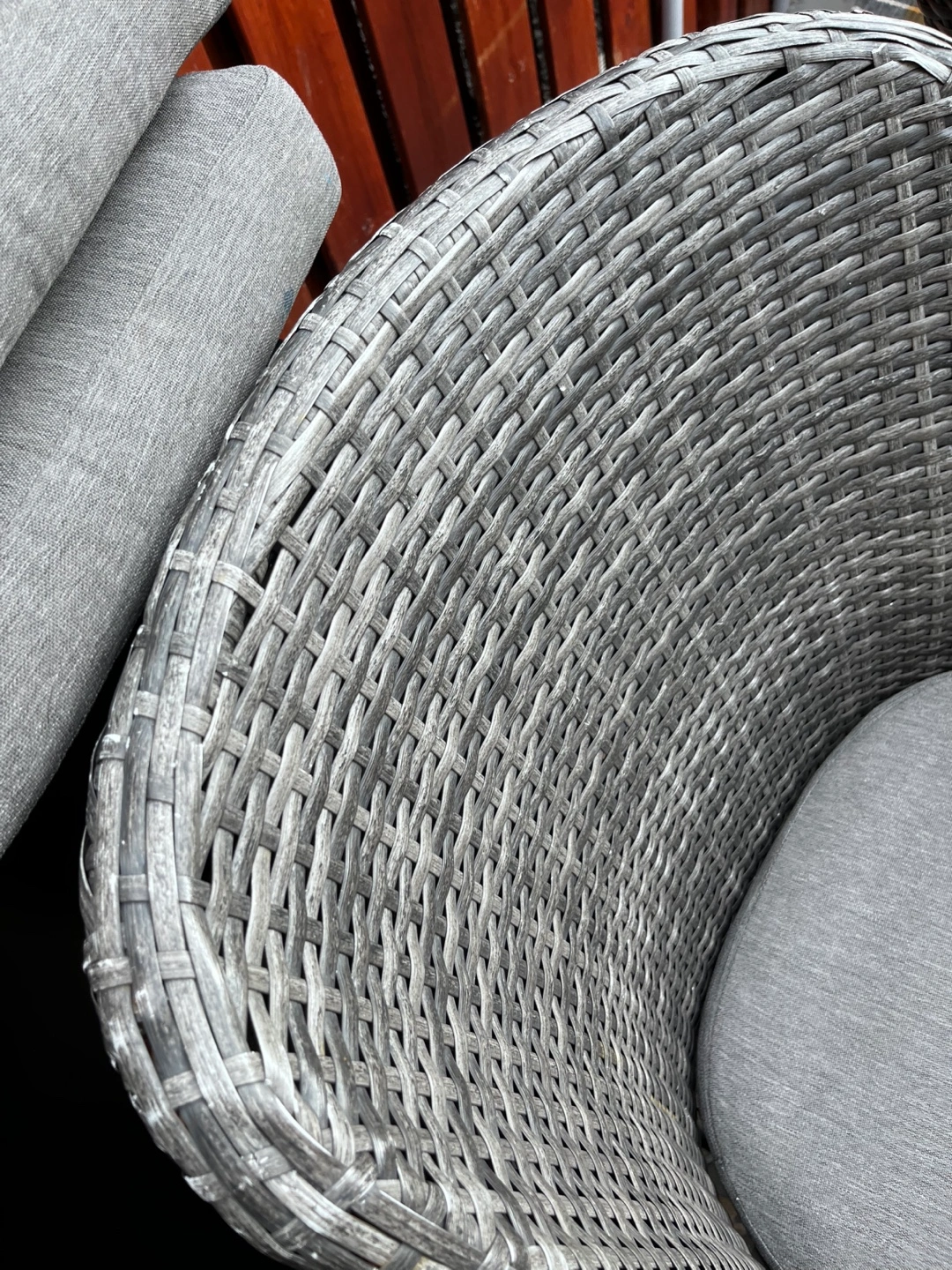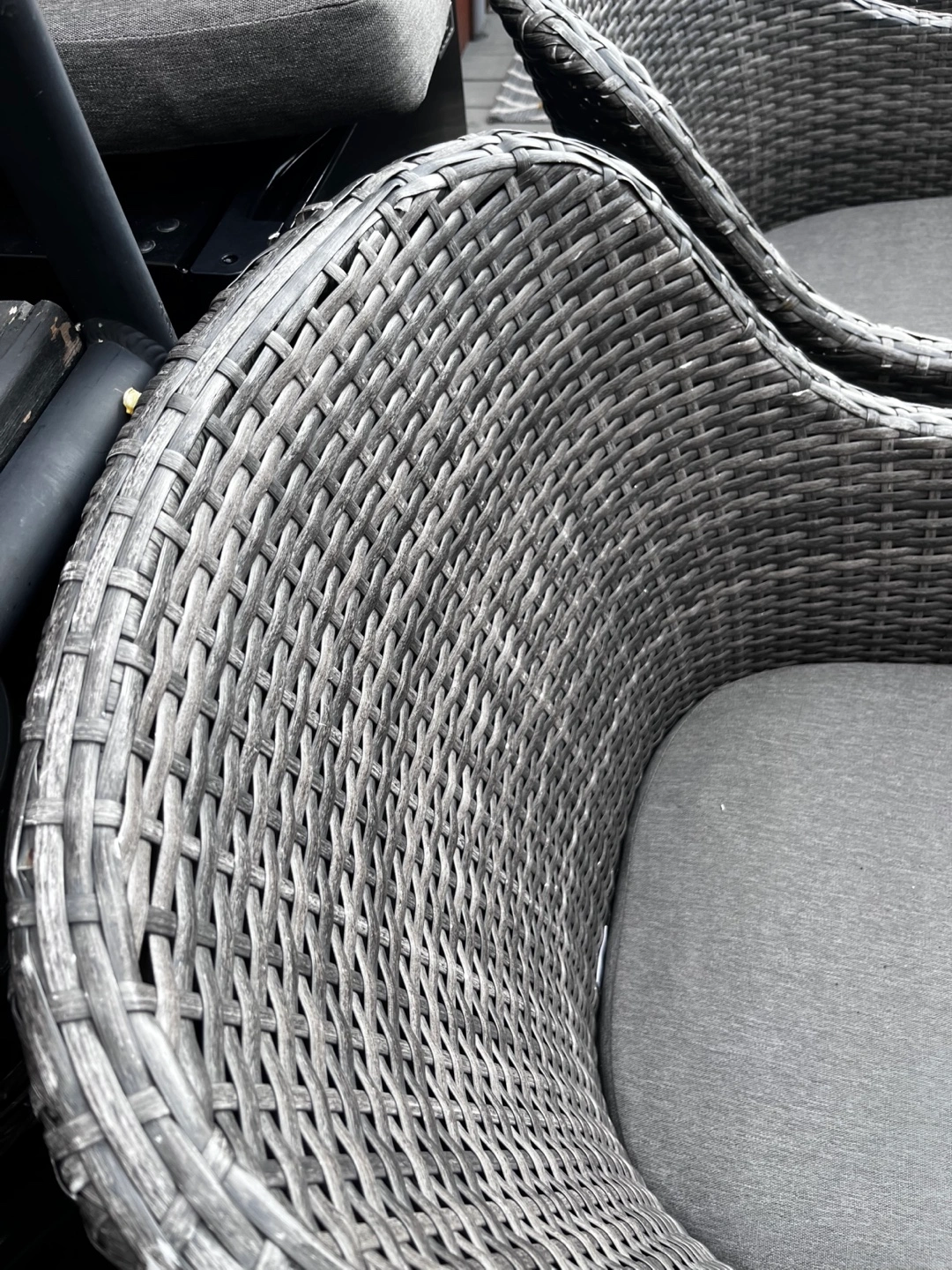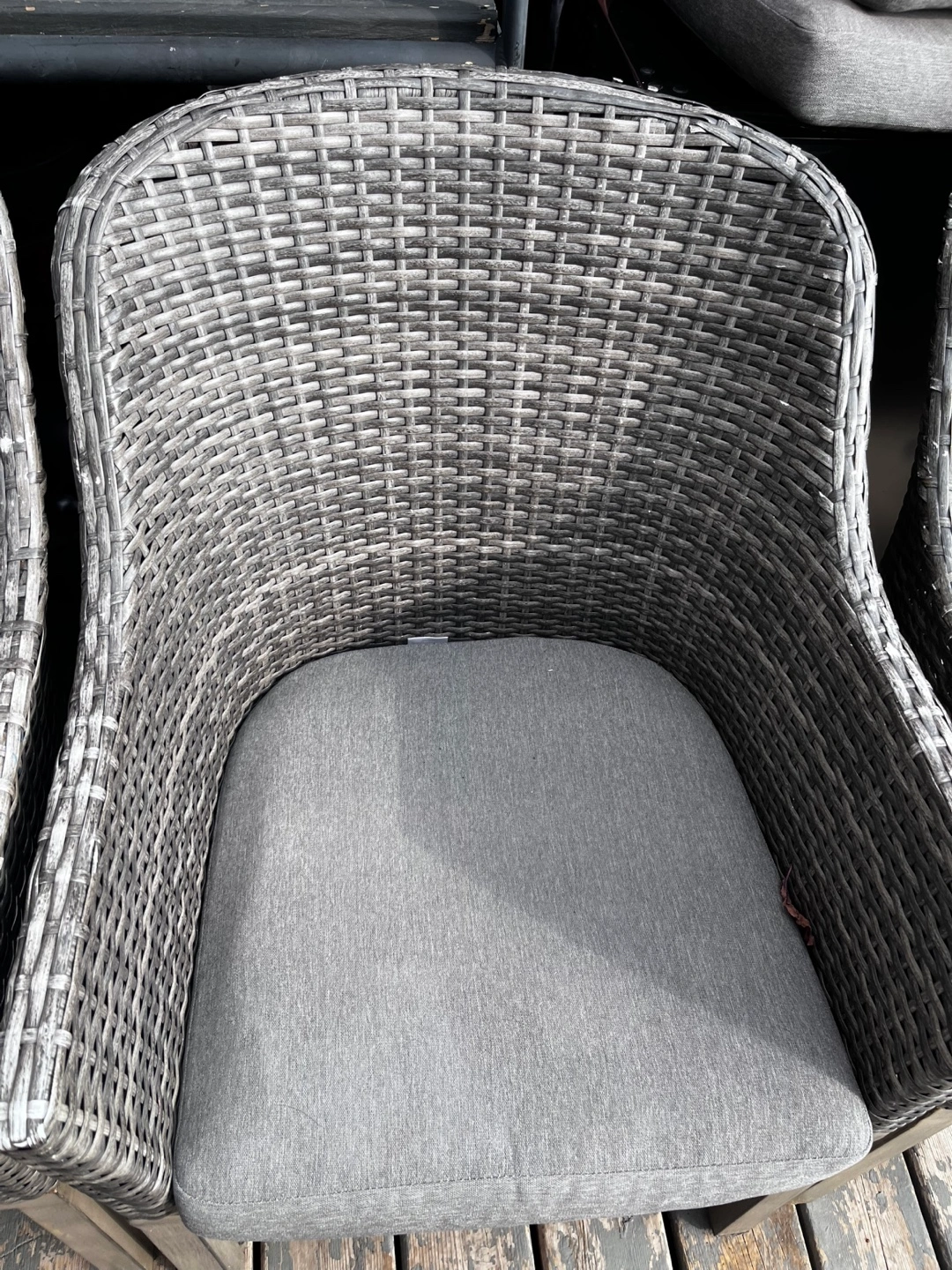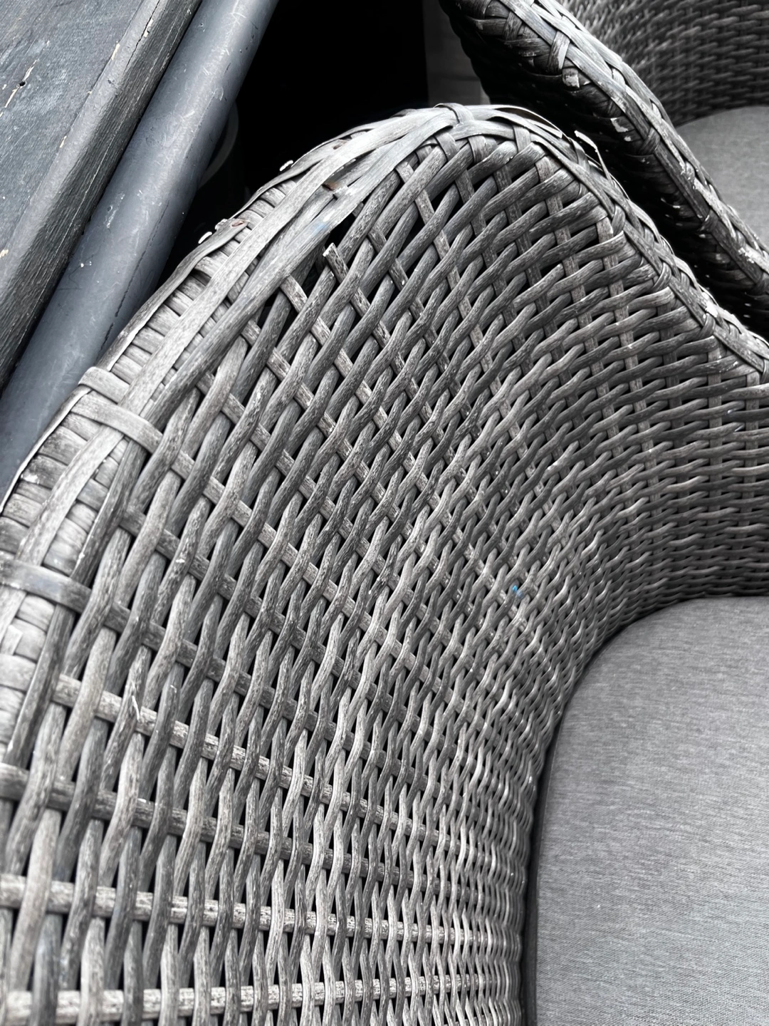 Set of four wicker patio chairs with grey cushions. They're in great shape and ready to add some style to your outdoor space! Measures at 23” W x 20”D x x 19”H (seat) x 34”H (back rest) Pick up only. Closest intersection is Jane St and Eglinton ave Willing to sell separately. $50 each chair.