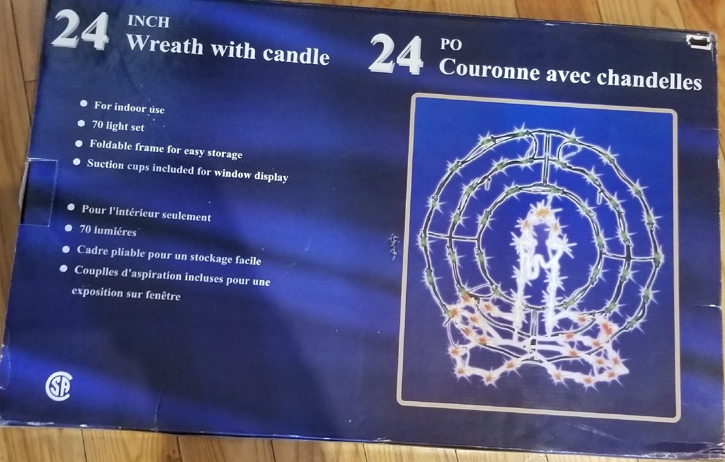 Selling a brand new, in-box 24-inch wreath with candle! It's perfect for indoor use and comes with a 70 light set. The foldable frame makes for easy storage, and suction cups are included for window display