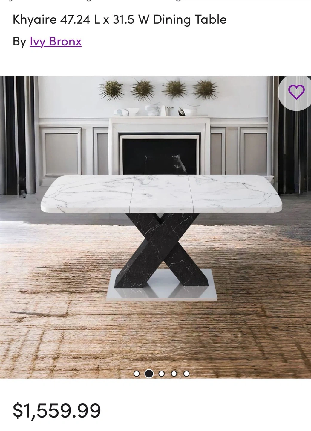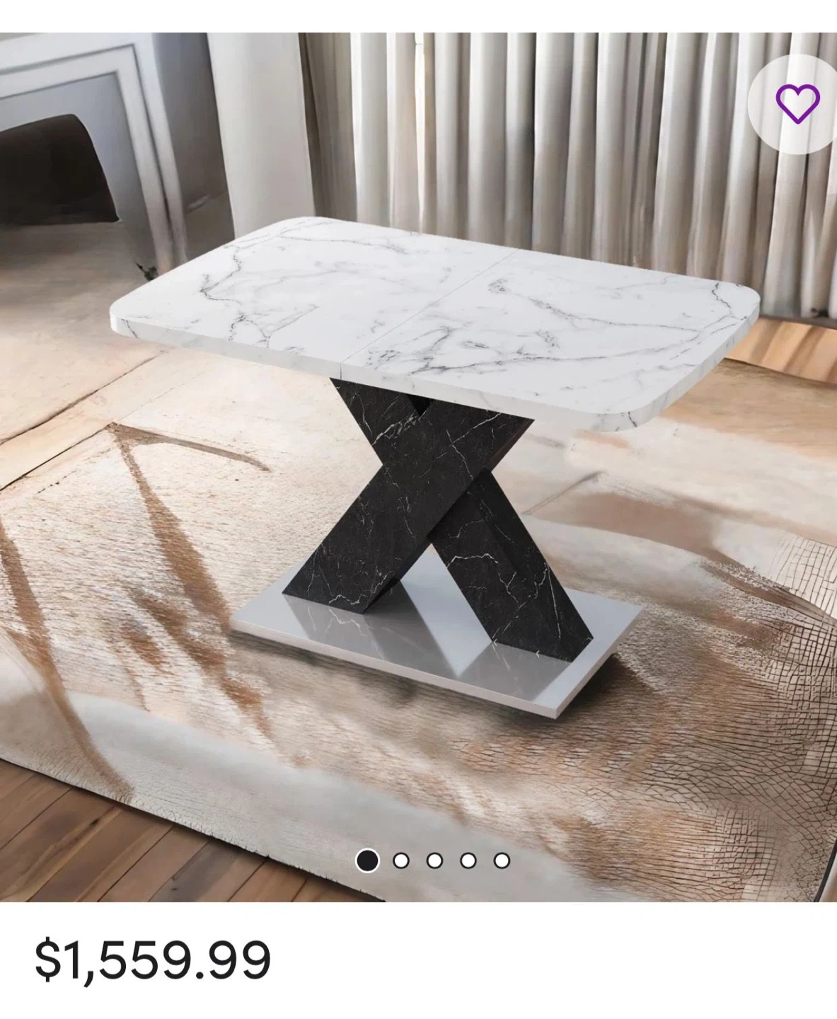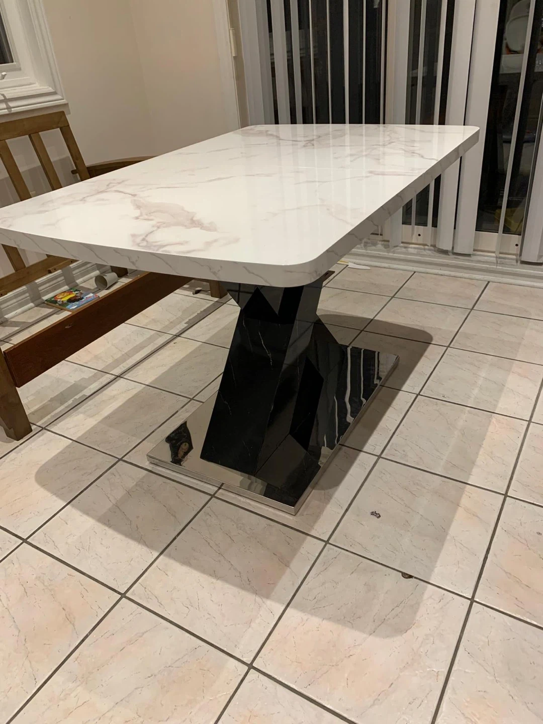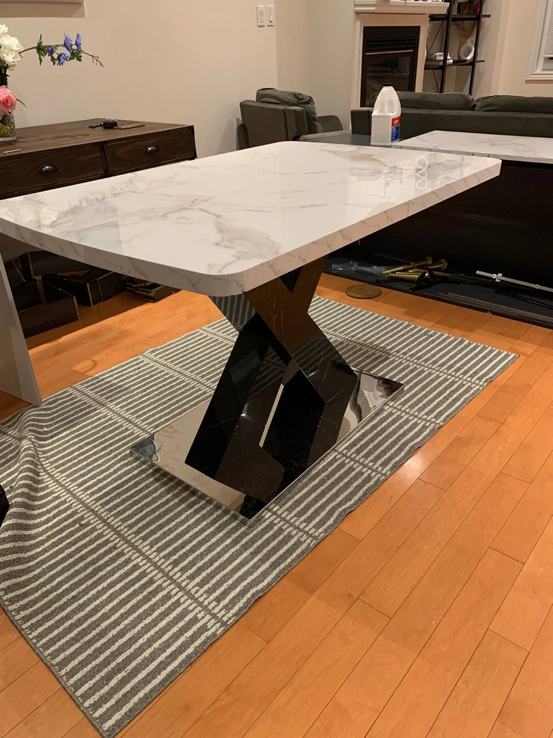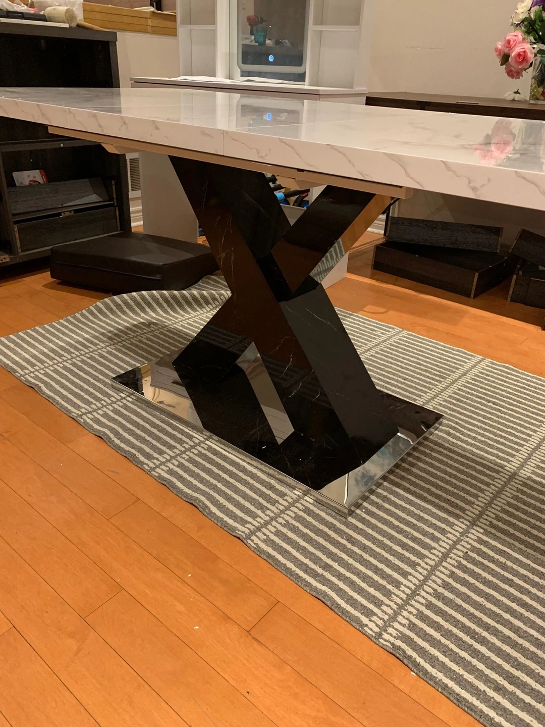 Selling an Ivy Bronx Khyaire dining table! It features a stylish marble top and a striking black X-shaped base. The dimensions are 47.24" L x 31.5" W when compact, and it extends to 62.99" in length. A beautiful addition to any dining space! I am doing staging so I used it for it. And after finish the staging I am using inside the house. It’s almost new 🙂