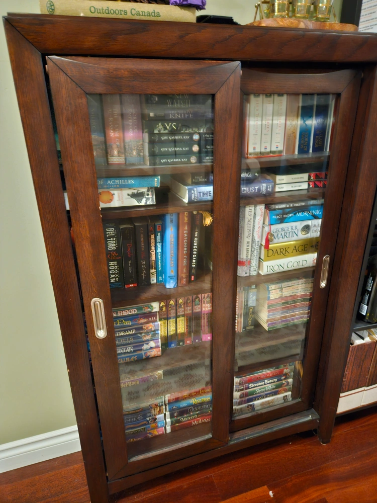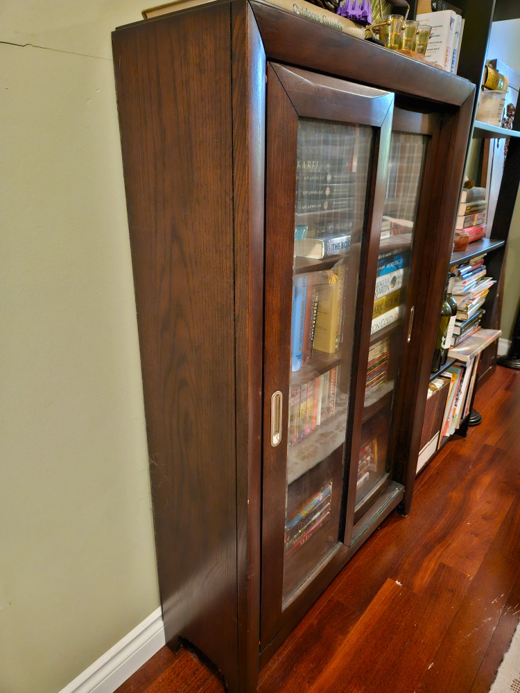 Originally a DVD case and now repurposed to a bookshelf and display case. Narrow for hallways or smaller spaces. This is a lovely wooden display cabinet, perfect for showcasing your favourite books or collectibles! It has glass doors to keep everything dust-free and looking great. The rich, dark wood finish adds a touch of elegance to any room. It's in great condition and ready for a new home