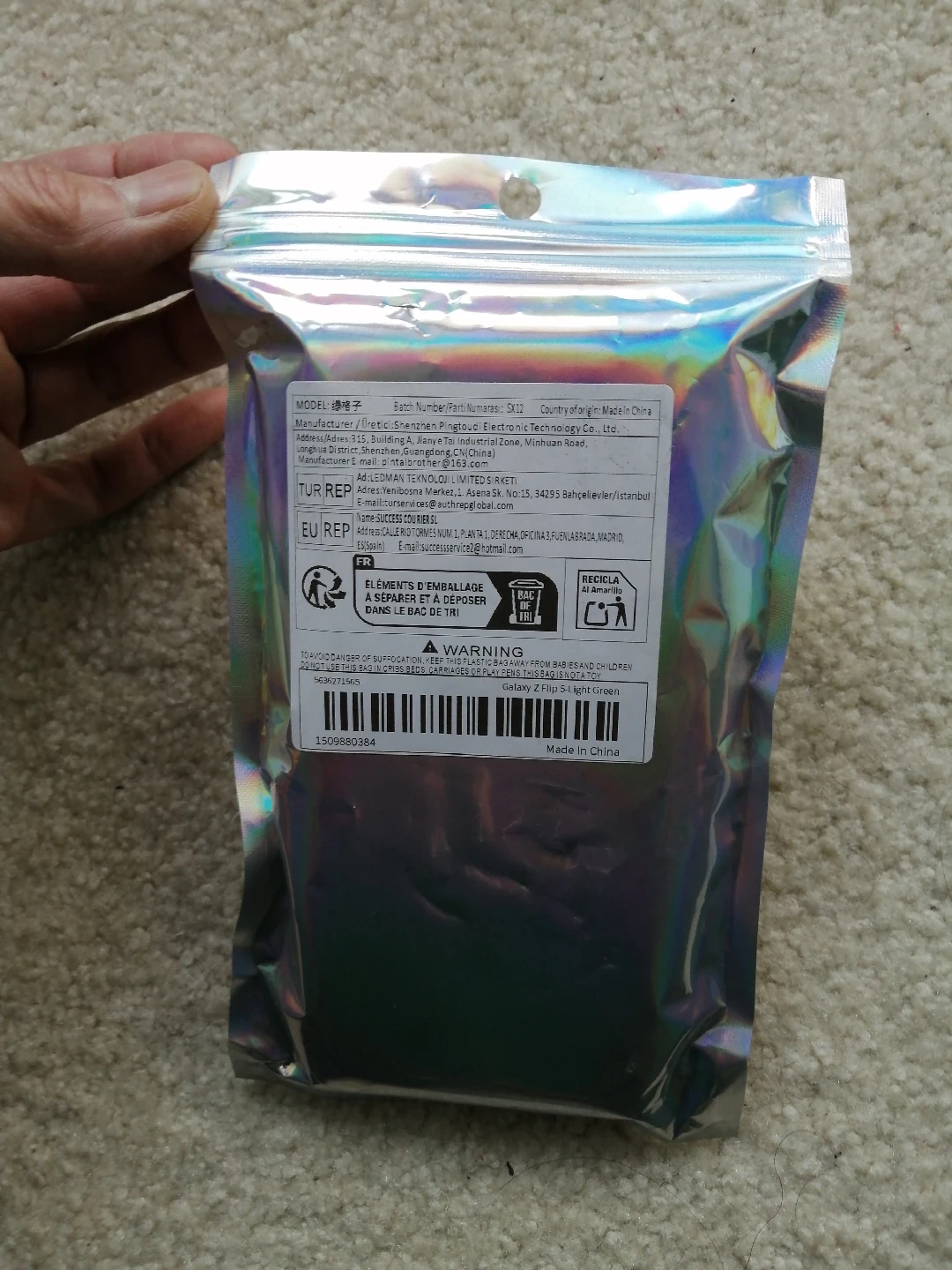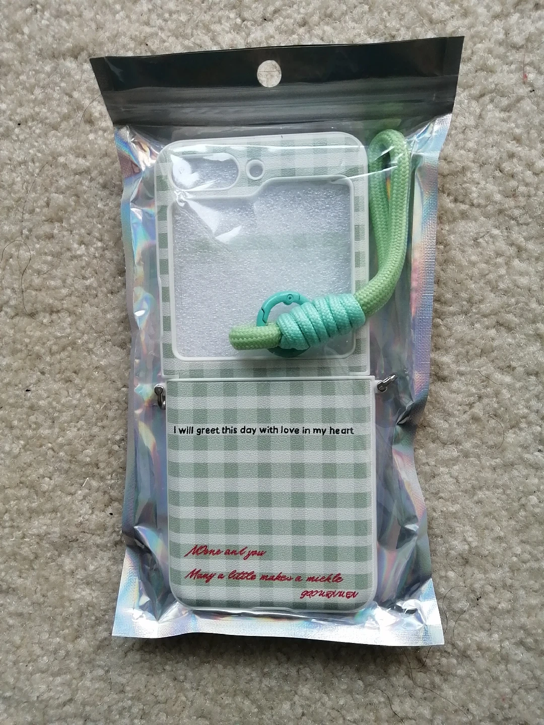 This is a cute Samsung Flip 5 case with a green gingham pattern. It comes with a matching strap, perfect for keeping your phone secure and accessible. The case is still in its original packaging and has never been used!