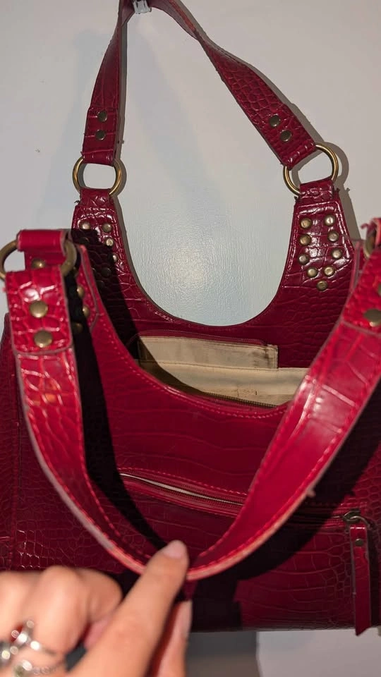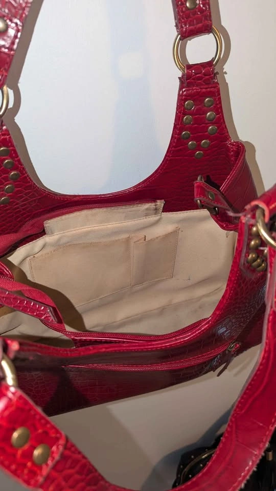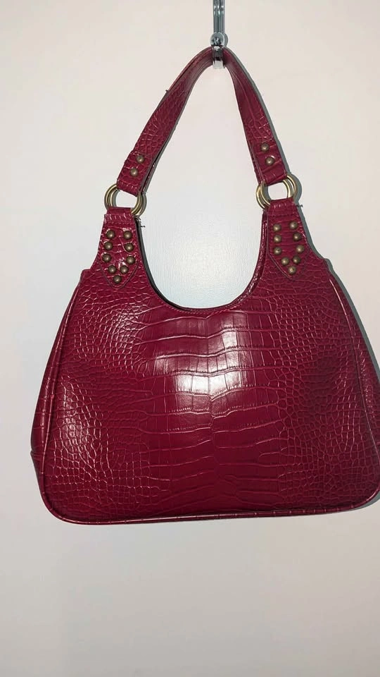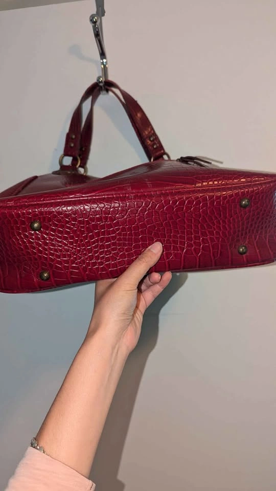 Good condition, gently used faux Crocodile Red Leather ladies handbag Good size! Looks sharp and clean from exterior, interior has some signs of wear but minimal.