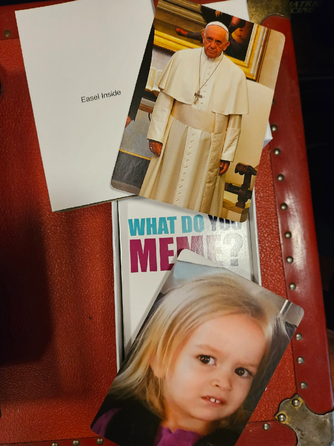 Selling a What Do You Meme? adult party game. It's perfect for meme-lovers! Includes cards and easel inside