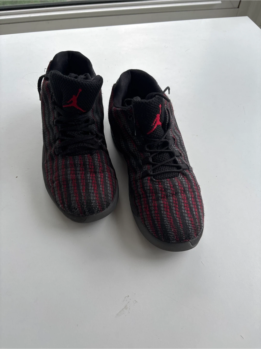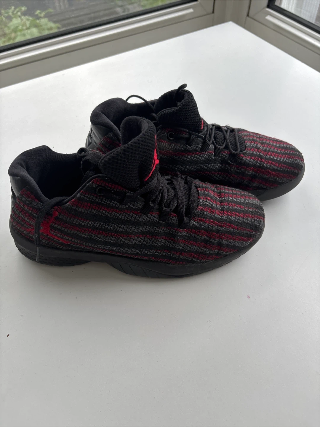 Selling a pair of Jordan Trainer 2 Flyknit shoes in kids size 2.5 They feature a black and red colourway with the iconic Jordan logo. These shoes are great for training or casual wear, and the Flyknit material makes them lightweight and comfortable. They are in good condition with some signs of wear on the soles.