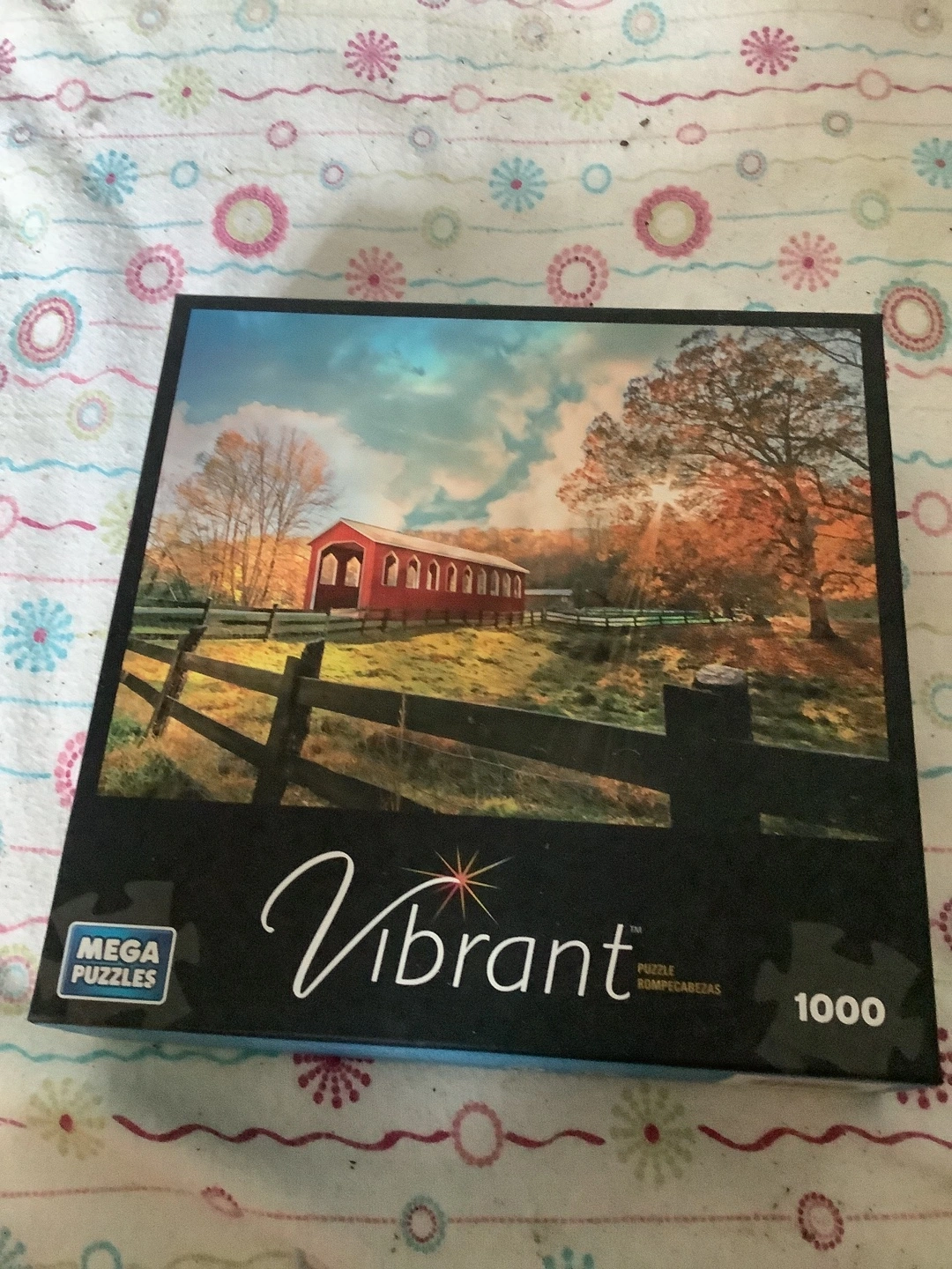 Selling a Vibrant puzzle with 1000 pieces! It looks like a beautiful landscape scene with a covered bridge. Perfect for puzzle enthusiasts!
