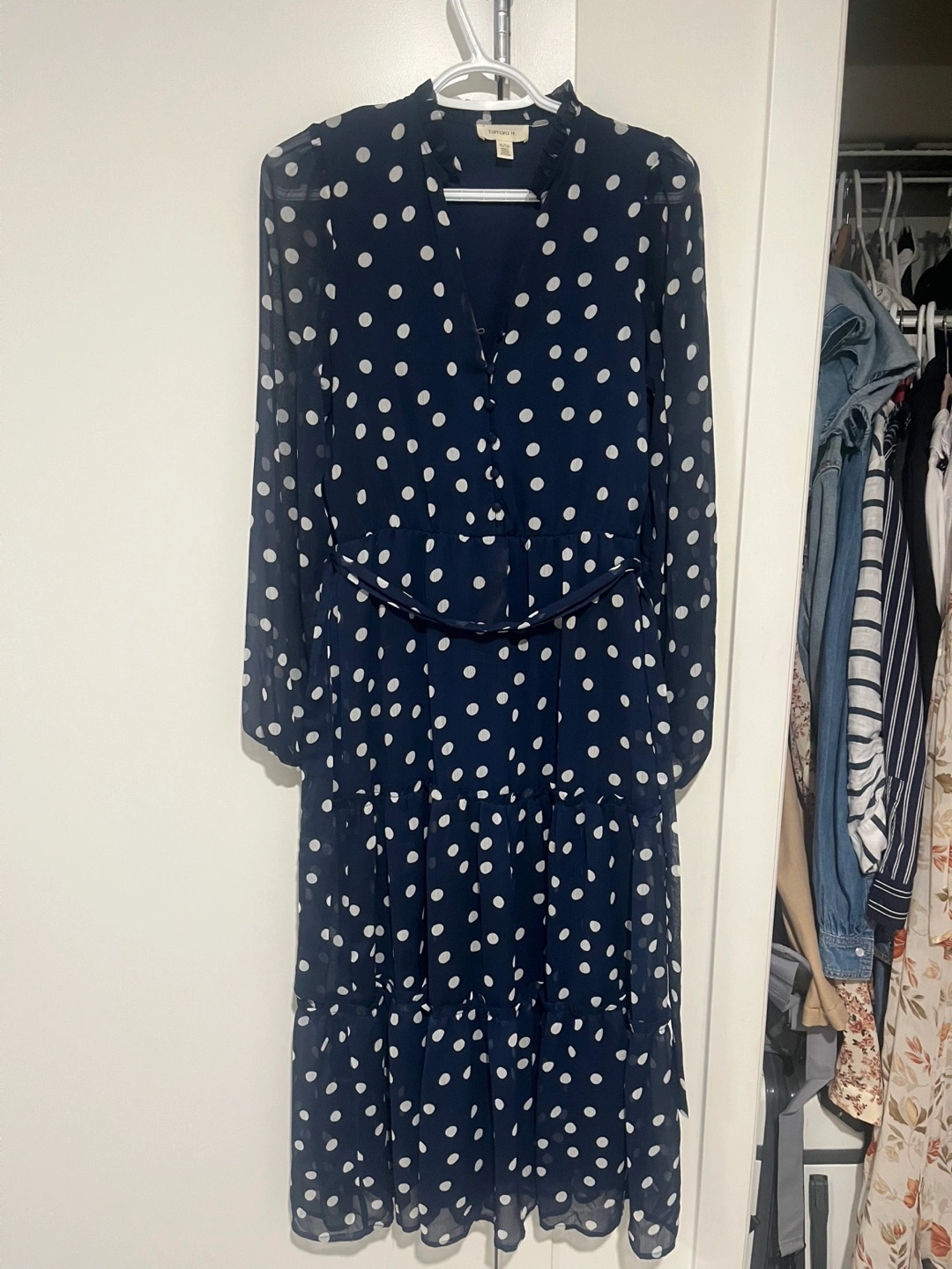 This is a lovely Somoro N.Y. dress with a navy background and white polka dots The dress features long sleeves and a flattering silhouette Perfect for a variety of occasions, from casual outings to more dressed-up events It's in great condition and ready for a new home Bought from winners size XS