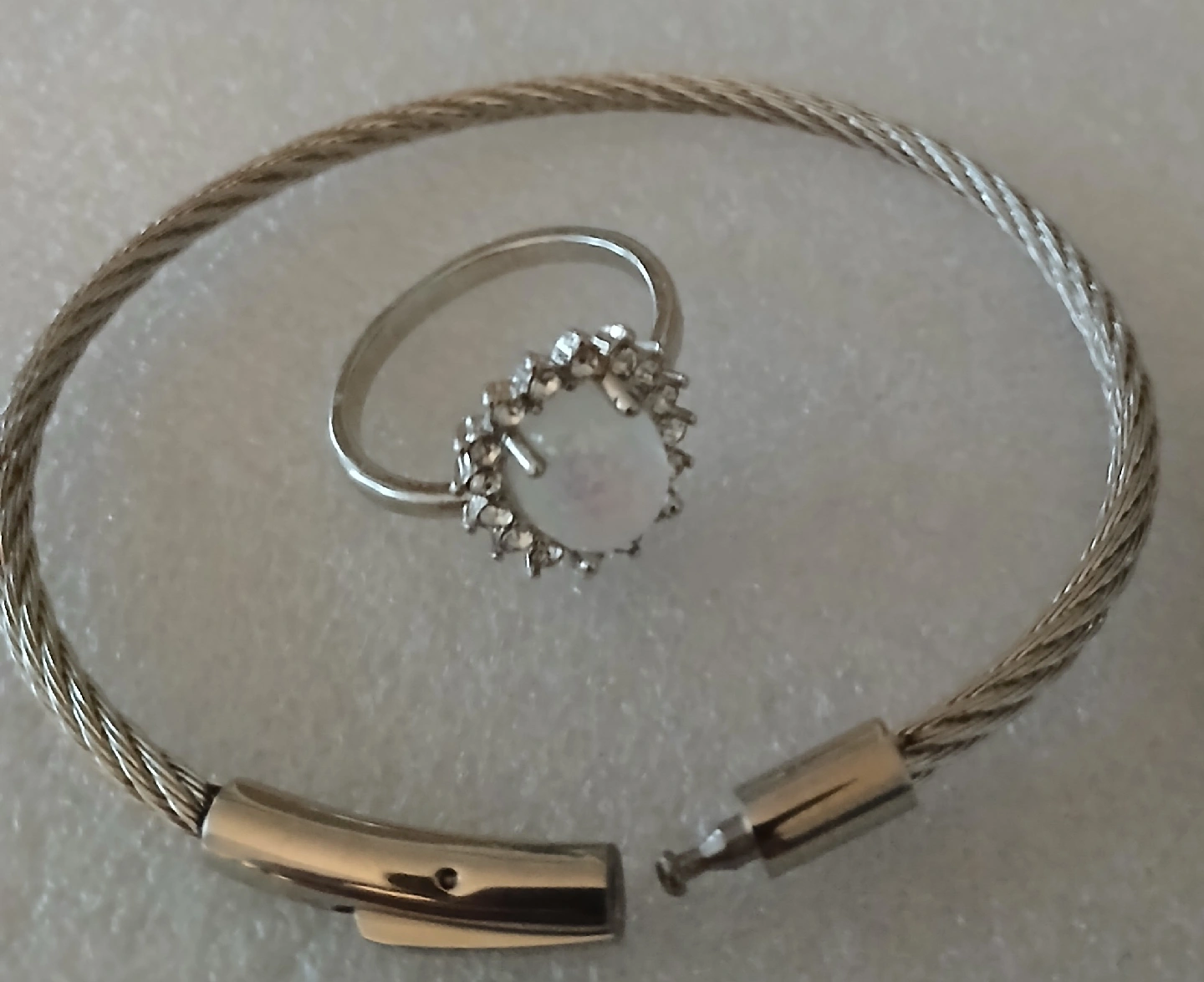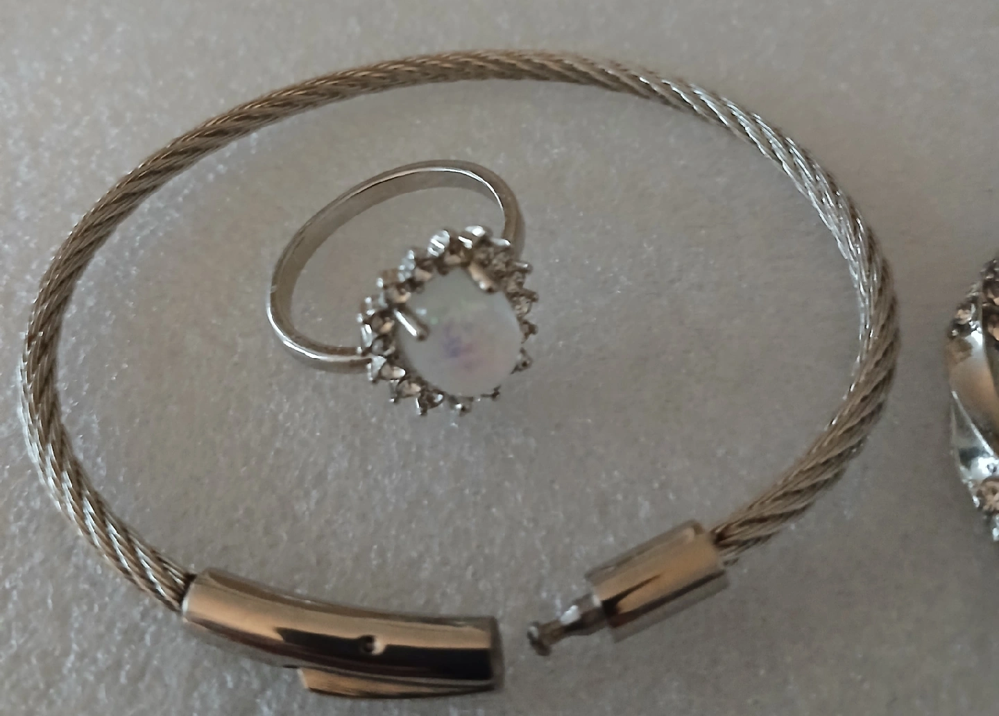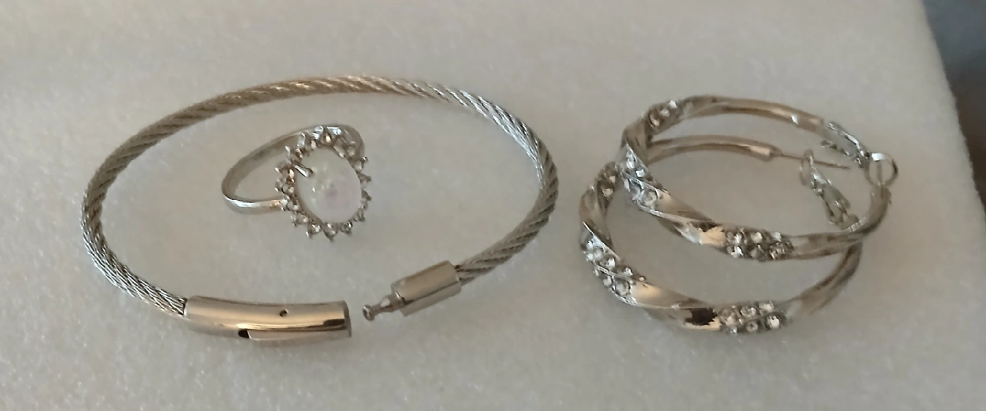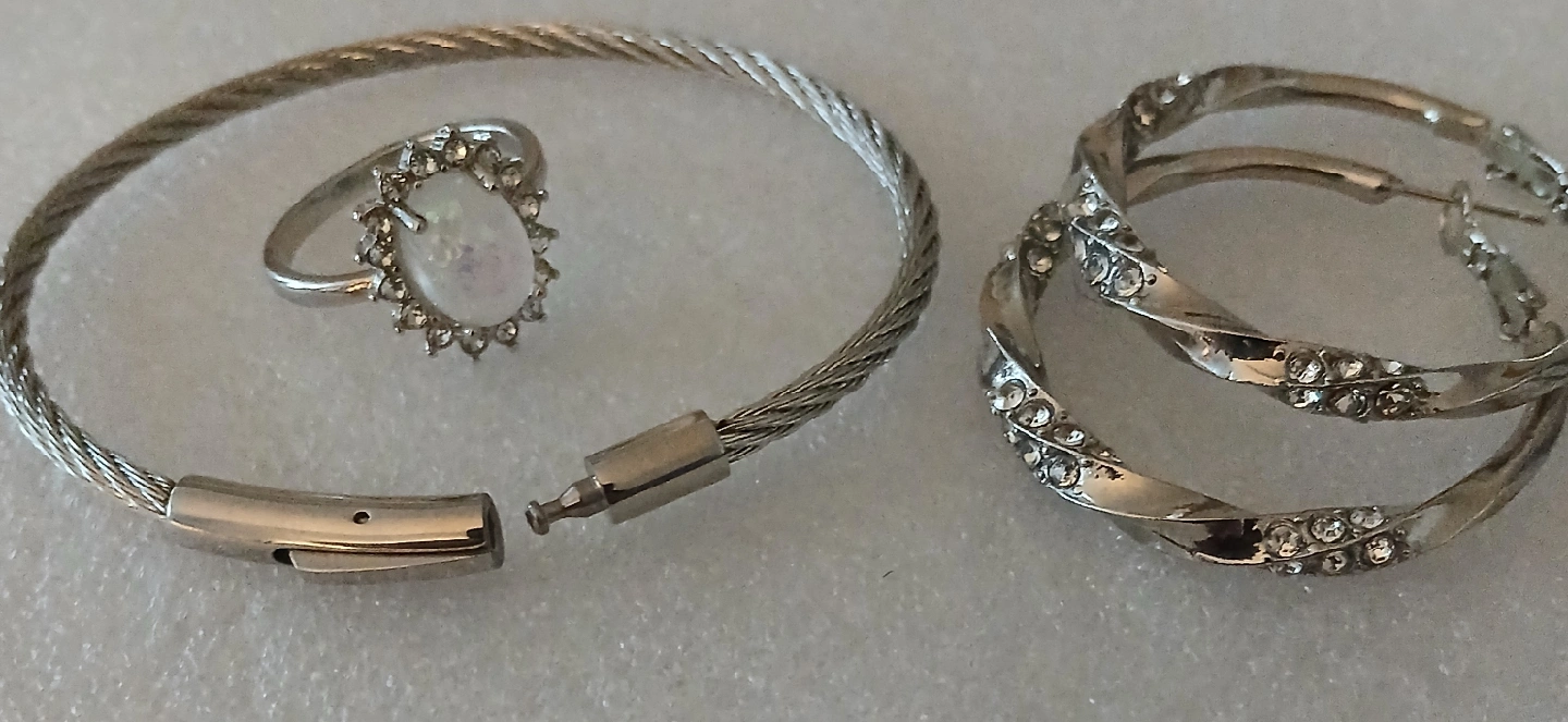 Selling a cute set of silver-tone jewelry! Includes a ring with a faux opal and rhinestone surround, a cable bracelet with a magnetic clasp, and a pair of twisted hoop earrings covered in rhinestones. check out other listings to save and bundle