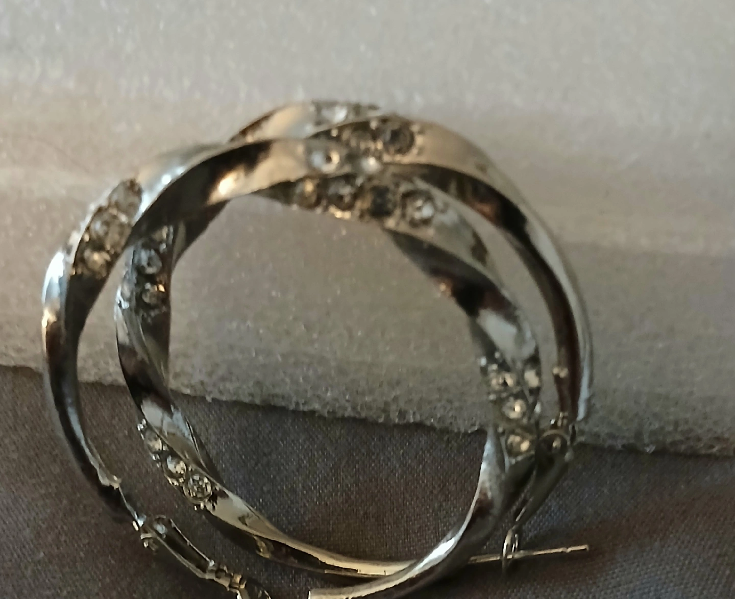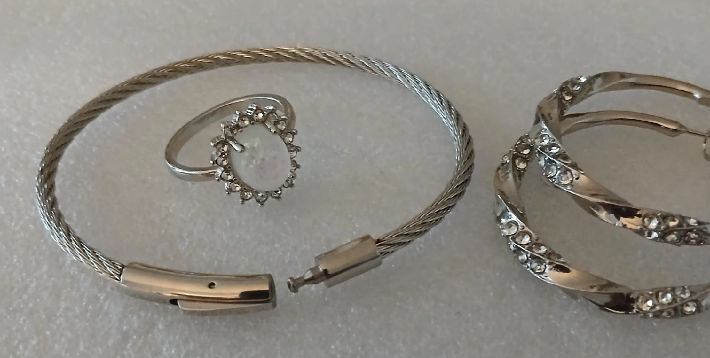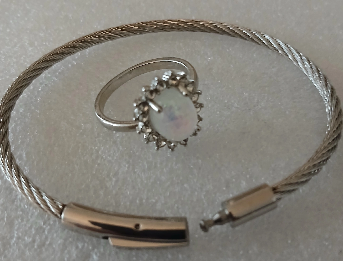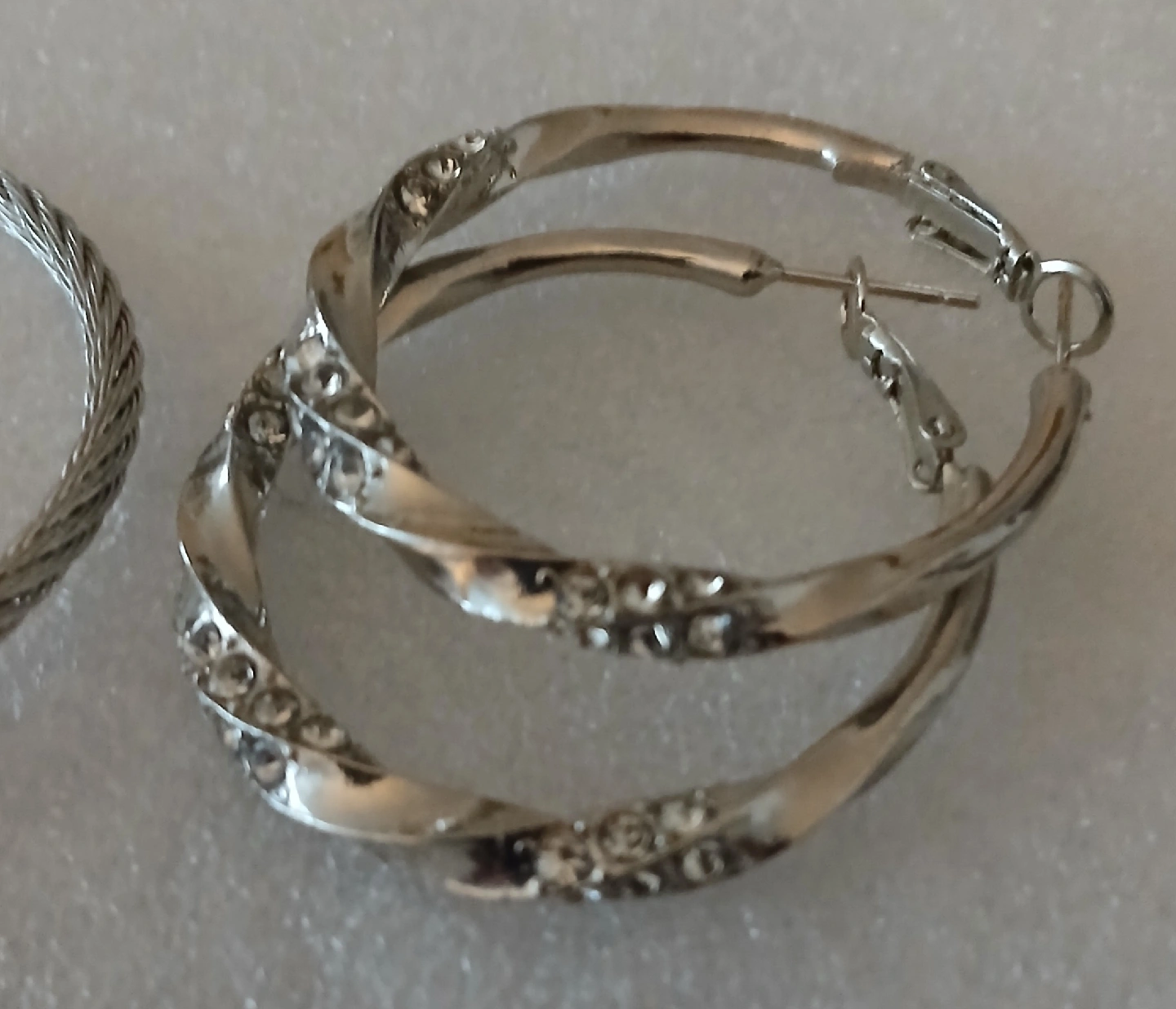 Selling a cute set of silver-tone jewelry! Includes a ring with a faux opal and rhinestone surround, a cable bracelet with a magnetic clasp, and a pair of twisted hoop earrings covered in rhinestones. check out other listings to save and bundle