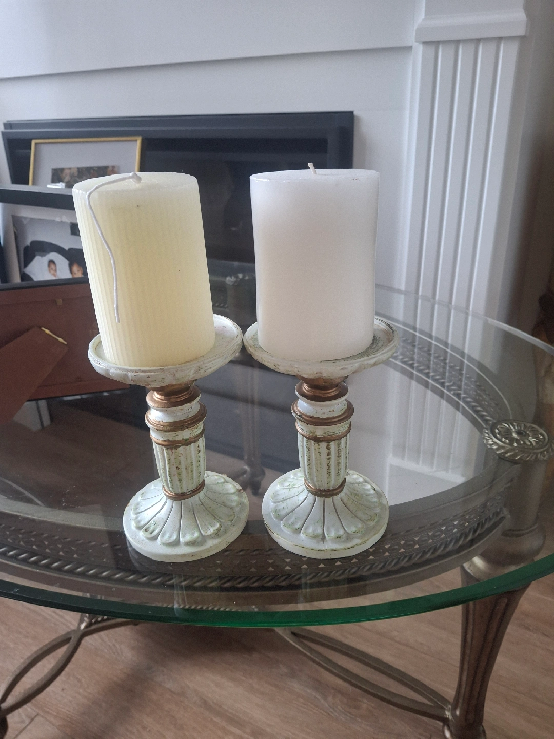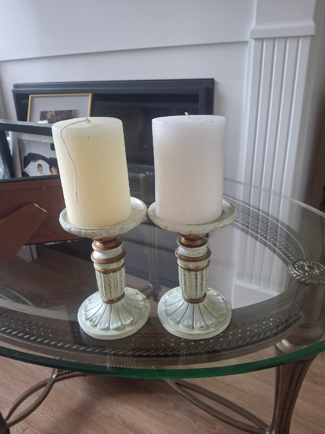 Selling a set of two candlestick holders! They have a lovely vintage look with a white and gold finish. Perfect for adding a touch of elegance to your home decor. They are in great condition and ready for a new home