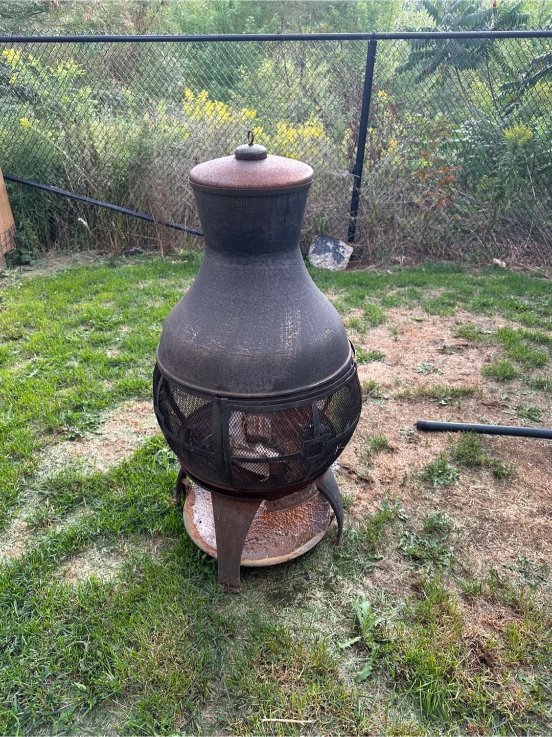 Outdoor chiminea fire pit in good condition. Perfect for backyard gatherings and cozy evenings. It has a mesh surround for safety and a sturdy base
